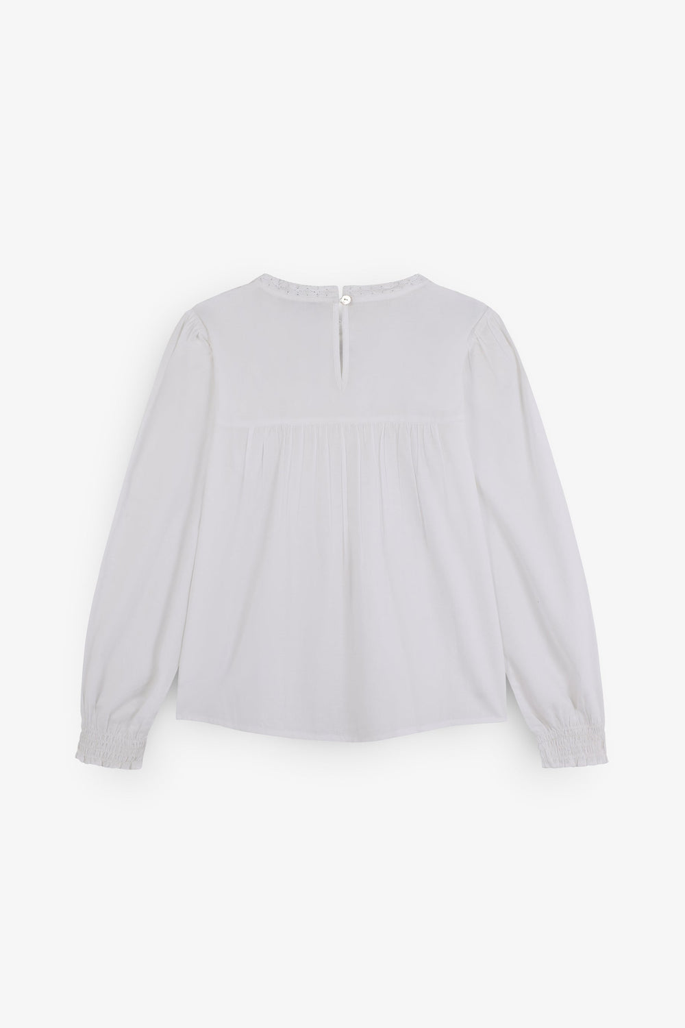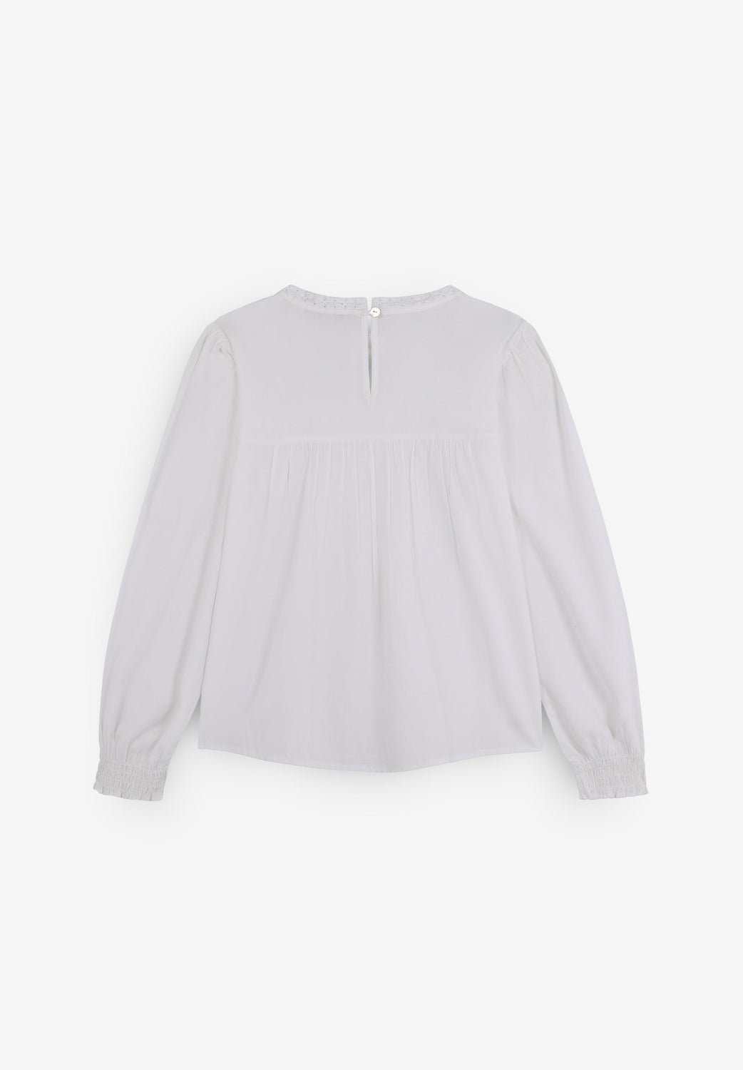 Blusa confeccionada en 100% algodón BCI. Regular fit. Cuello redondo. Manga larga abullonada terminada en elástico. Detalle metálico de calavera en cintura. Detalles bordados en cuello y frontal. Cierre trasero con botón.