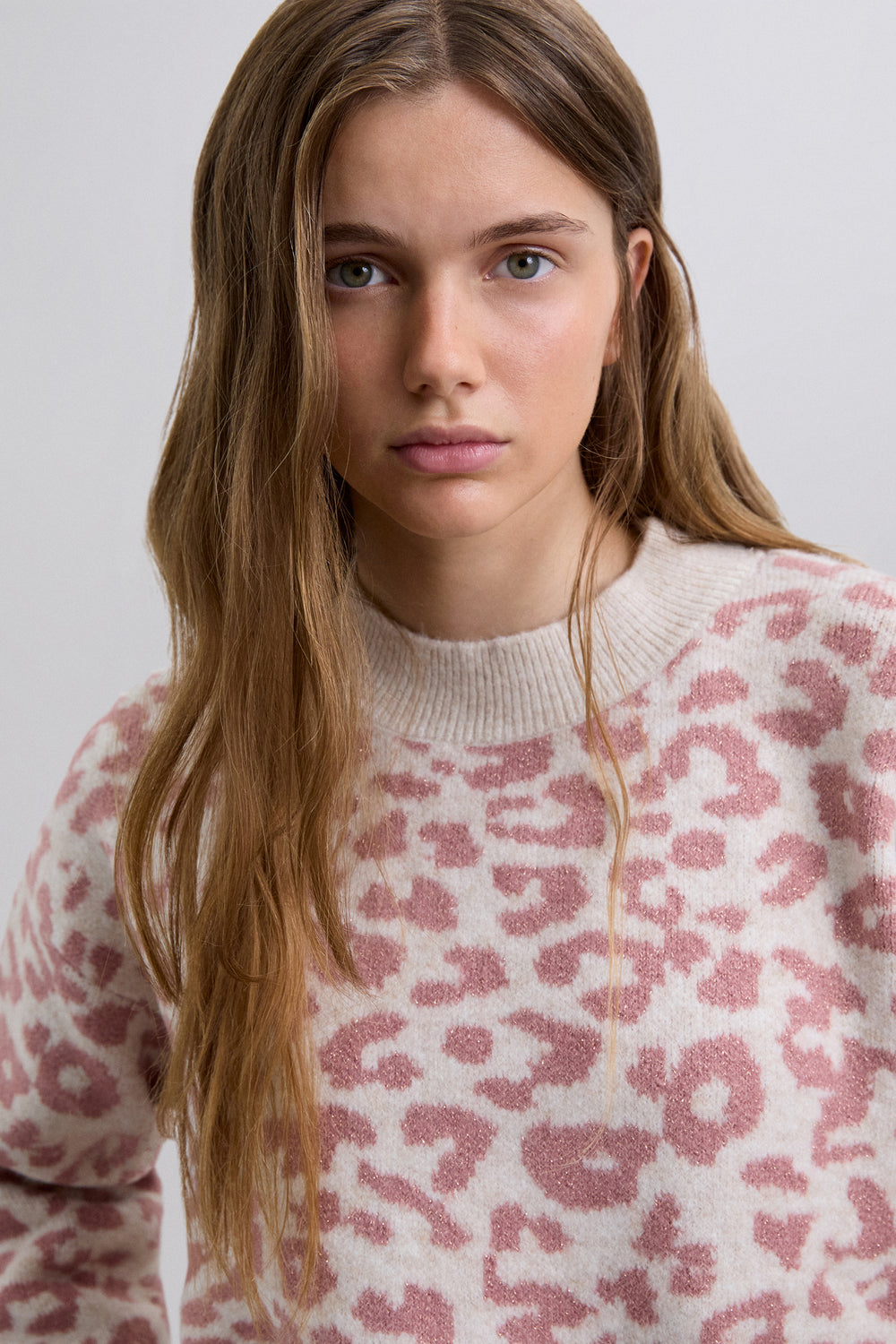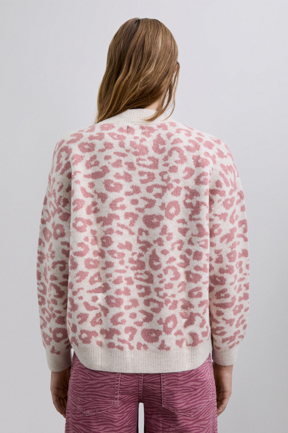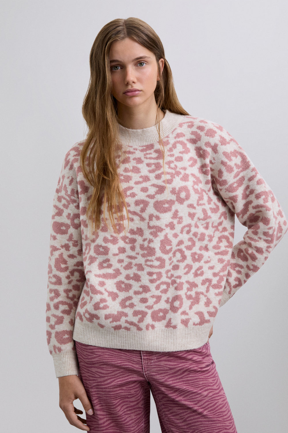 Jersey de punto. Manga larga. Cuello redondo. Estampado animal print. Acabados en rib a contraste.