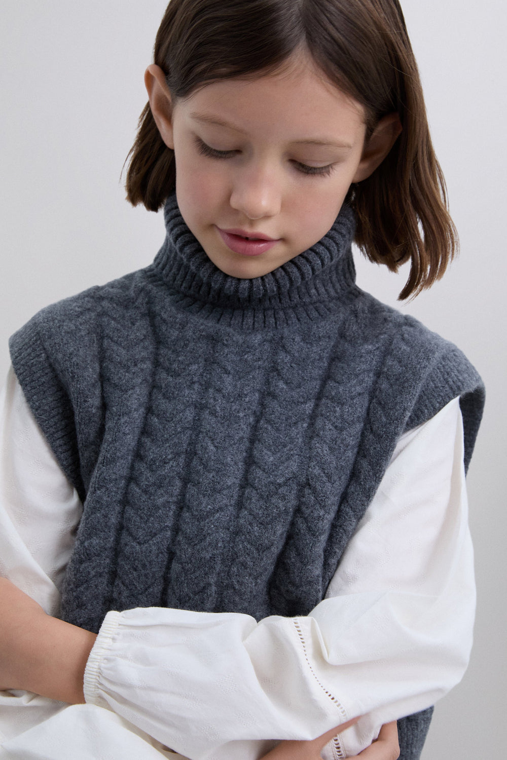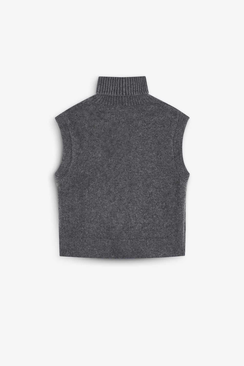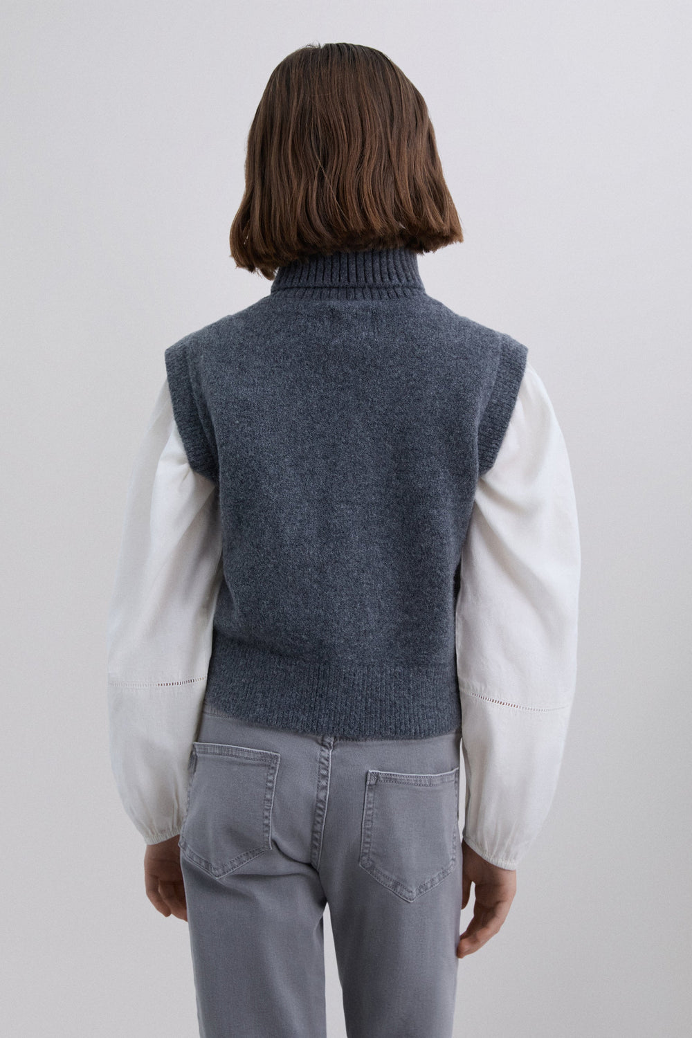 Chaleco de punto. Cuello vuelto. Acabados en rib. Detalle de calavera en chapa metálica.