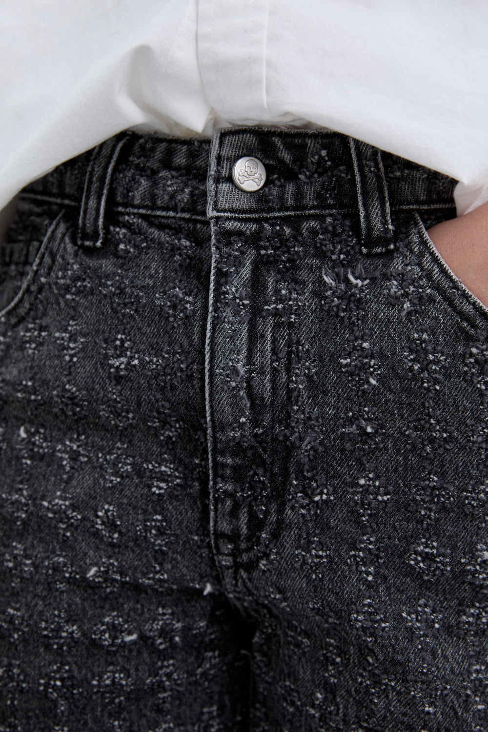 Jeans confeccionados en algodón ligeramente elástico con estampado de hilo metalizado hecho mediante láser. Corte flaire, cierre con cremallera y botón y trabillas en cintura. Bolsillos laterales y traseros.