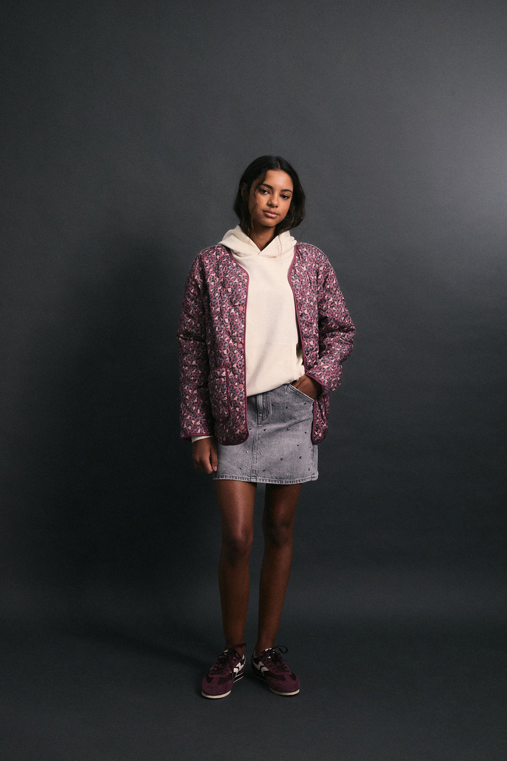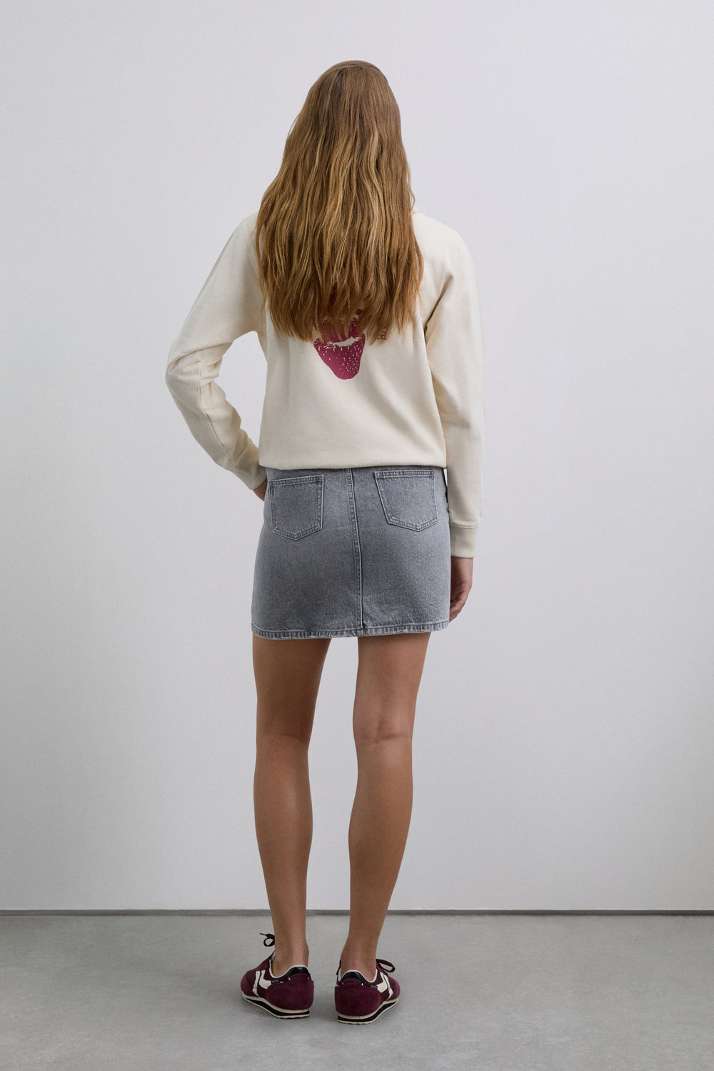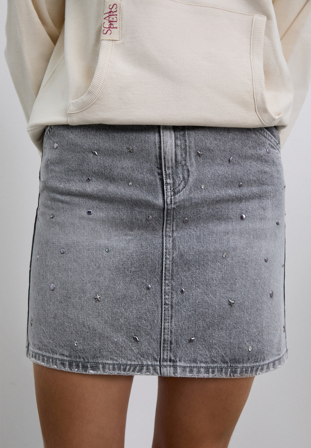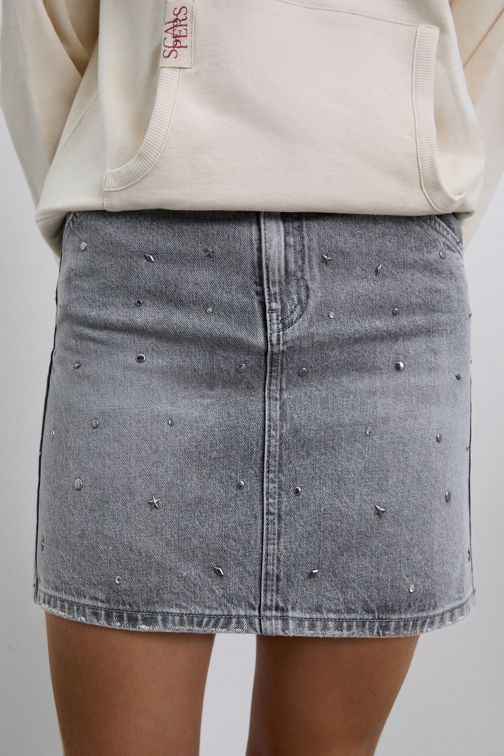 Falda mini denim confeccionada en 100% algodón BCI. Detalle de tachuelas. Cierre mediante botón y cremallera. Trabillas en cintura. Dos bolsillos frontales y traseros.