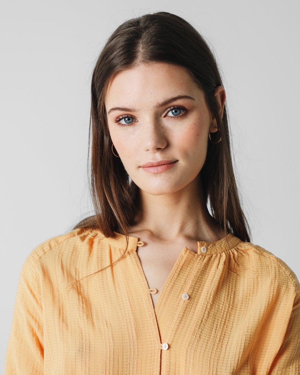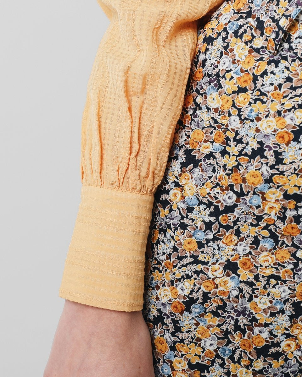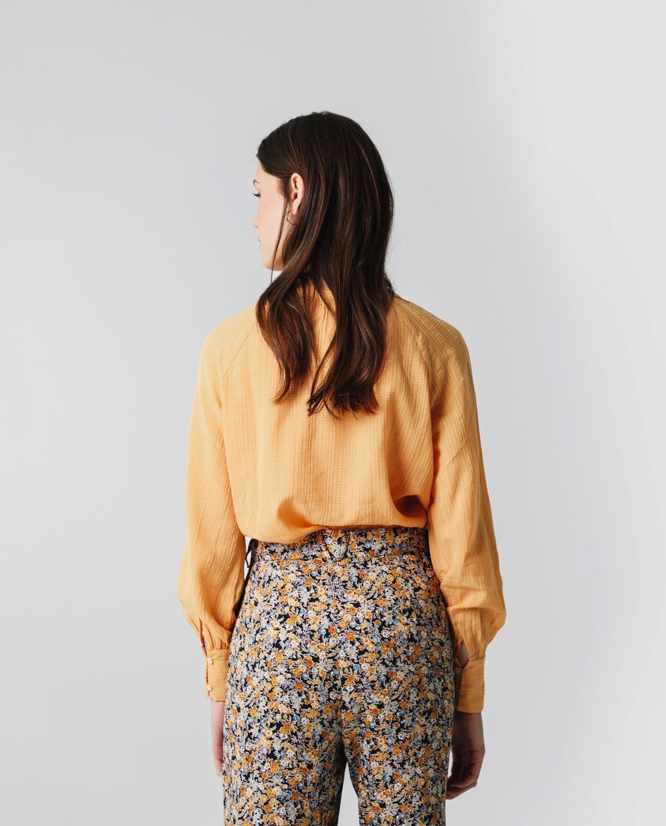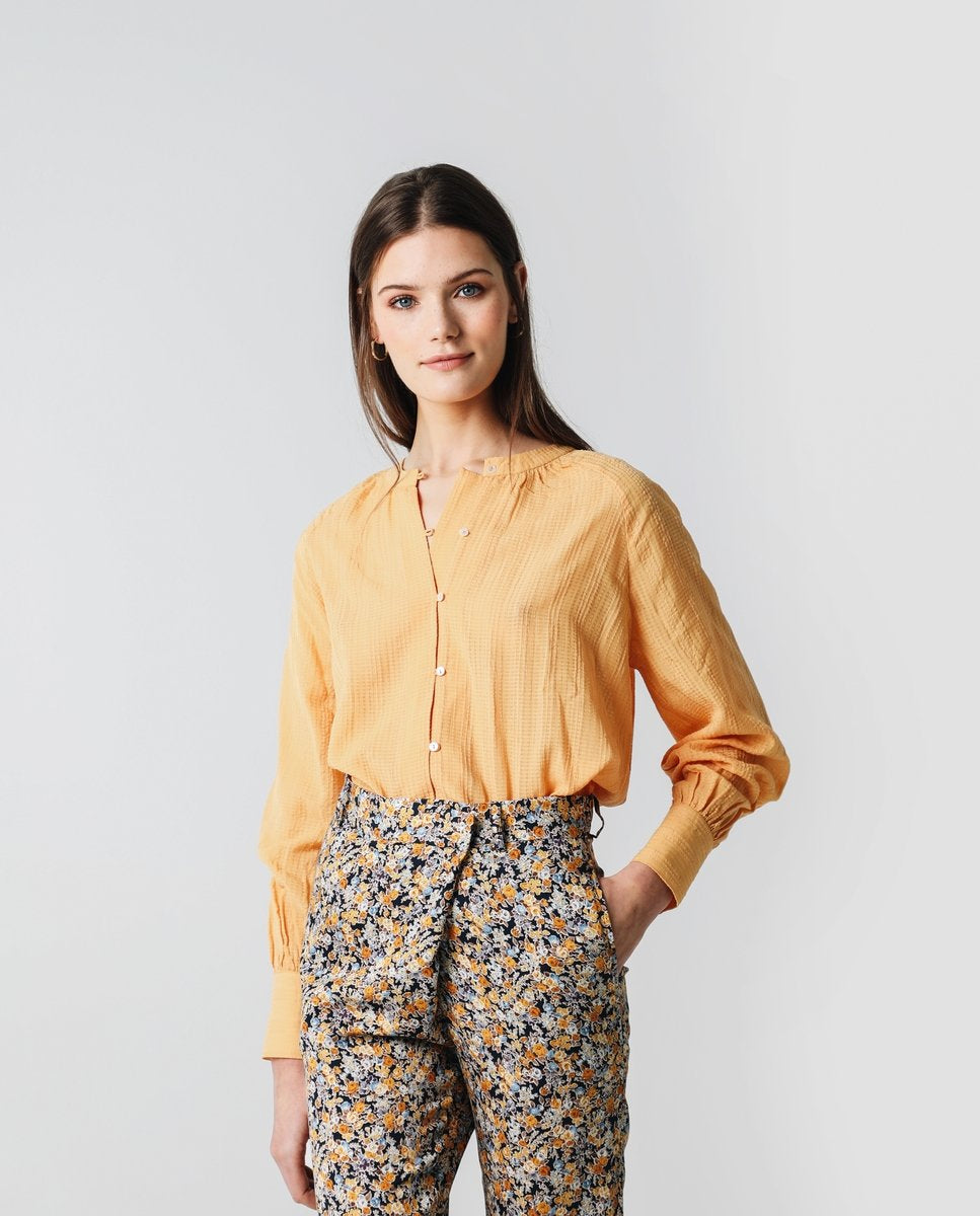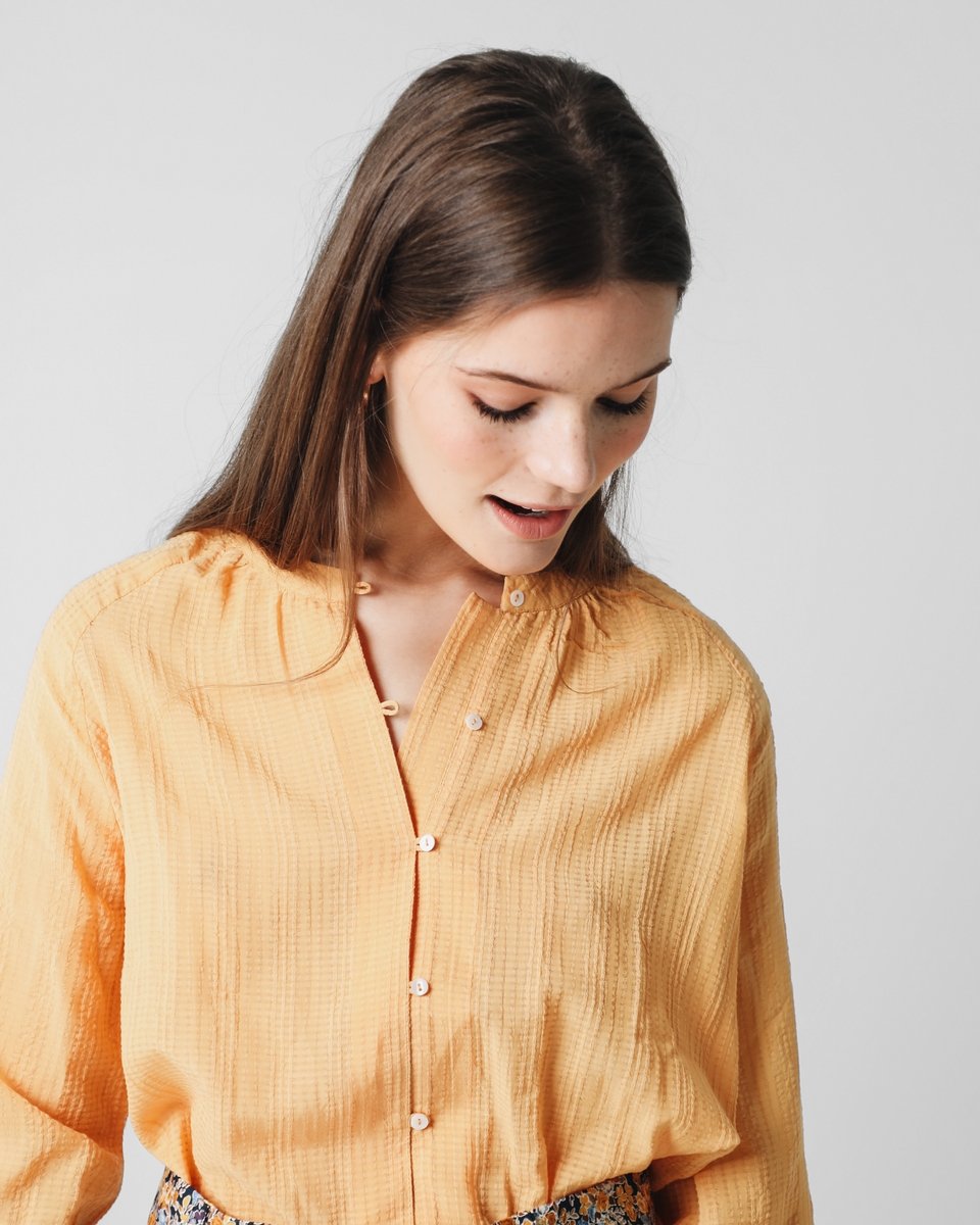 Camisa de cuadros confeccionada en tejido seersucker. Corte recto, cuello redondo y cierre con botones de presilla. Manga larga ranglán terminada en puño con dos botones.