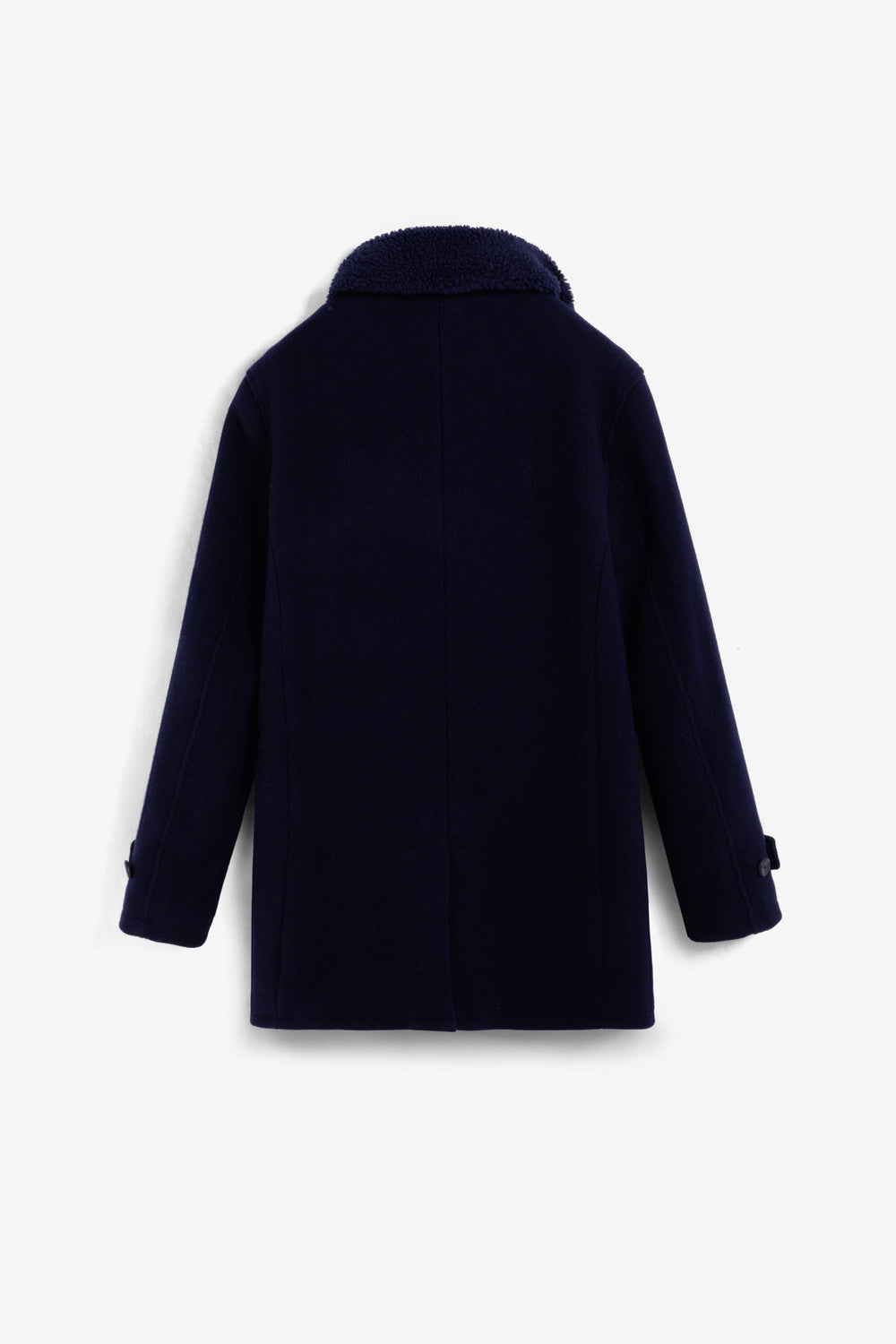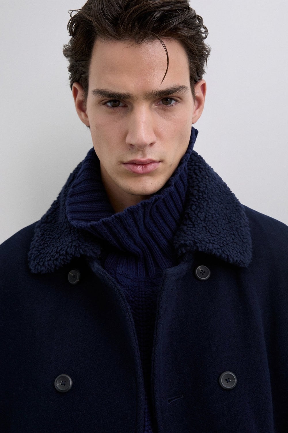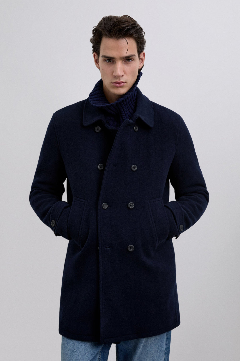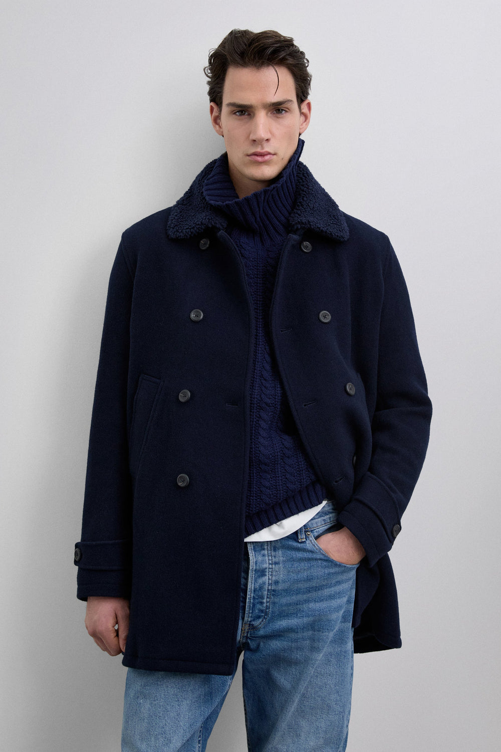 Abrigo cruzado confeccionado en lana. Cierre con botones, Detalle de puño con trabilla. Dos bolsillos vivos amplios e inclinados. Bolsillo interior. Detalle desmontable en el cuello.