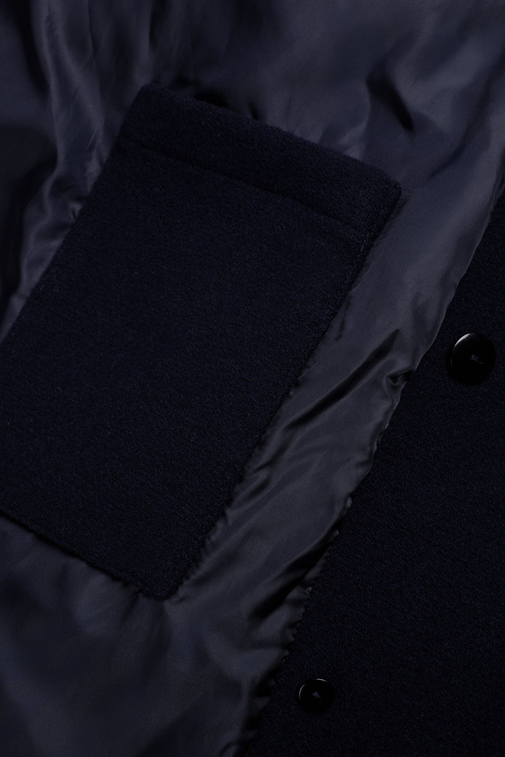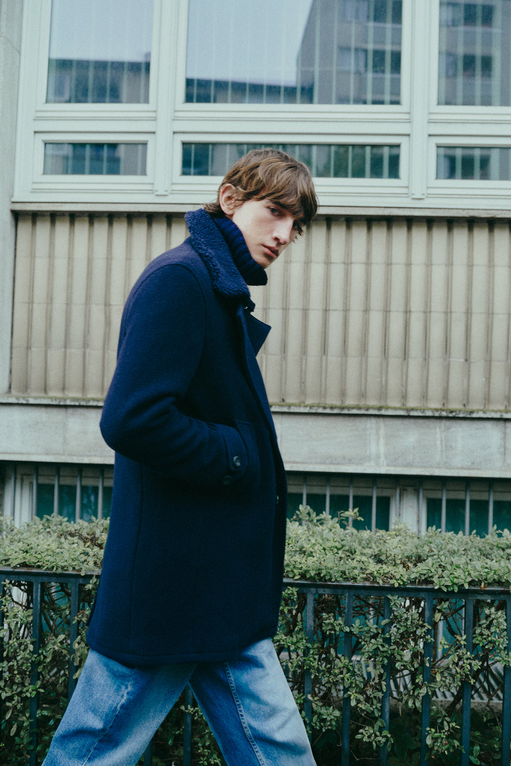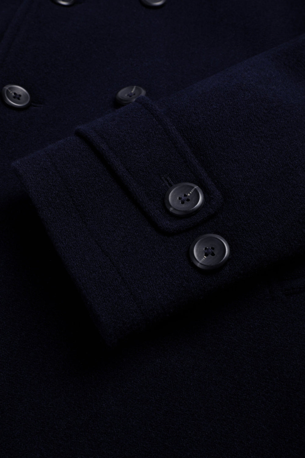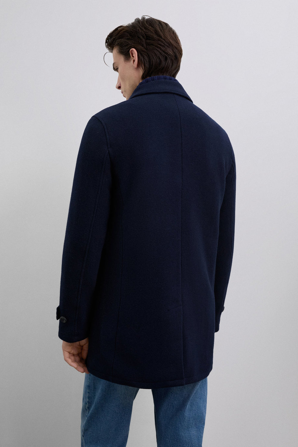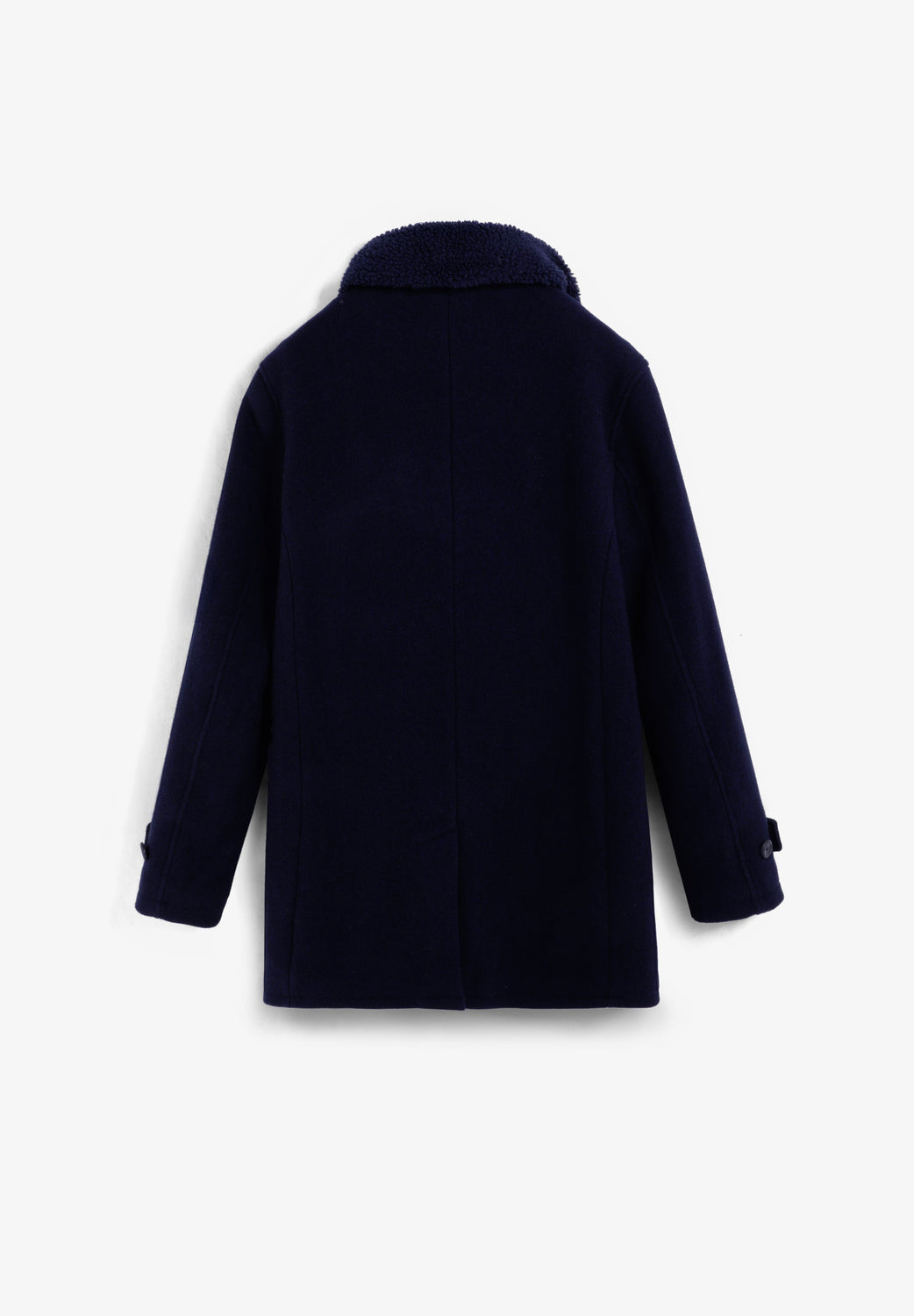 Abrigo cruzado confeccionado en lana. Cierre con botones, Detalle de puño con trabilla. Dos bolsillos vivos amplios e inclinados. Bolsillo interior. Detalle desmontable en el cuello.