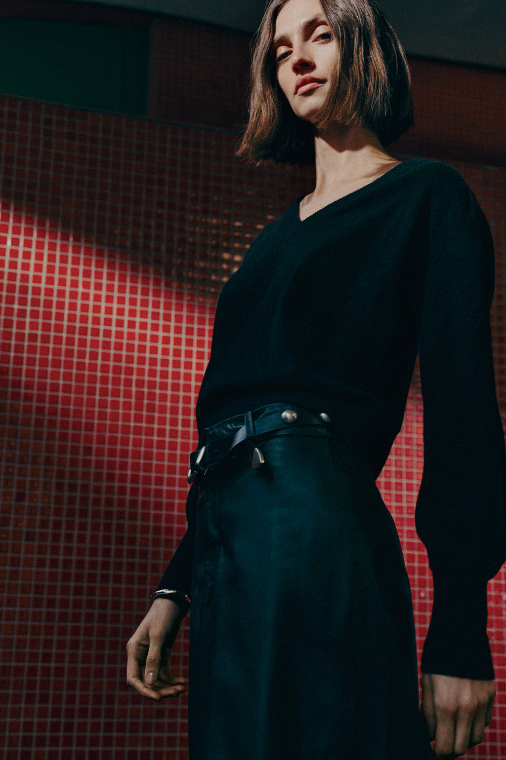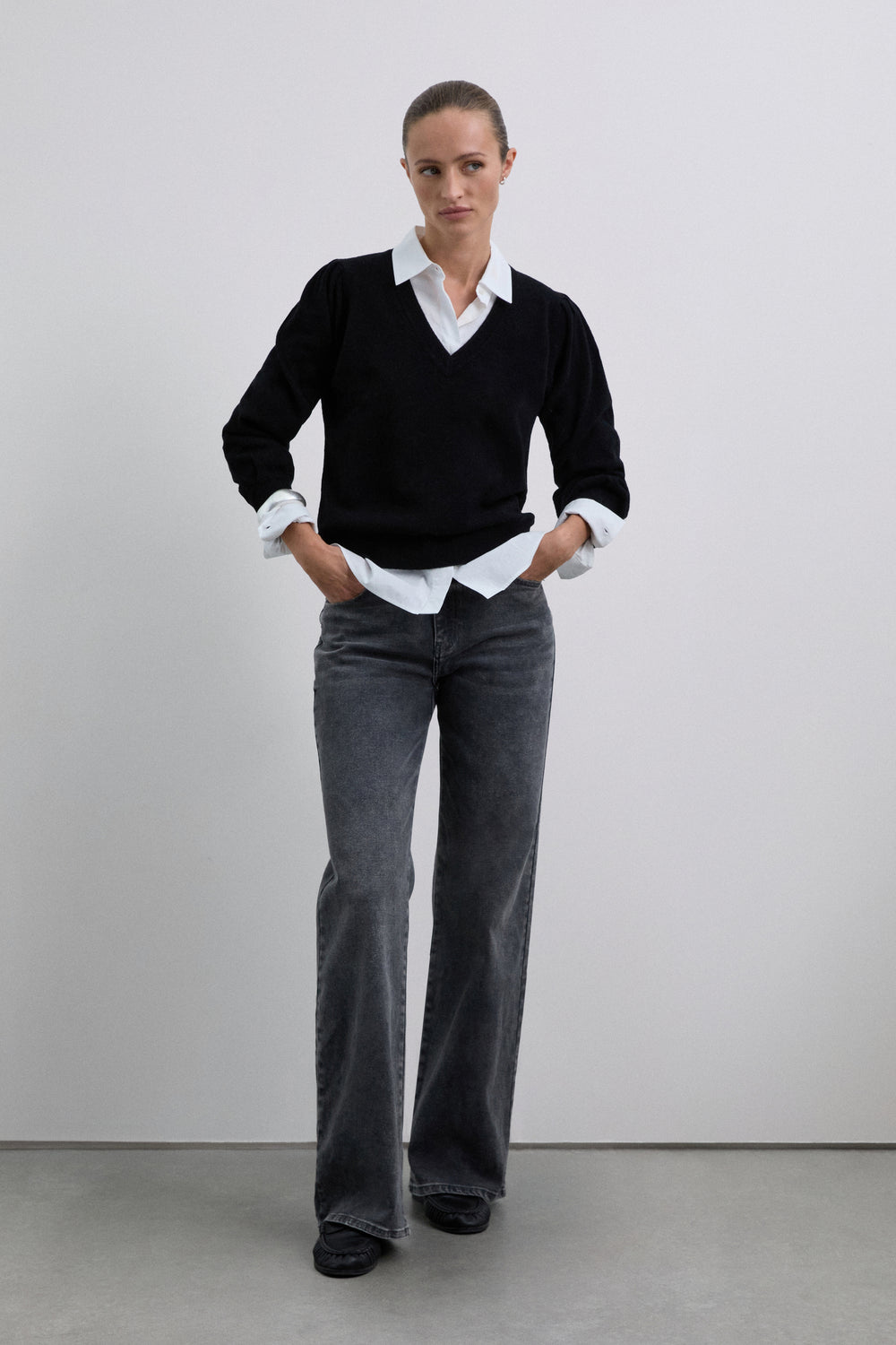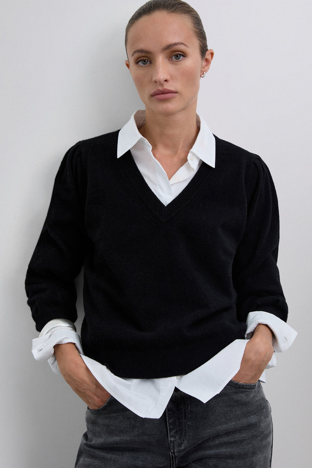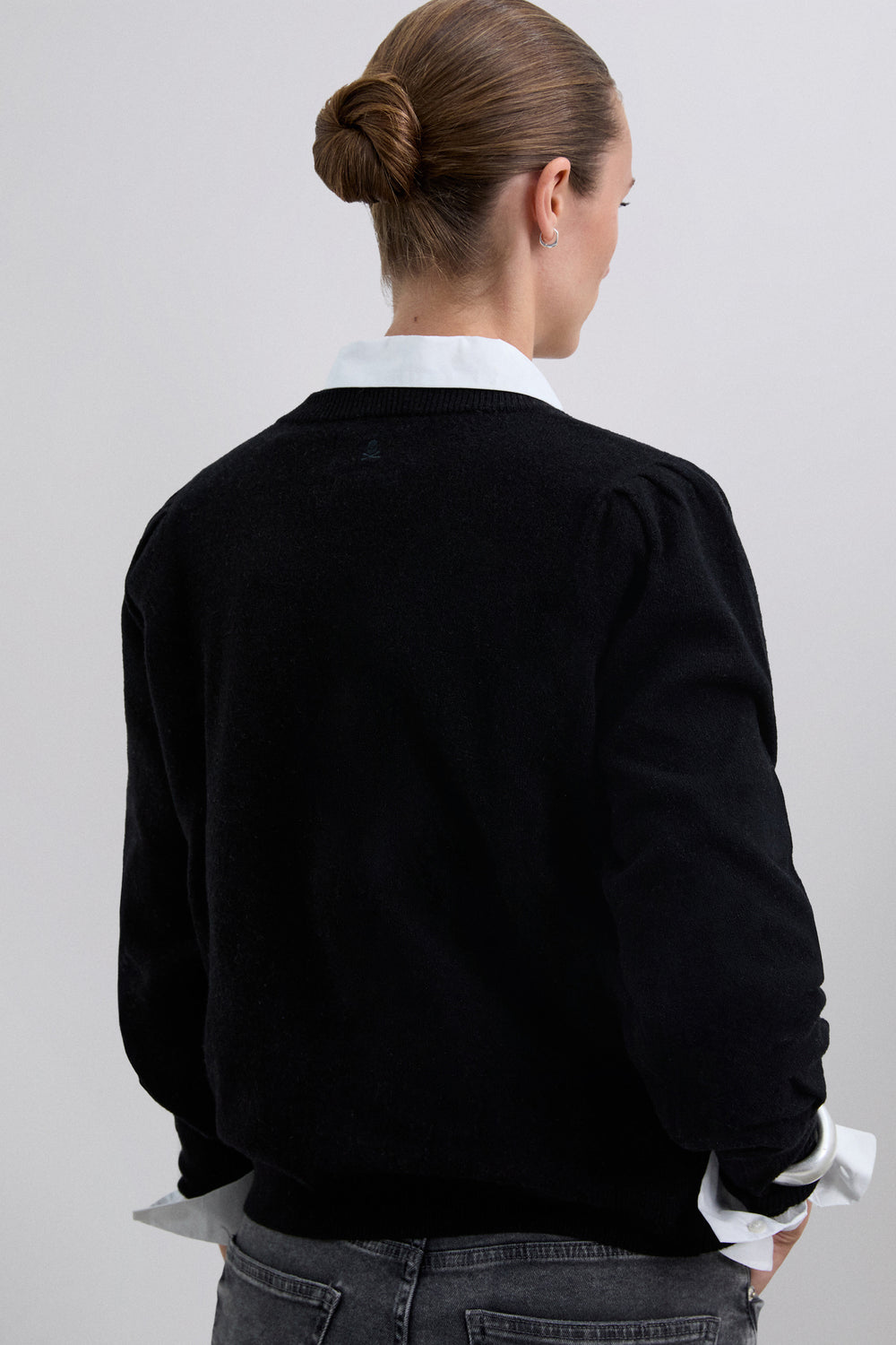 Jersey confeccionado en mezcla de lana con escote en V. Regular fit. Manga larga ligeramente abullonada acabadas en puño en rib. Detalle de calavera bordada a tono en parte trasera.