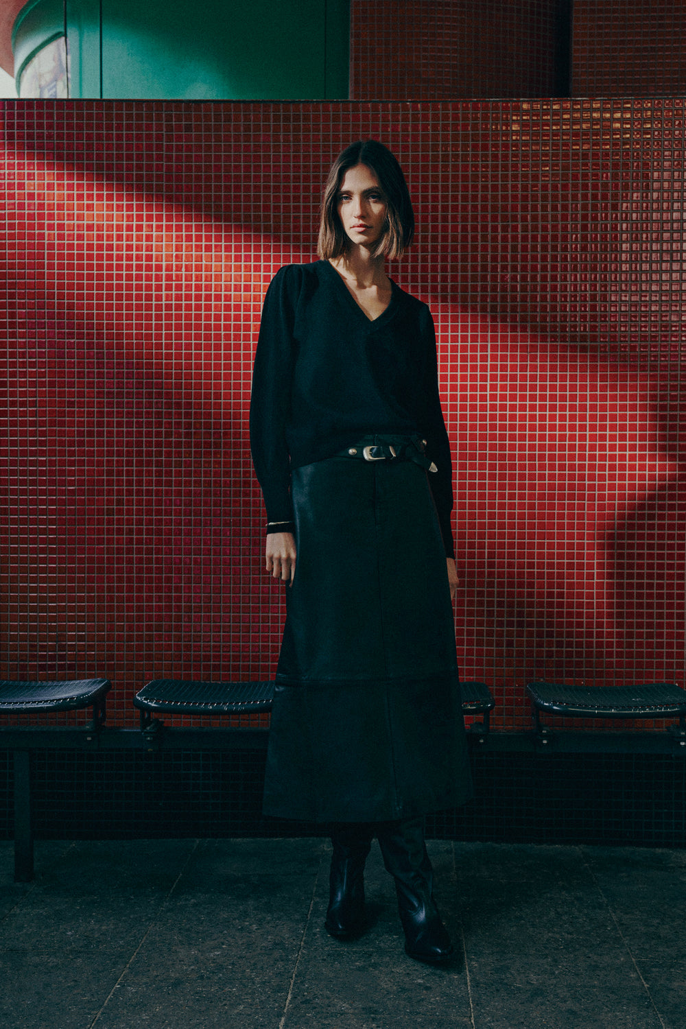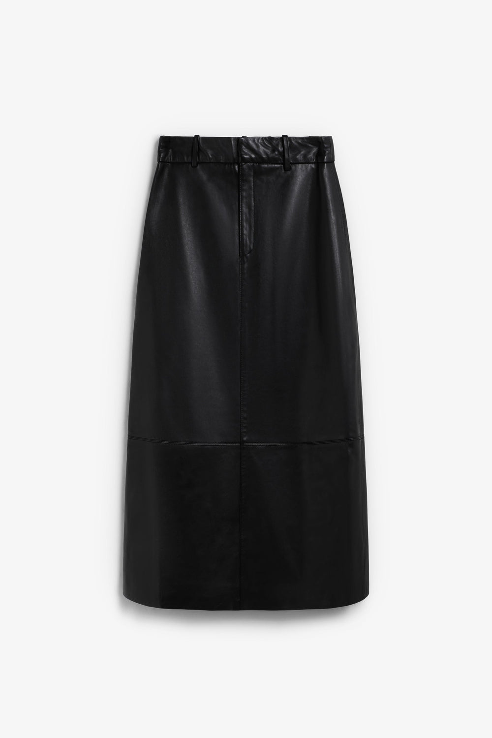 Falda midi confeccionada en piel. Cierre delantero con cremallera y botón. Detalle en cintura para incluir cinturón. Detalle de costuras.