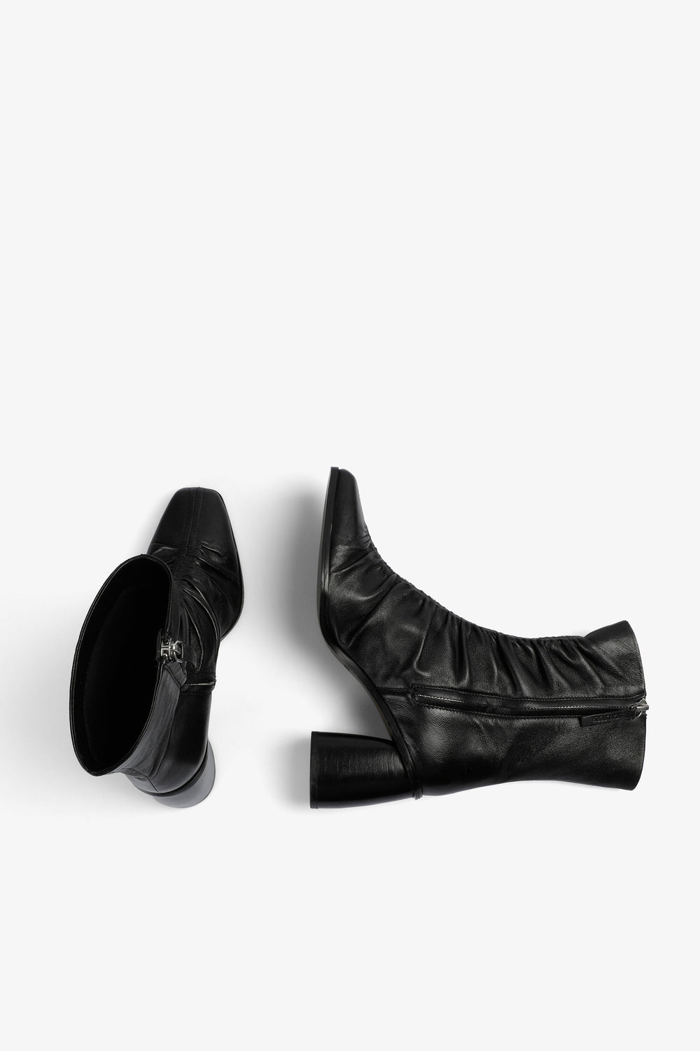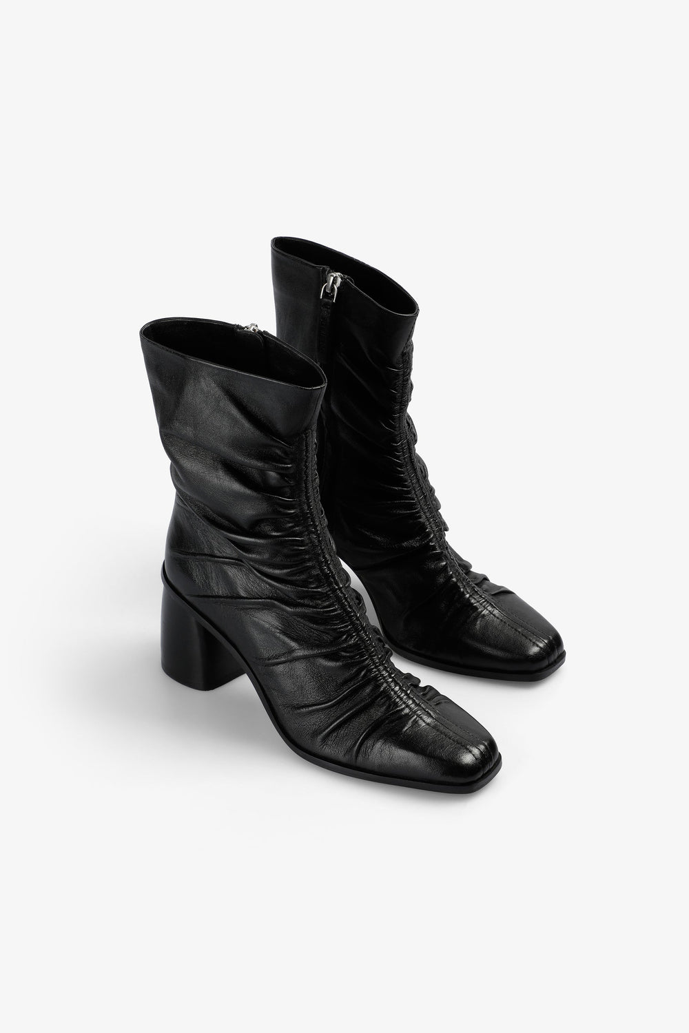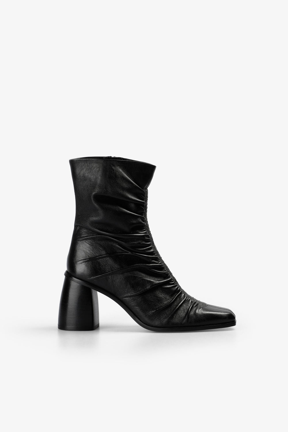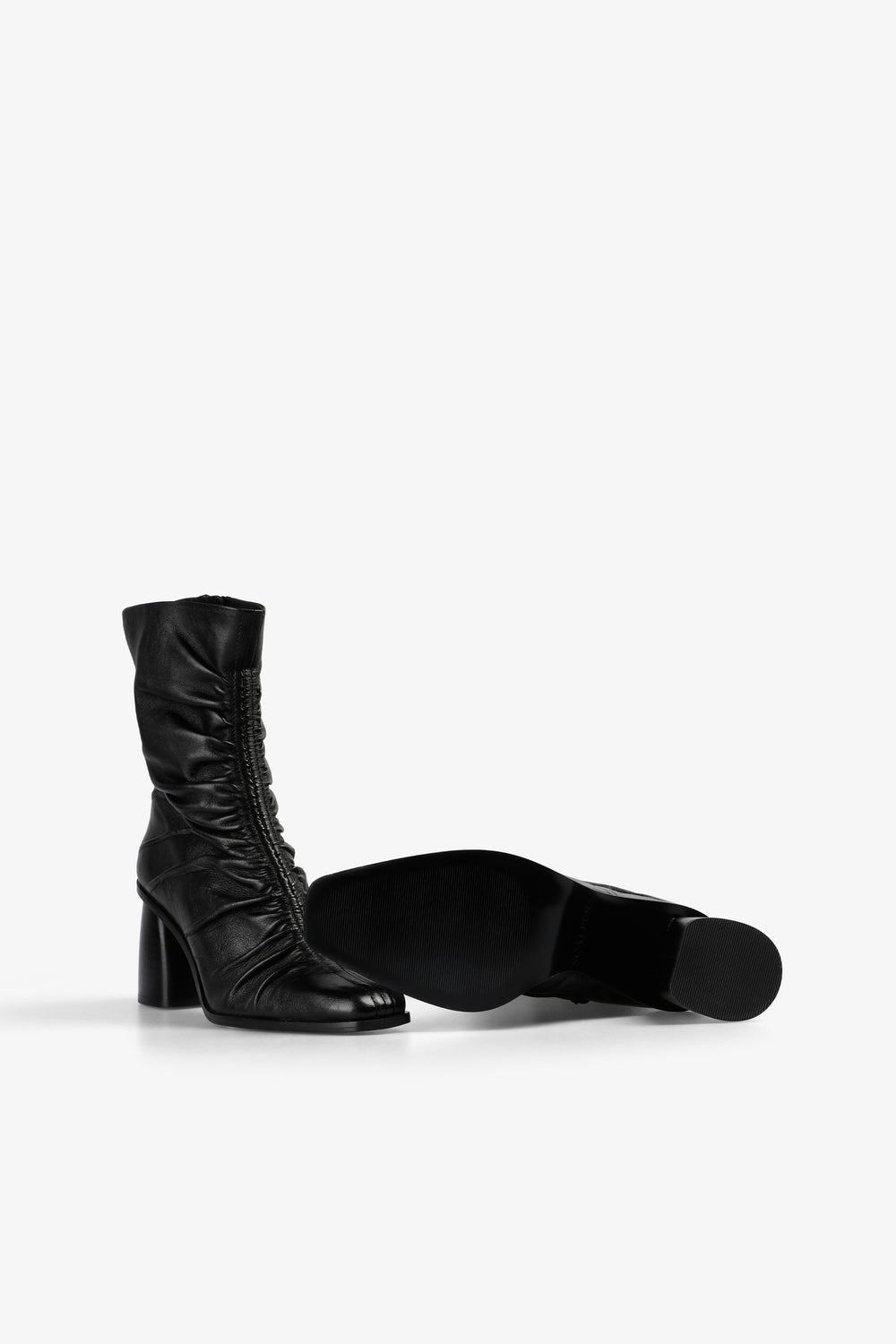 Botas confeccionadas en 100% piel. Tacón medio. Detalle de efecto drapeado en el centro delantero. Cierre con cremallera. Detalle de logo bordado en cremallera. Altura del tacón: 7,5 cm.