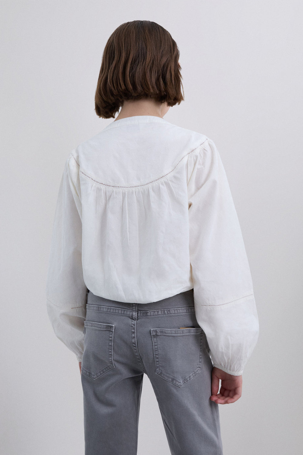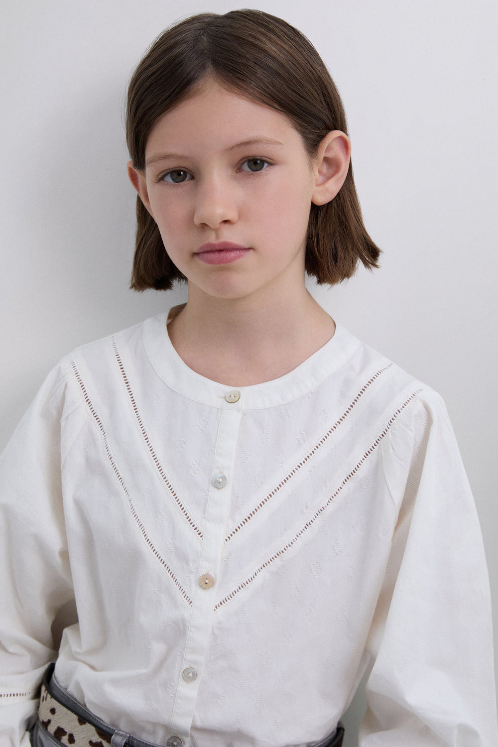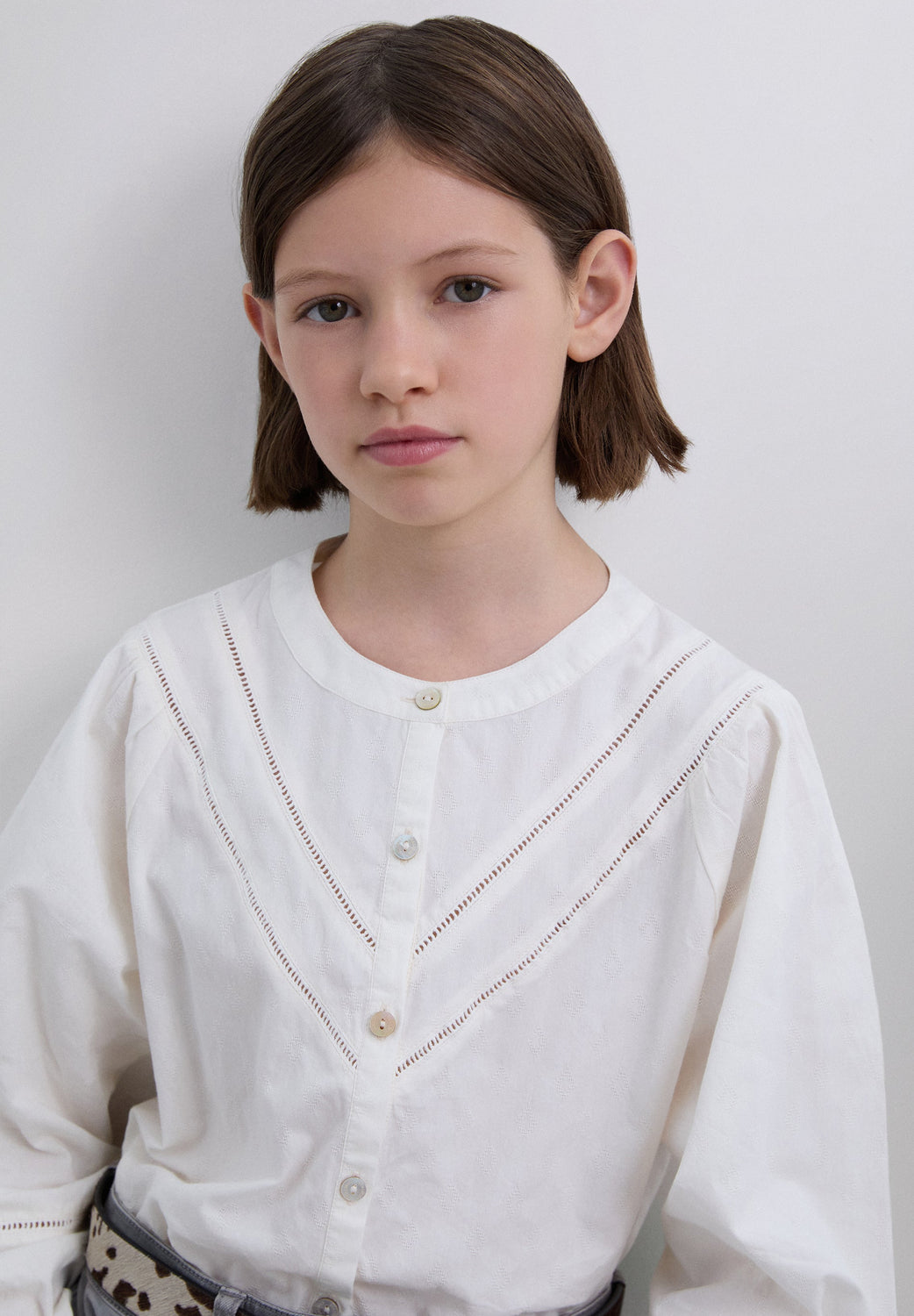 Camisa confeccionada 100% en algodón. Camisa con cuello redondo y manga larga acabada en goma. Cierre botonadura frontal. Detalle troquelados en pico.