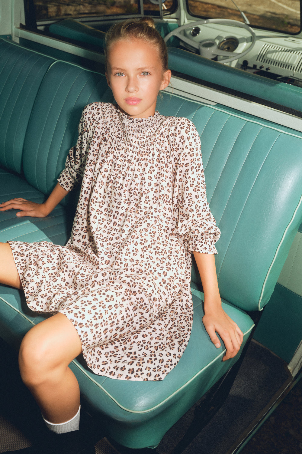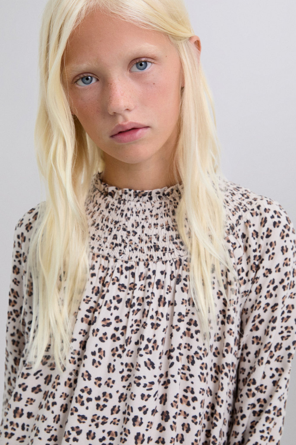 Vestido estampado animal print. Manga larga ligeramente abullonada. Cuello nido de abeja y cierre mediante botón.