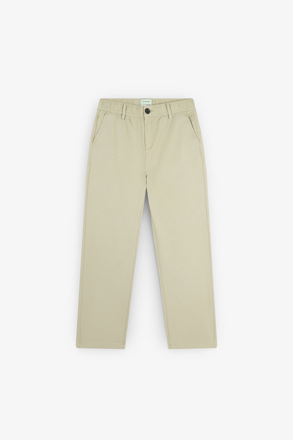 Pantalón chino confeccionado en 100% algodón BCI. Dos bolsillos delanteros y traseros. Cierre mediante botón y trabillas en cintura. Detalle etiqueta con logo en bolsillo.