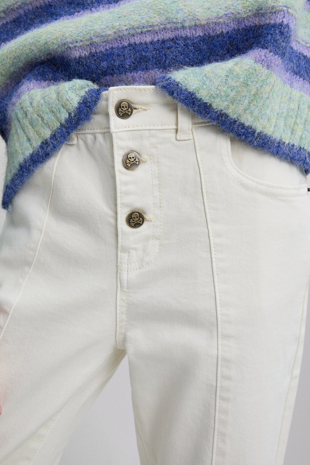 Pantalón confeccionado con algodón ligeramente elástico. Corte flare. Cierre en botones con detalles logo calavera. Bolsillos delanteros y traseros de parche. Acabado en flecado y costura frontal.