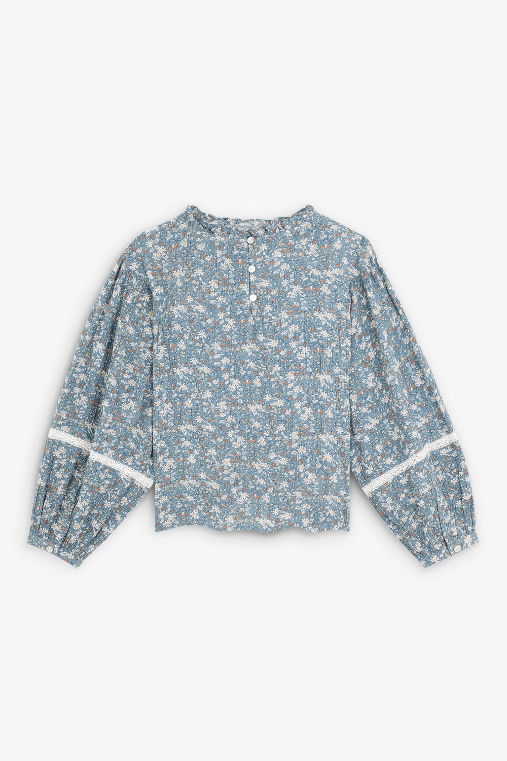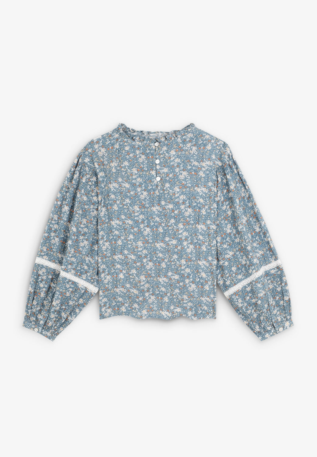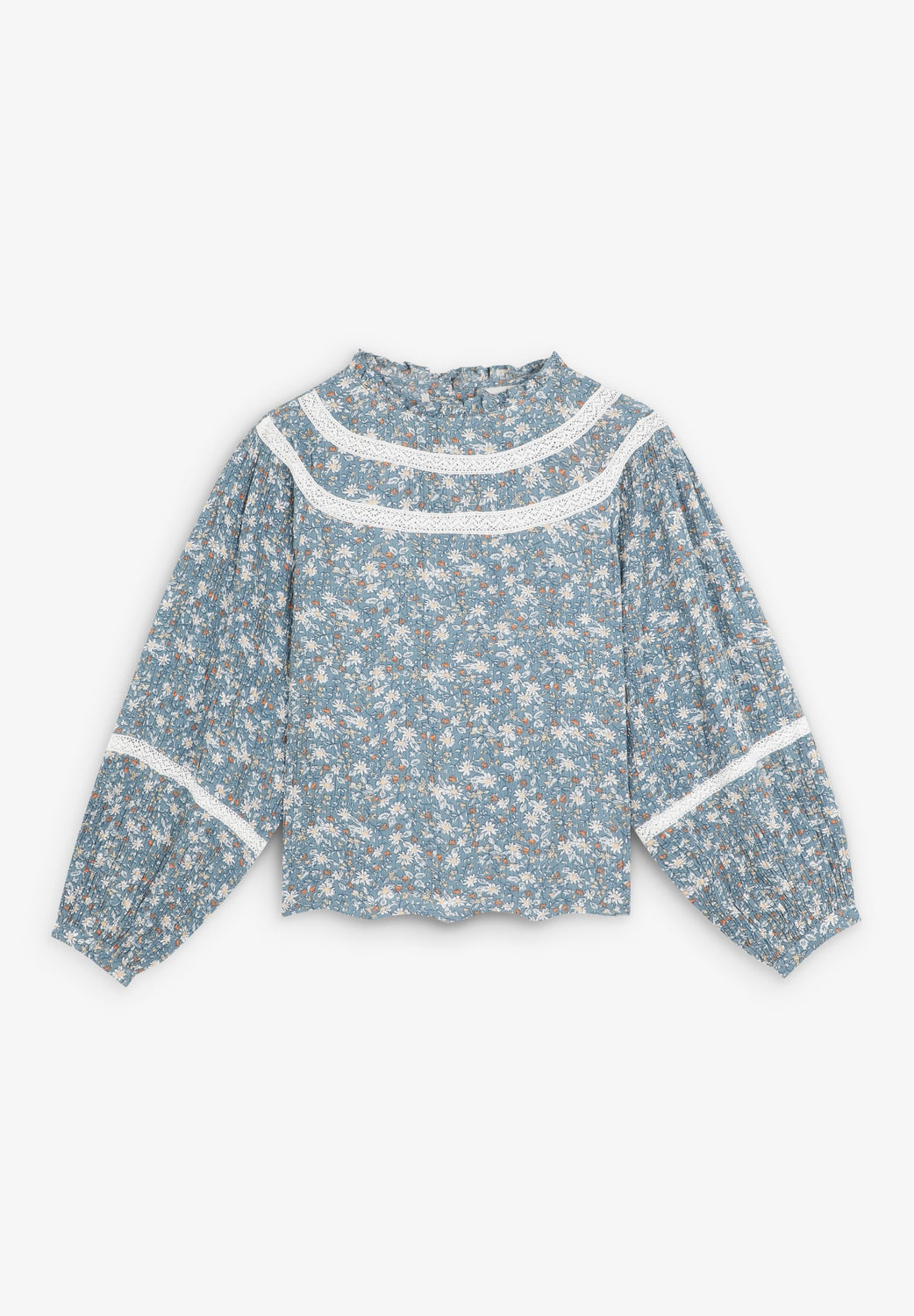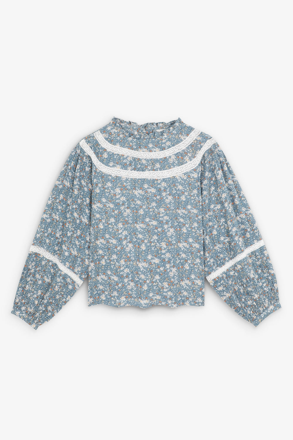 Blusa. Regular fit. Cuello redondo. Manga larga abullonada con cierre mediante botón. Detalles bordados en cuello y mangas. Cierre trasero con botón. Estampado de flores. Volantes en el bajo.