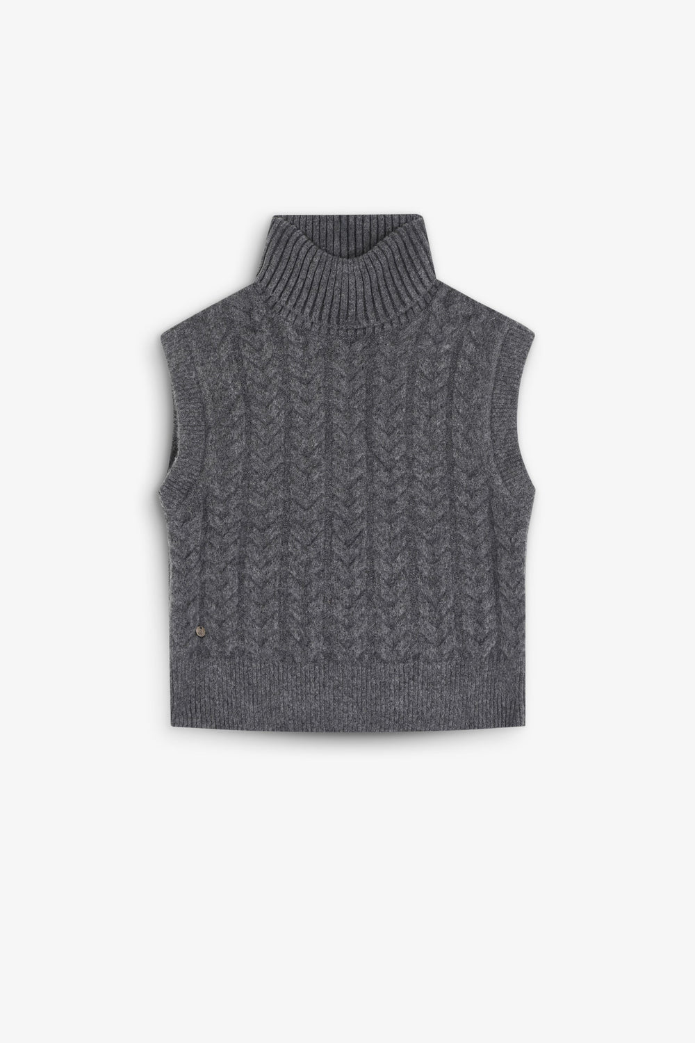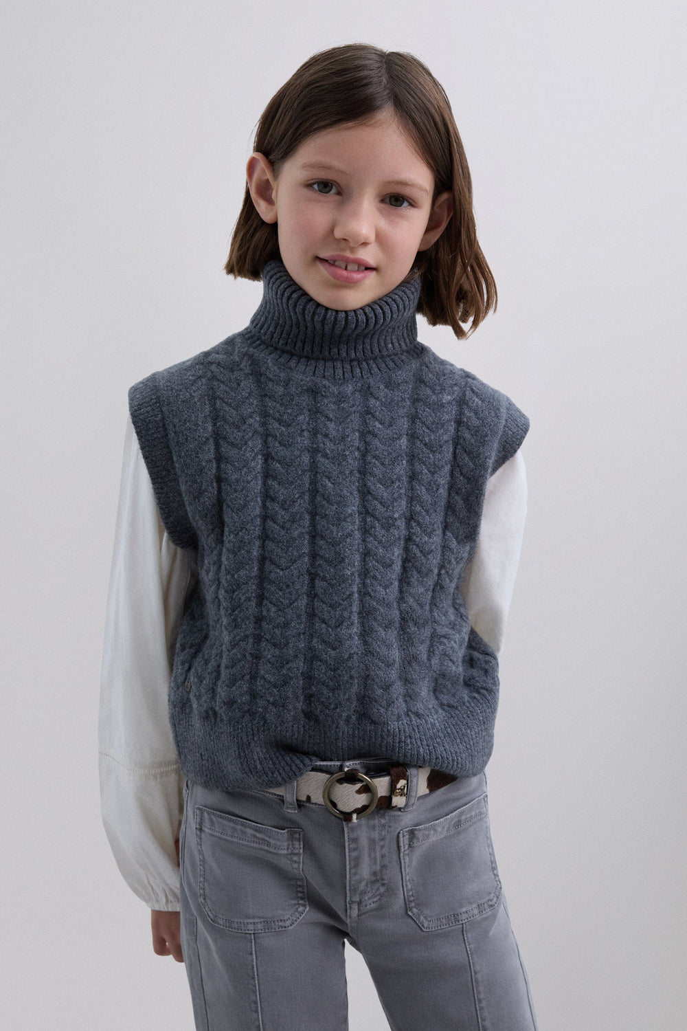 Chaleco de punto. Cuello vuelto. Acabados en rib. Detalle de calavera en chapa metálica.