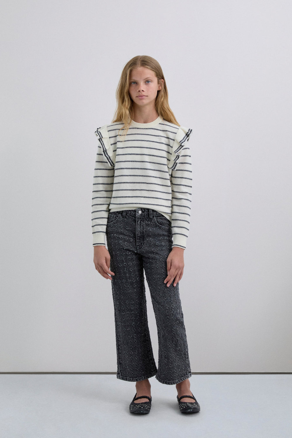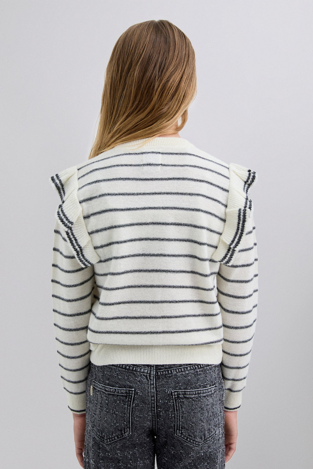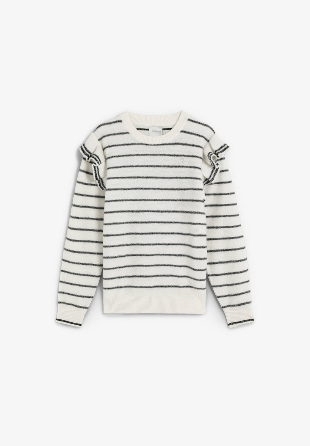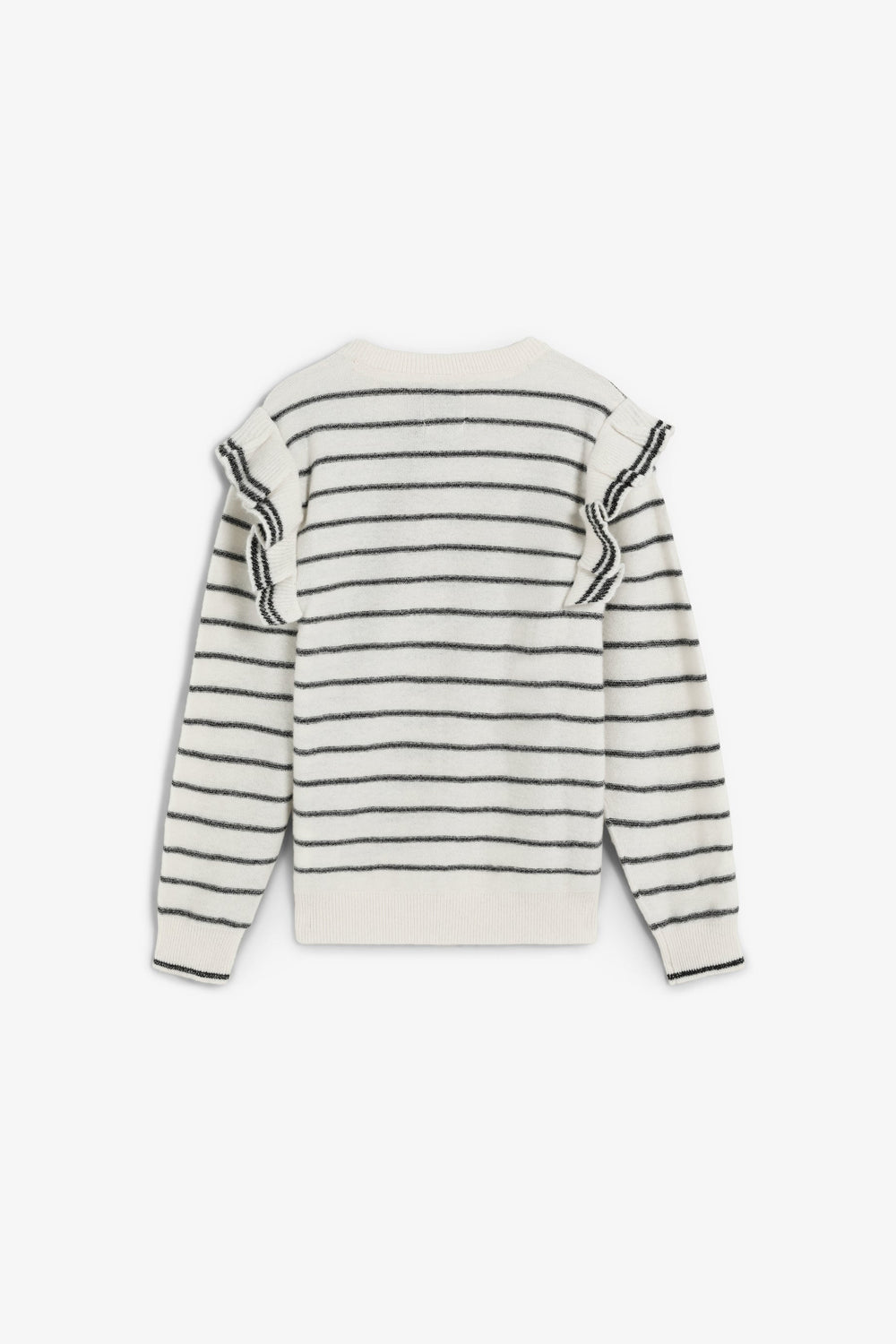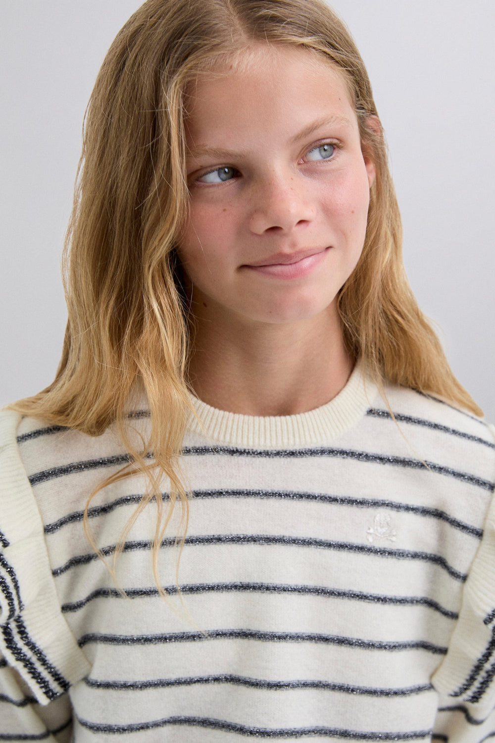 Jersey de rayas de punto confeccionado en mezcla de lana. Cuello redondo. Corte regular fit. Detalle de volantes en hombros y logo en pecho.