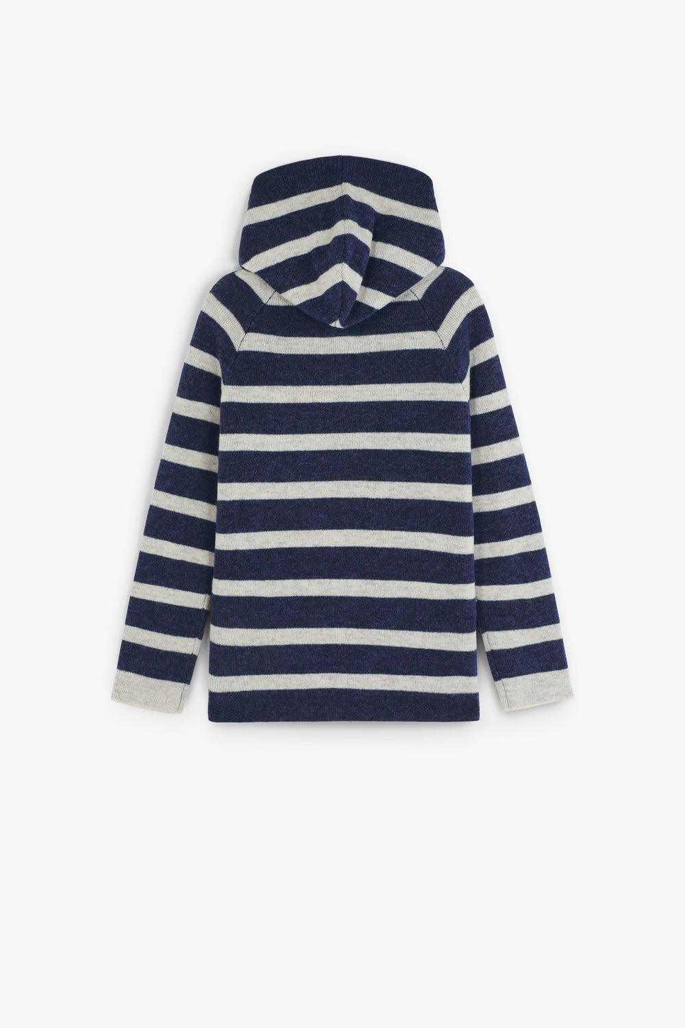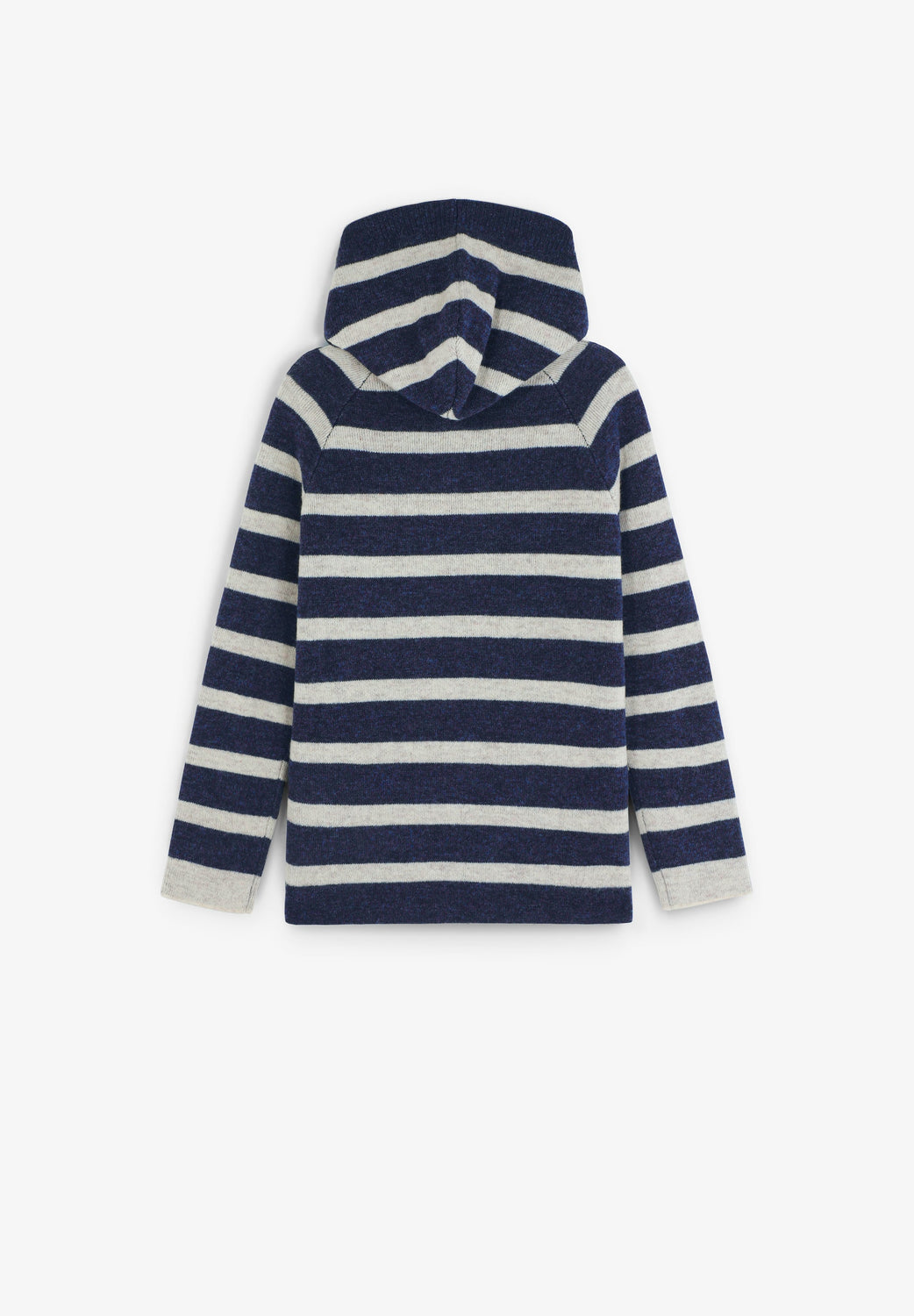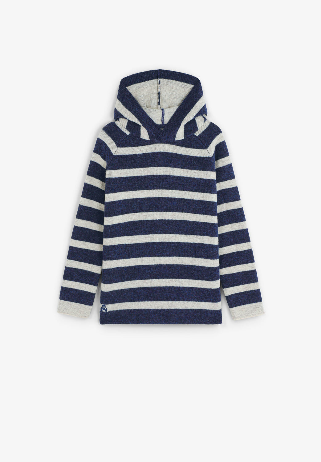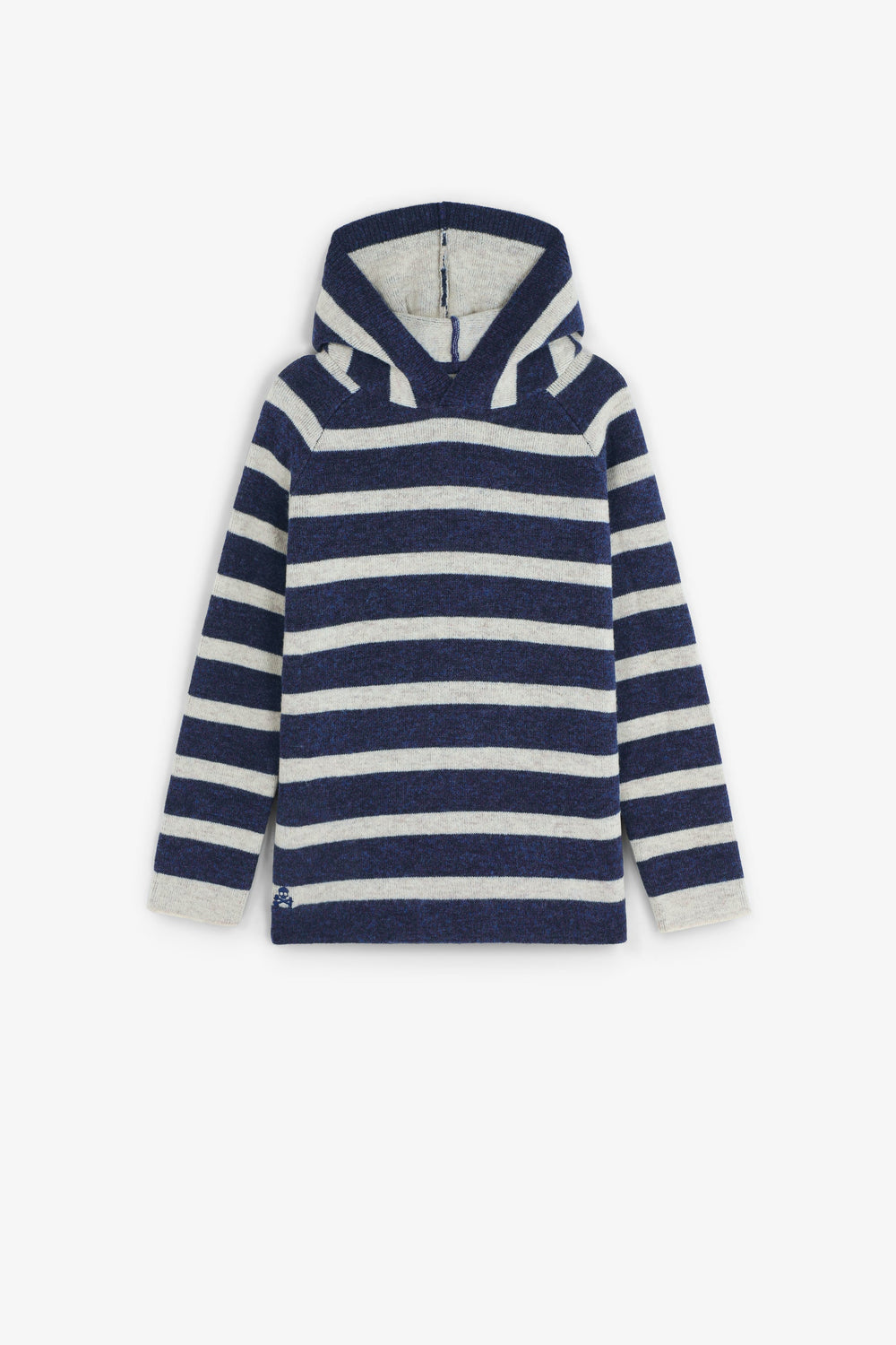 Jersey de punto confeccionado en mezcla de lana con capucha. Estampado de rayas. Manga larga. Calavera bordada a contraste en el bajo.