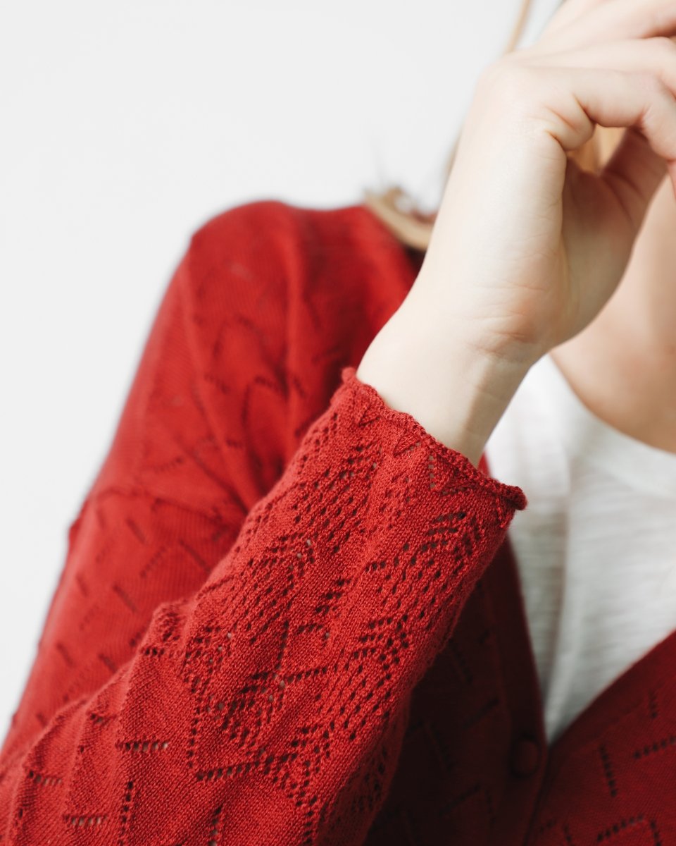Cardigan corto con calados confeccionada en punto. Corte recto, cuello de pico y cierre con botones forrados. Manga larga y puño y bajo con terminación de vuelta.