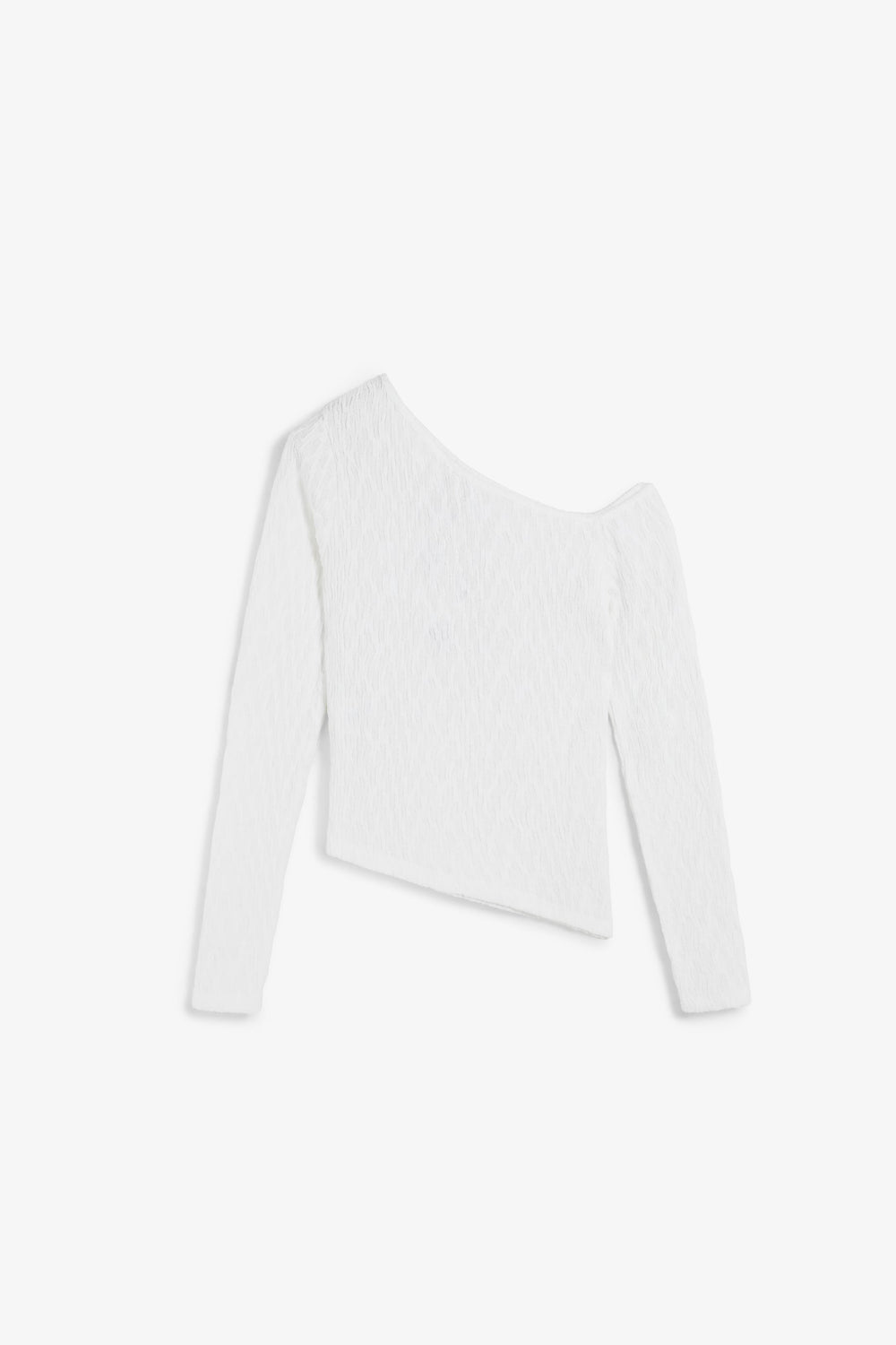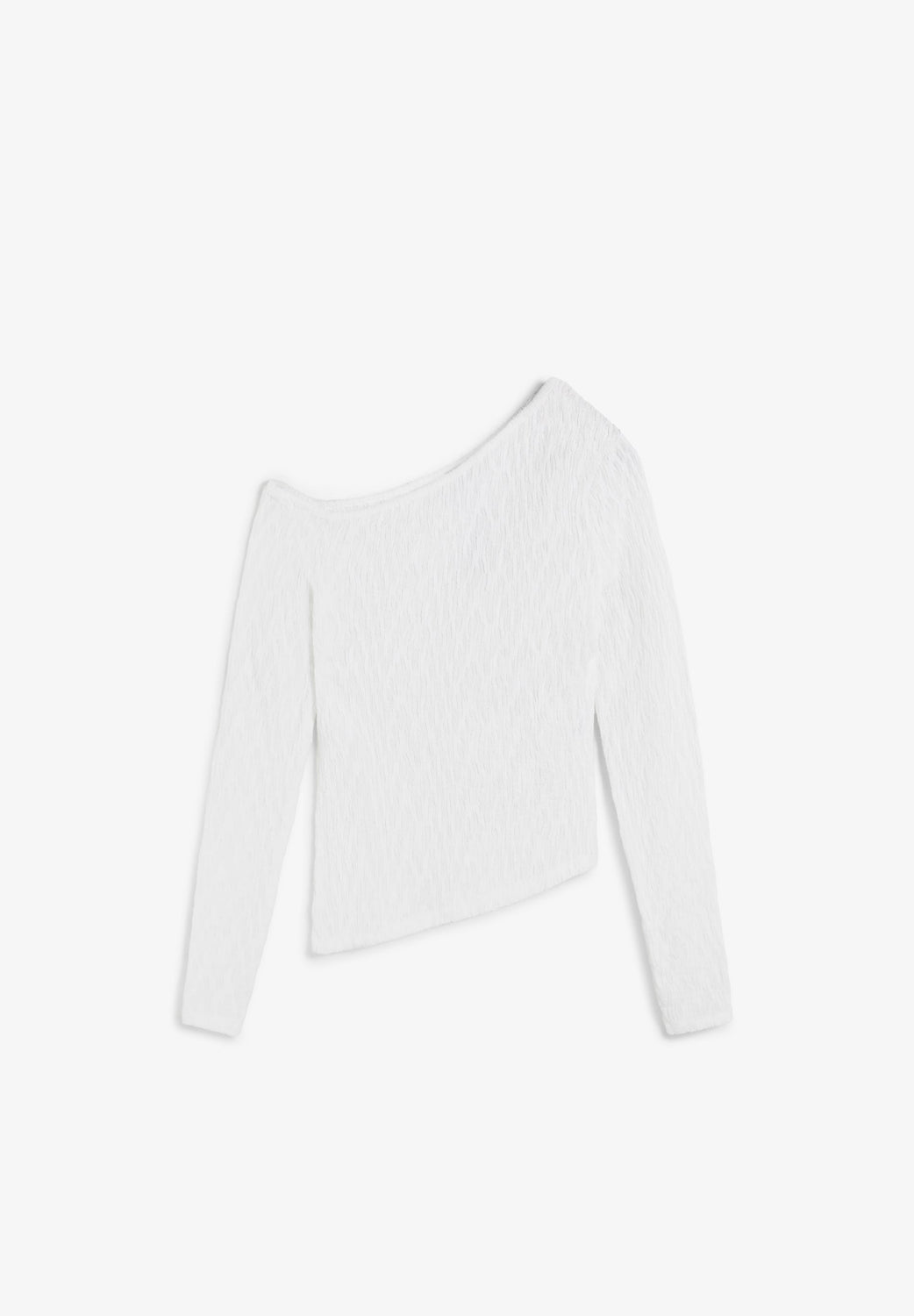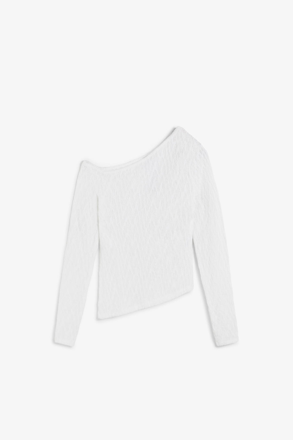Top de manga larga diseño asimétrico. Hombro descubierto y diseño fruncido. Acabados en rib.
