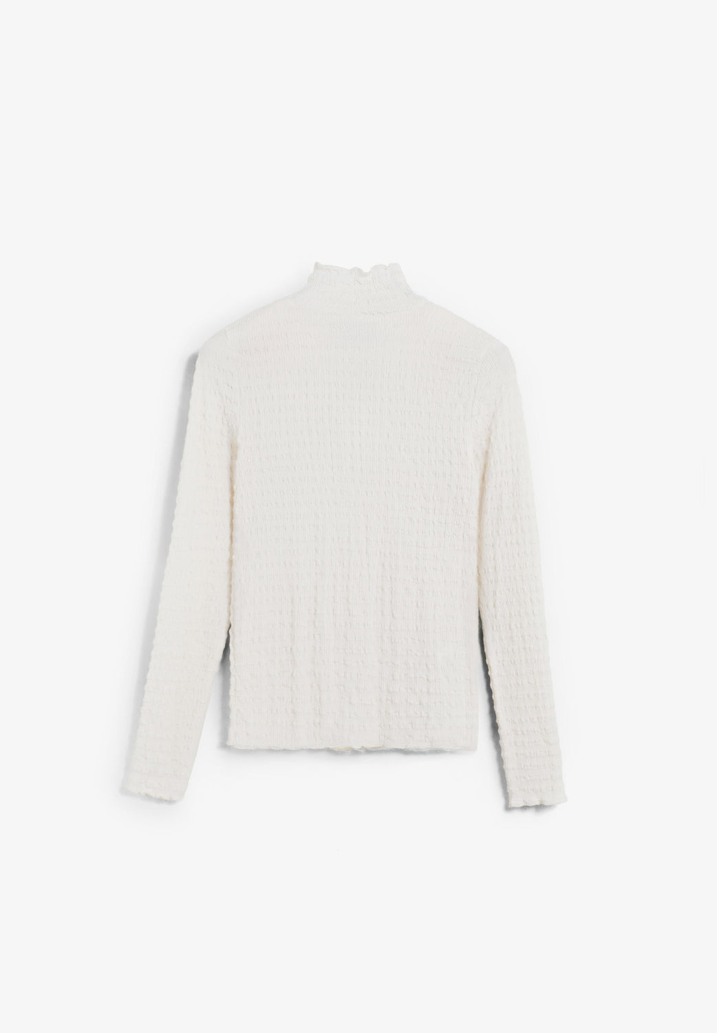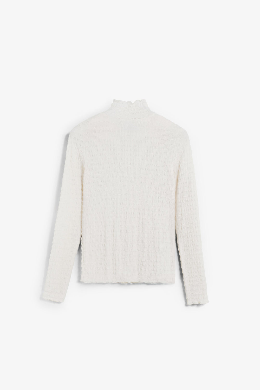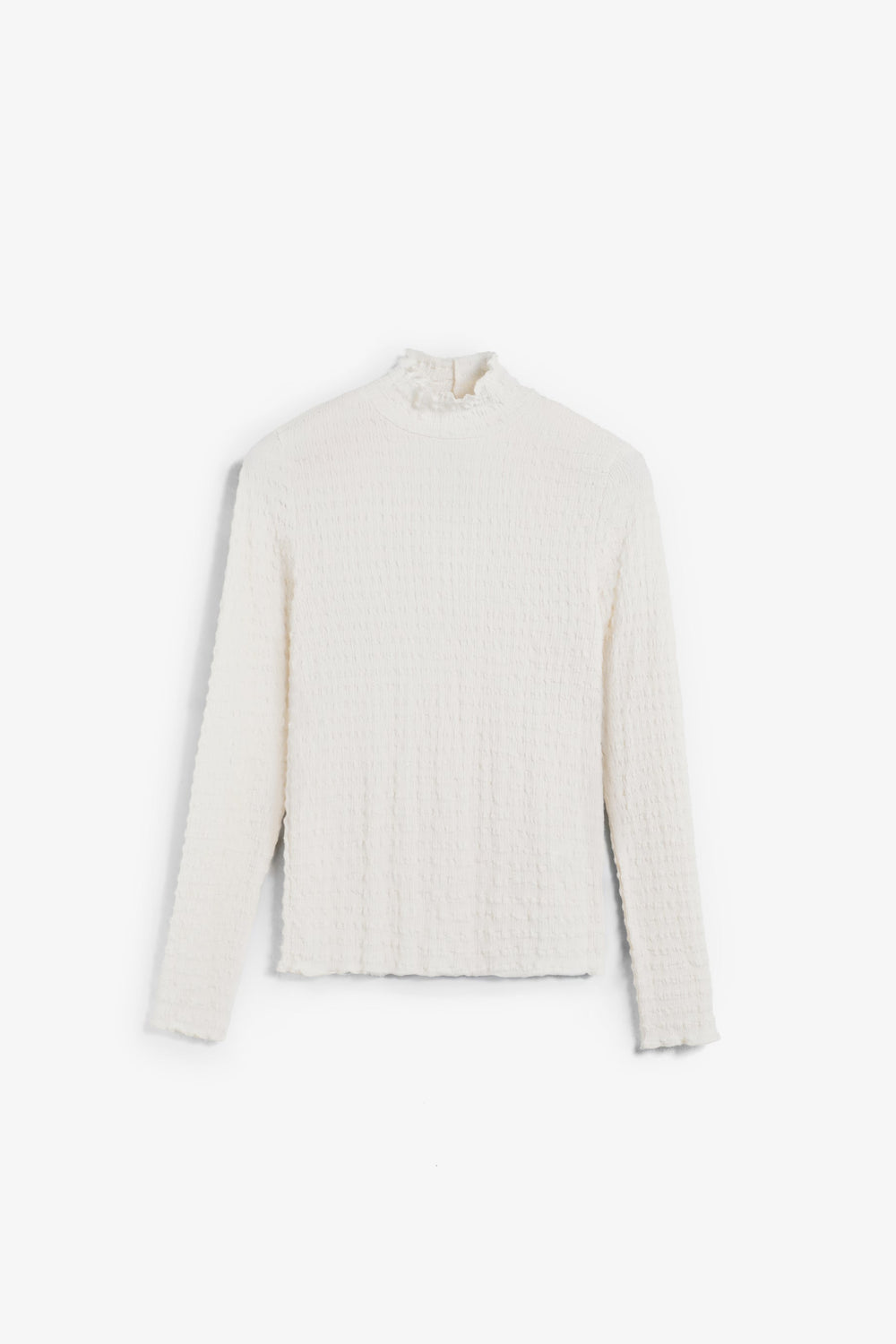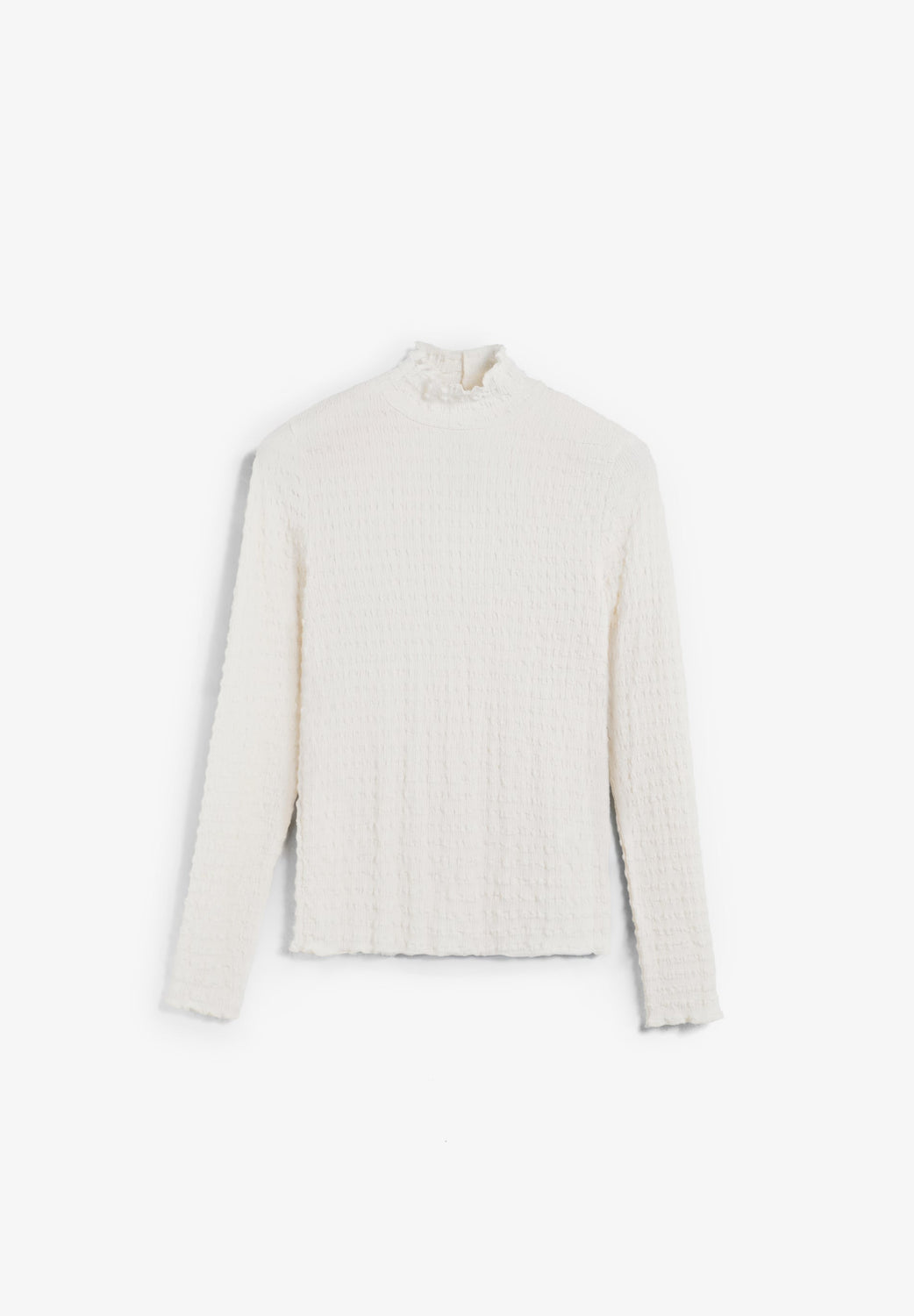 Top cuello alto y manga larga. Tejido ligero con diseño con estructura fruncida.