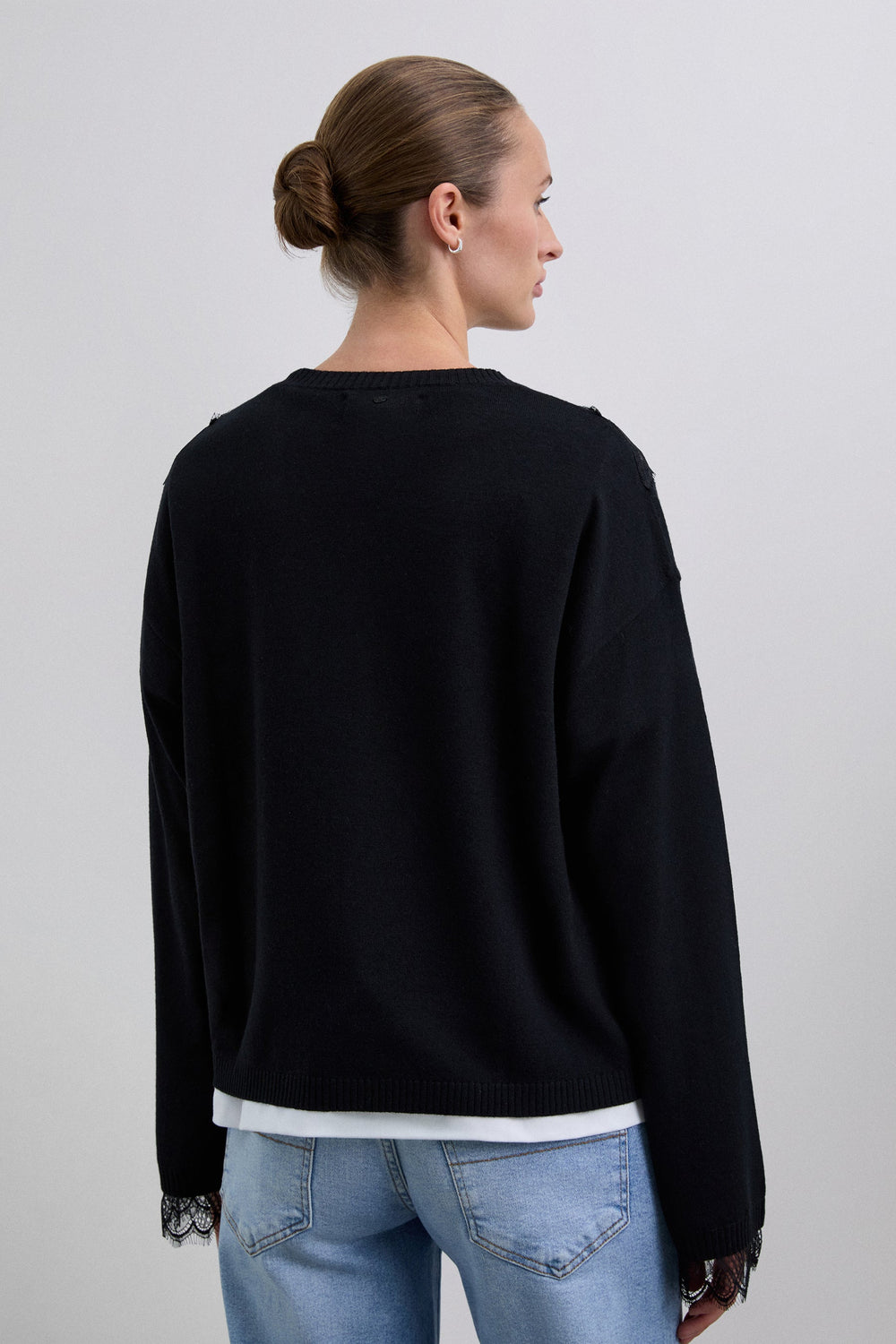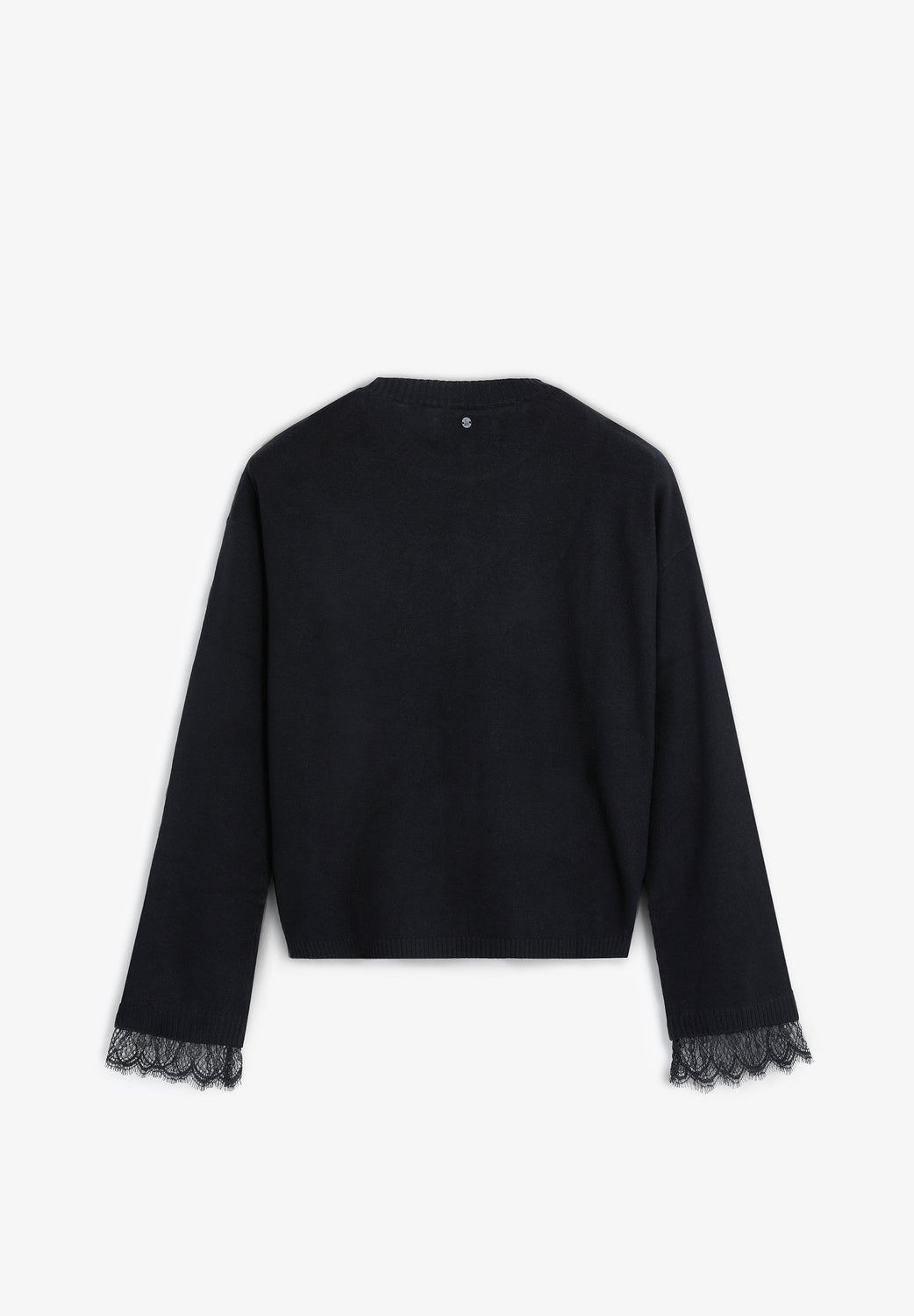 Jersey confeccionado en mezcla de lana y viscosa. Regular fit. Cuello redondo y manga larga con acabados en rib. Detalles de encaje en pecho y bajo de las mangas.