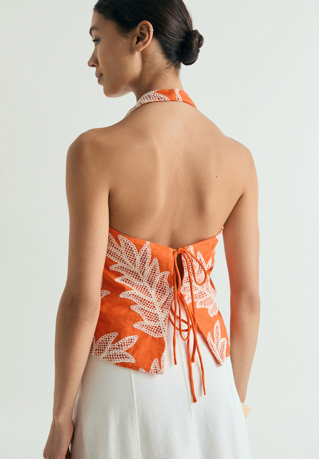 Top confeccionado en 100% algodón. Regular fit. Cuello halter. Detalles florales bordados. Cierre con botones frontales y lazadas ajustables en la parte trasera.