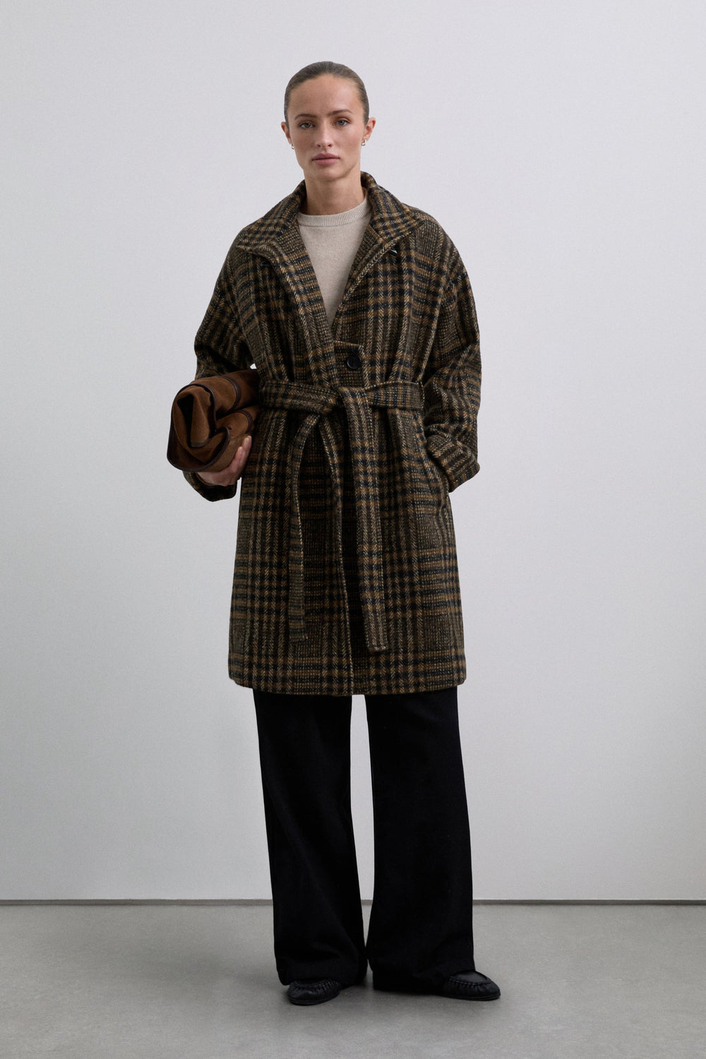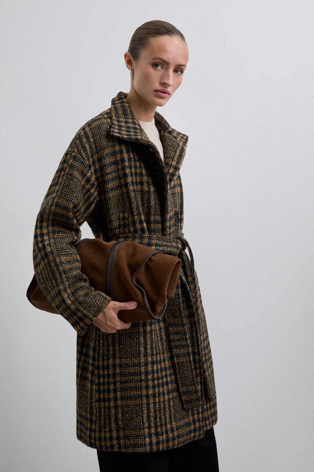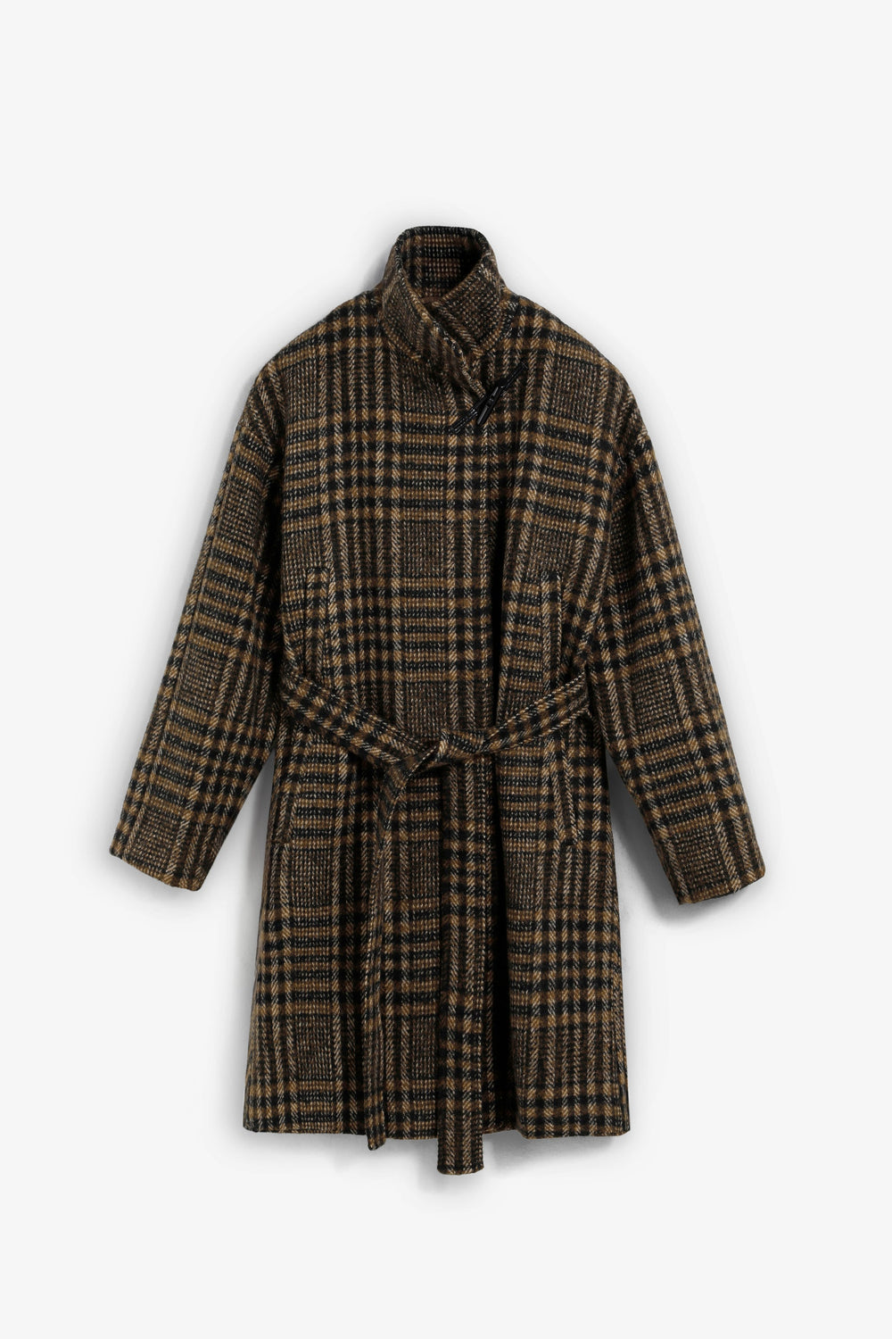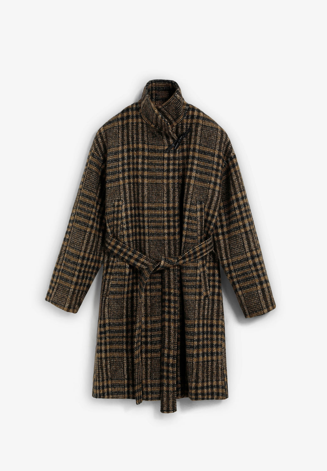 Abrigo corto con estampado de cuadros confeccionado en lana. Cuello subido. Botón tipo pasador en la parte superior. Cierre interior con 2 botones y cierre exterior con cinturón ajustable. Manga larga con puño doblado.