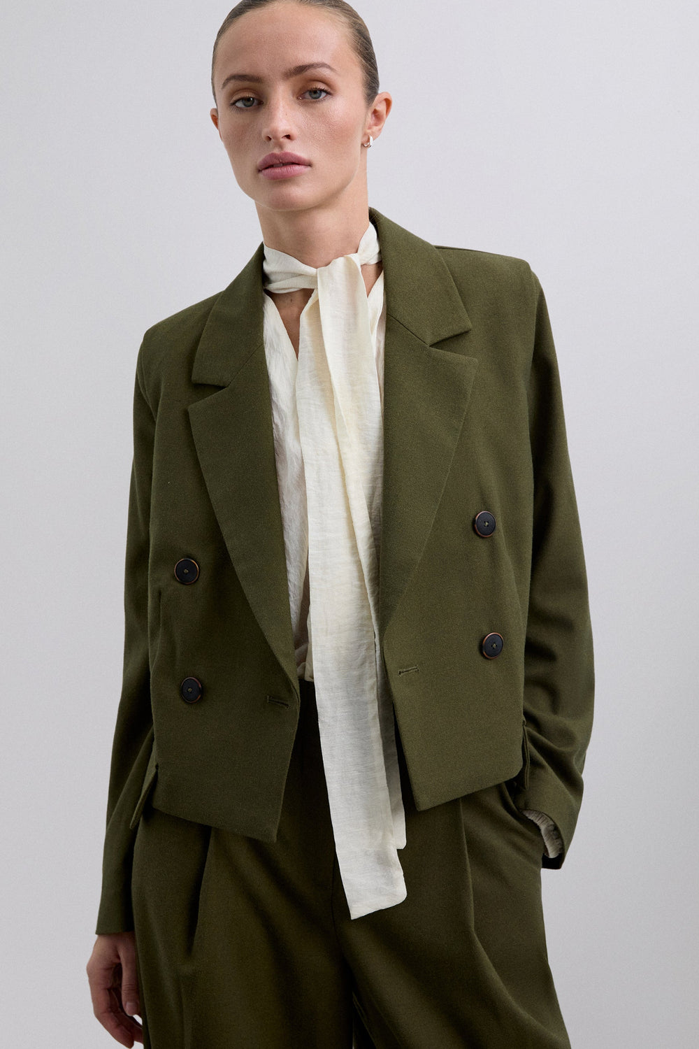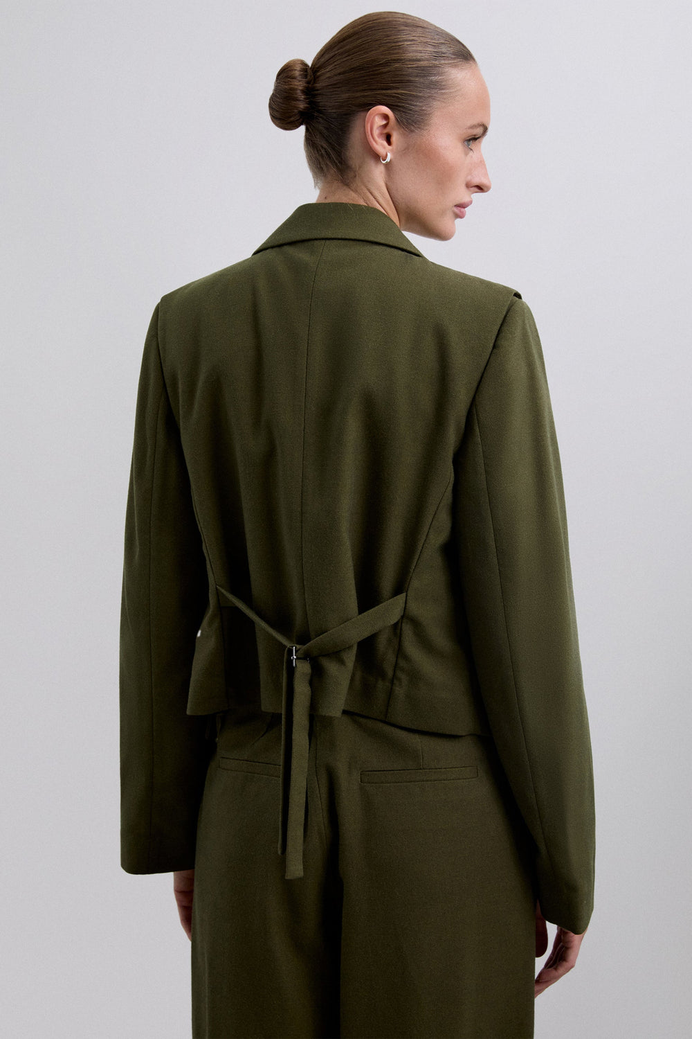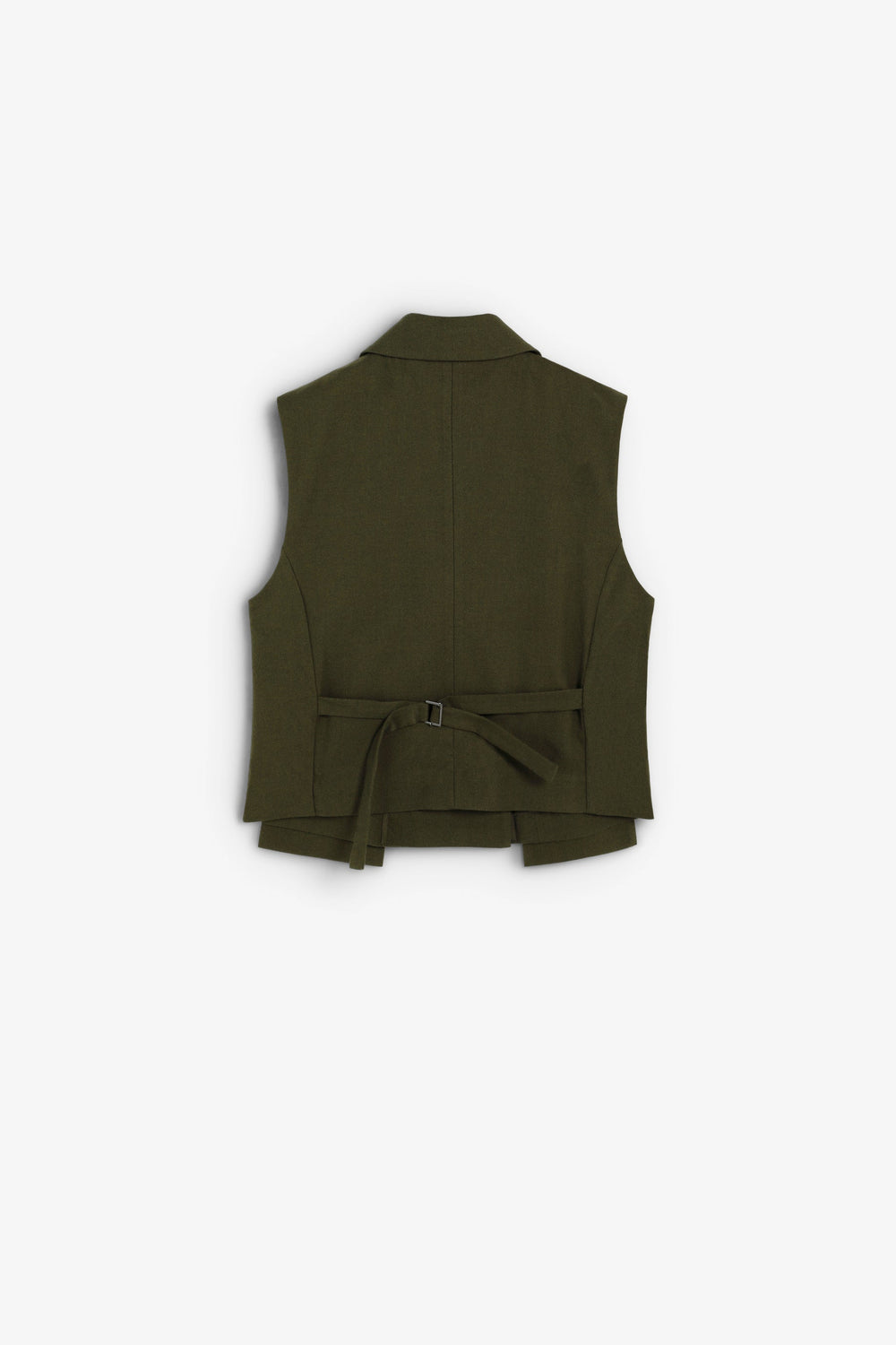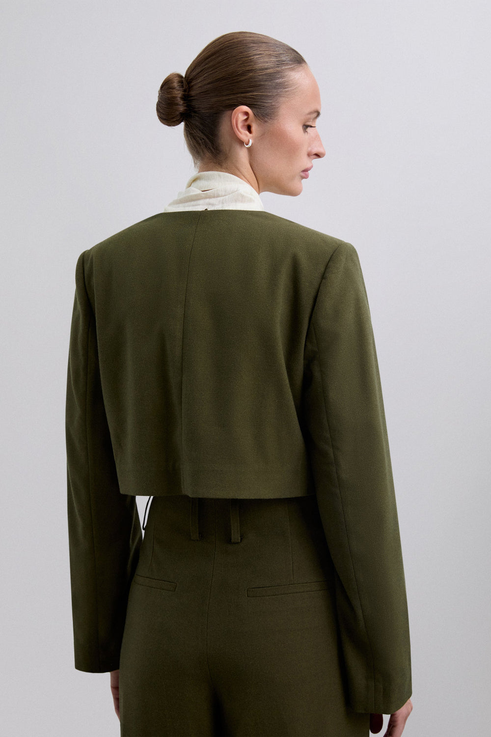 Blazer confeccionada en mezcla de viscosa. Desmontable en chaleco y torera. Chaleco con cuello de solapa, manga en sisa, cierre de botones y ajustable en parte trasera. Torera cropped, cuello sin solapa, manga larga y bolsillo en pecho de vivo.