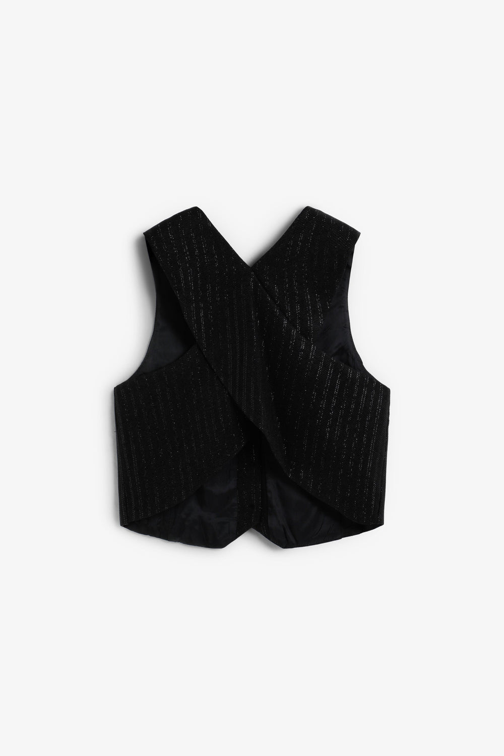 Chaleco confeccionado en material fluido con estampado de rayas de lúrex. Corte slim fit. Escote en V. Manga en sisa. Espalda cruzada. Cierre con botones.