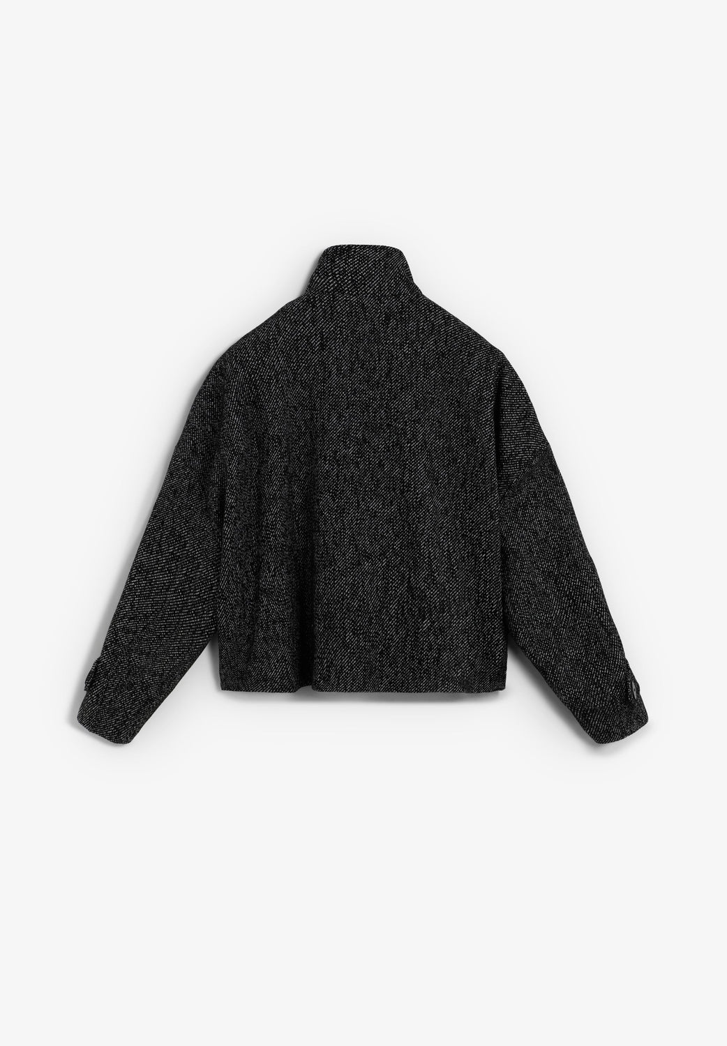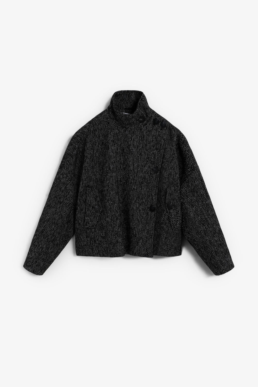 Chaqueta cruzada de sarga confeccionada en mezcla de lana. Regular fit. Ligeramente cropped. Cuello subido. Manga larga. Bolsillos laterales inclinados con tapeta.