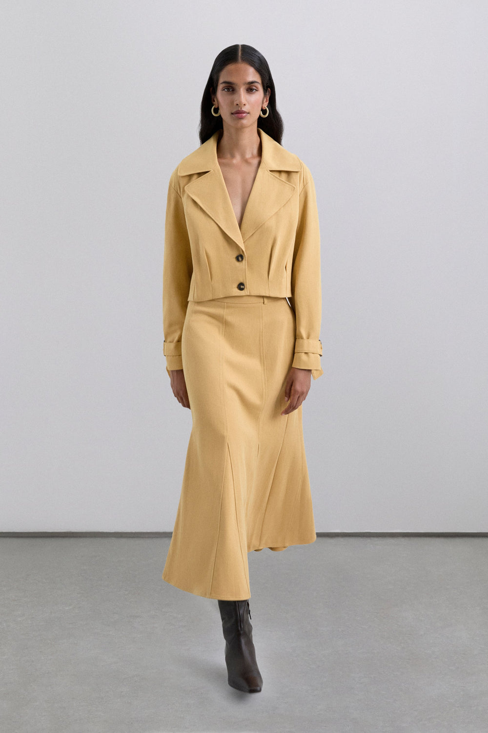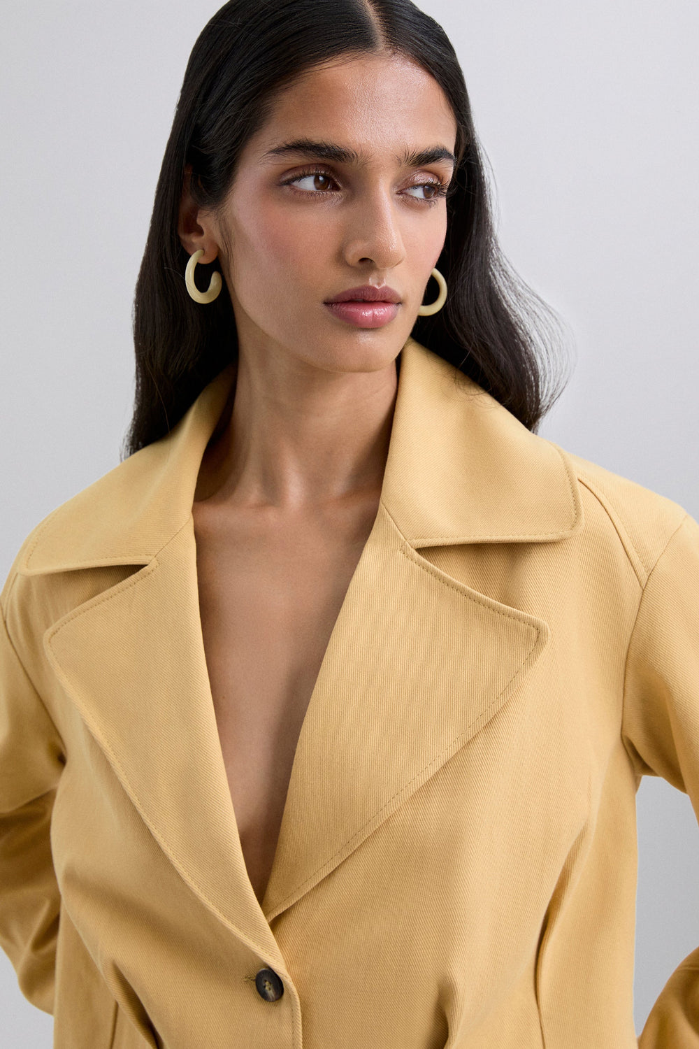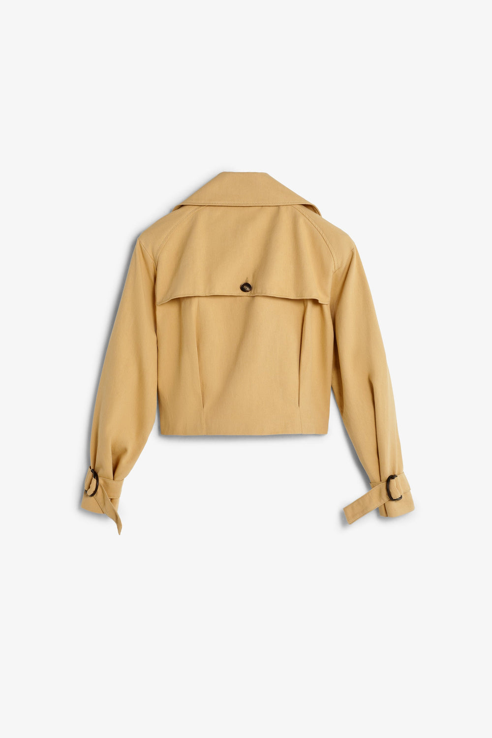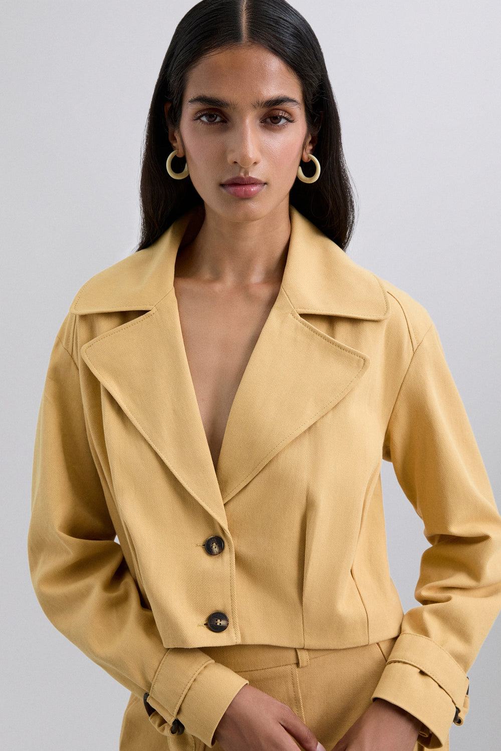 Chaqueta corta ligera confeccionada en 100% algodón con solapa de punta y cierre de botones en la parte frontal. Manga larga con terminación cerrada con botones.