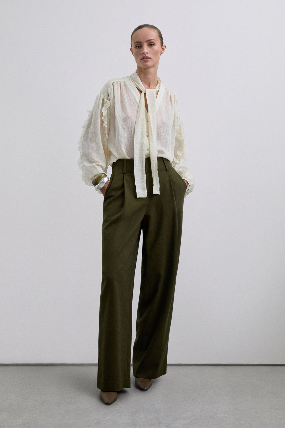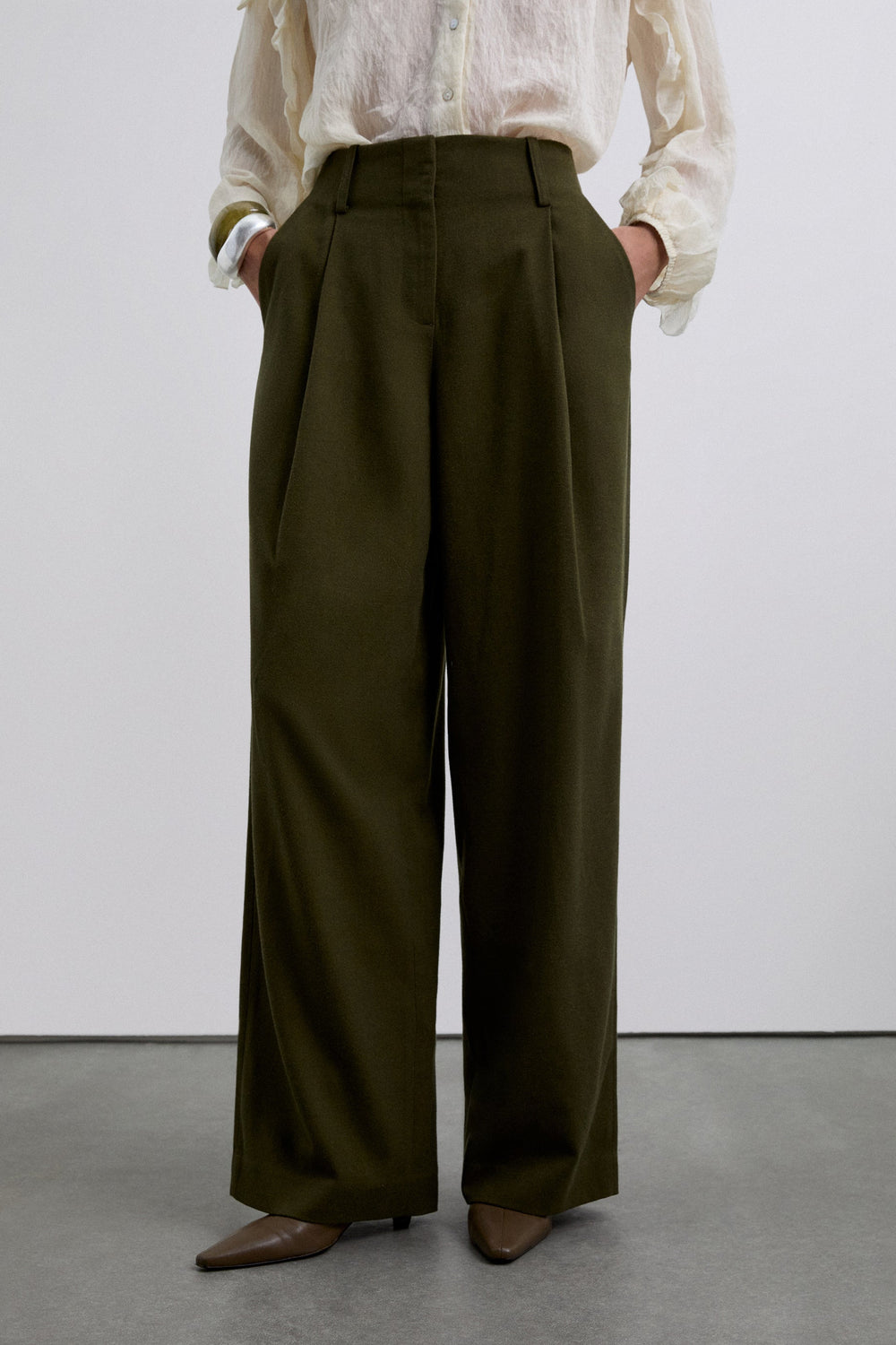 Pantalón de pinzas confeccionado en mezcla de viscosa ligeramente elástico. Regular fit. Full Length. Trabillas en cintura. Cierre con cremallera y enganche oculto. Bolsillos laterales inclinados y de vivo traseros.