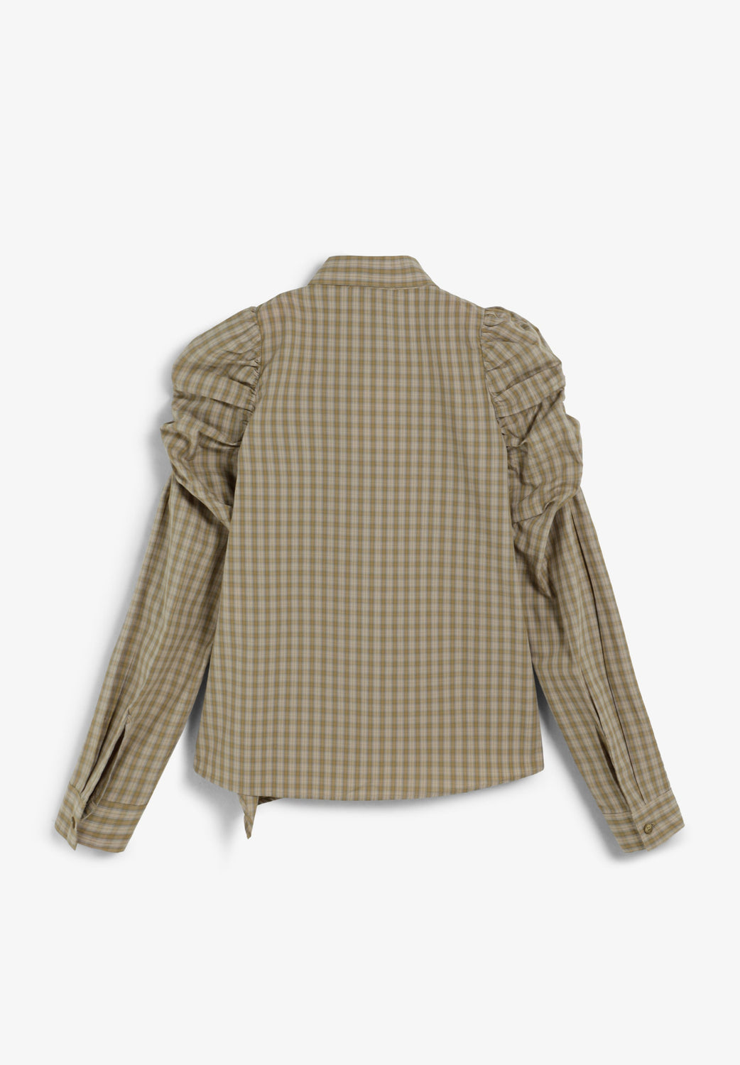 Camisa estampada confeccionada en 100% algodón. Manga larga abullonada. Bajo asimétrico. Cierre mediante abotonadura en frontal.