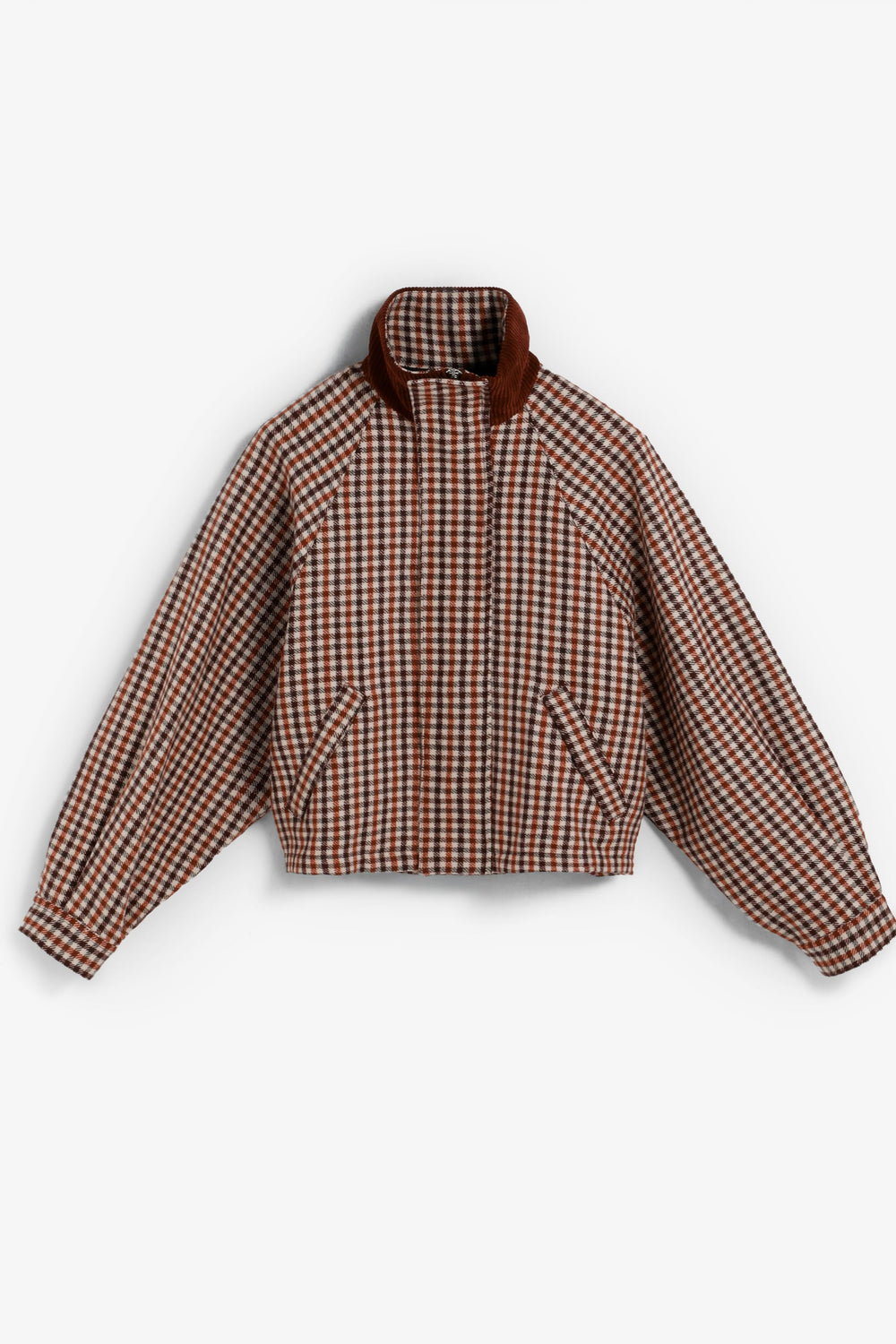 Chaqueta tipo bomber confeccionada en tejido con mezcla de lana con estampado de cuadros. Ligeramente oversize, cierre con cremallera y cuello subido con detalle en pana. Manga larga ranglan terminada en puño con botón y bolsillos laterales. Cierre con cremallera oculta por tapeta y botones de snap.