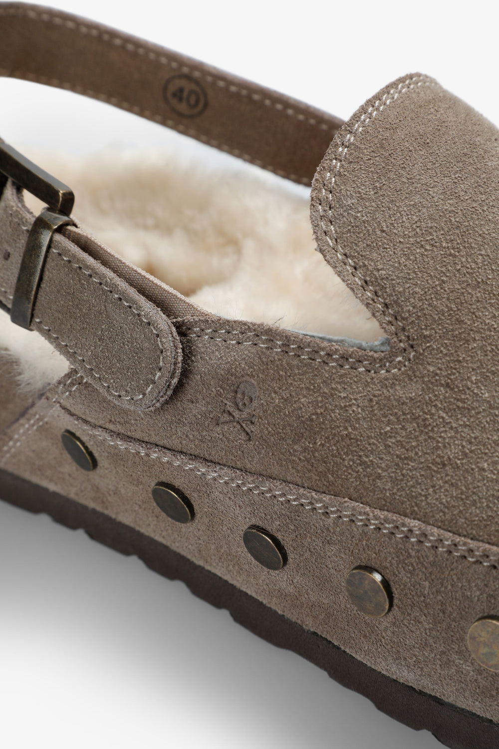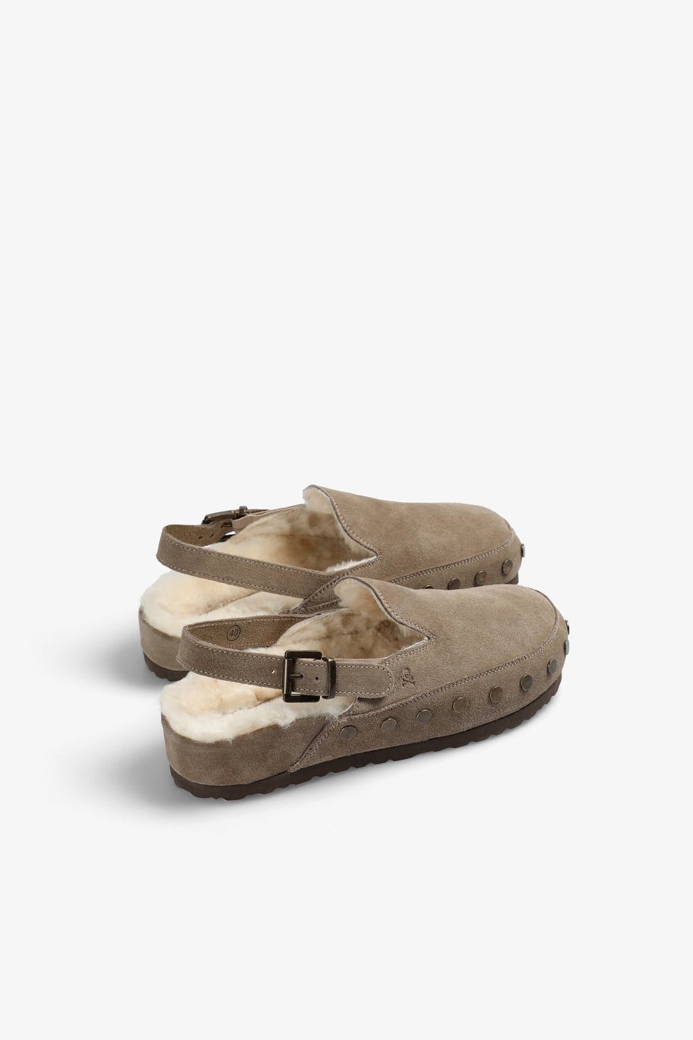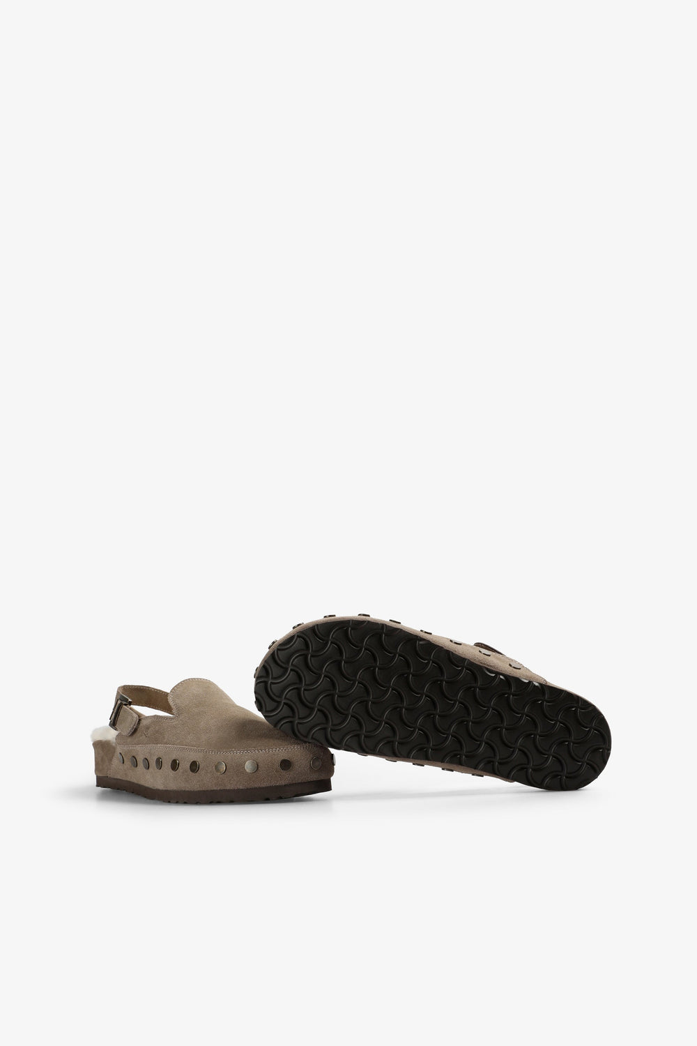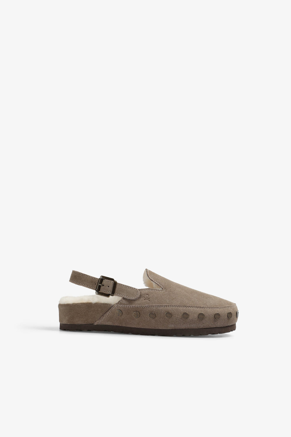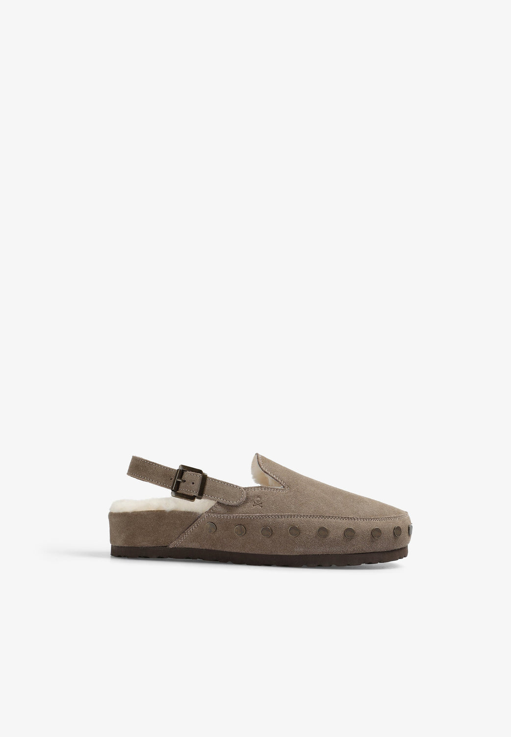 Zuecos confeccionados en 100% piel. Interior de 100% pelo. Detalle de tachuelas. Cierre ajustable mediante tira y hebilla. Logotipo grabado a tono.