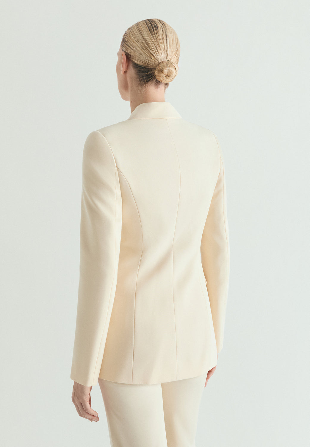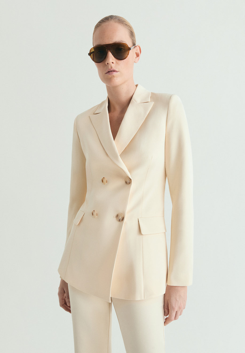 Blazer lisa confeccionada en material ligeramente elástico. Corte regular fit. Cuello con solapas, manga larga, cruzada y cierre mediante botones. Bolsillos delanteros.