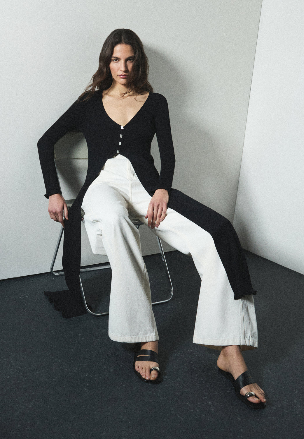Cardigan largo confeccionado en tejido de punto acanalado. Escote en pico. Mangas largas. Cierre frontal.