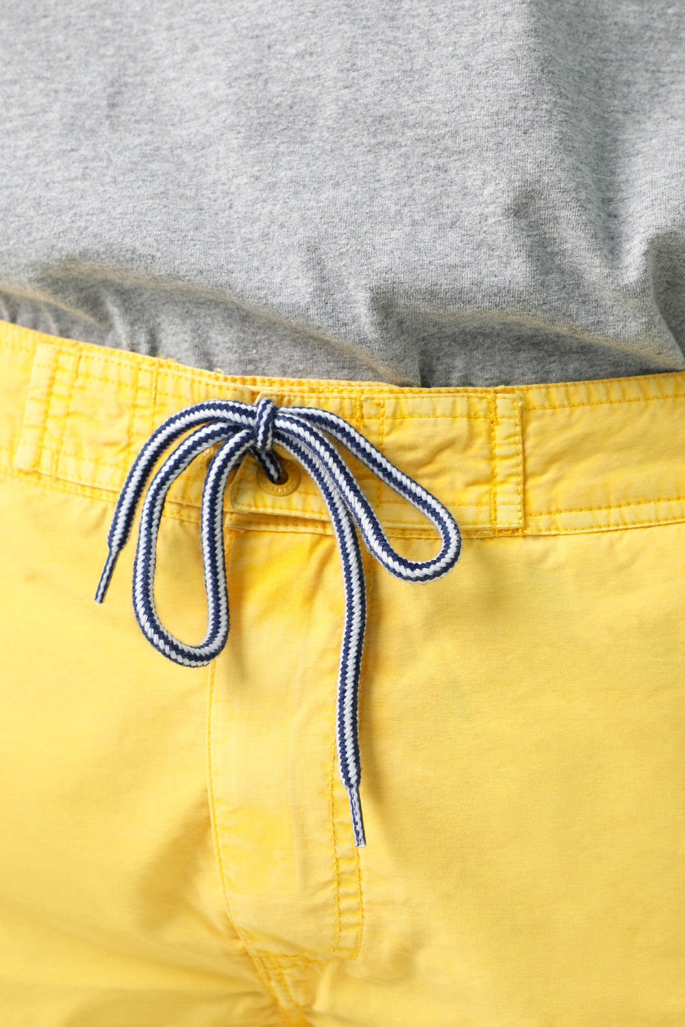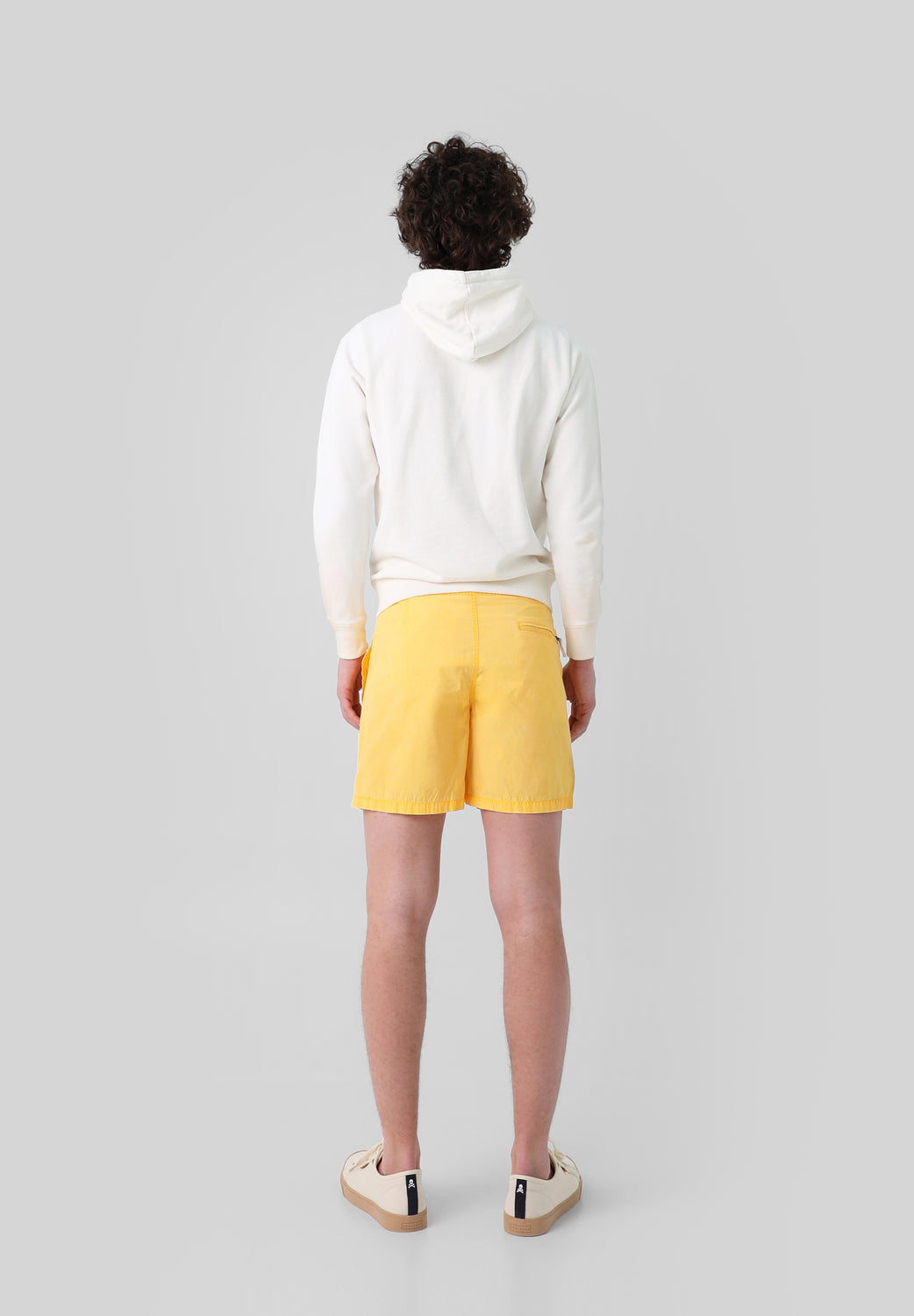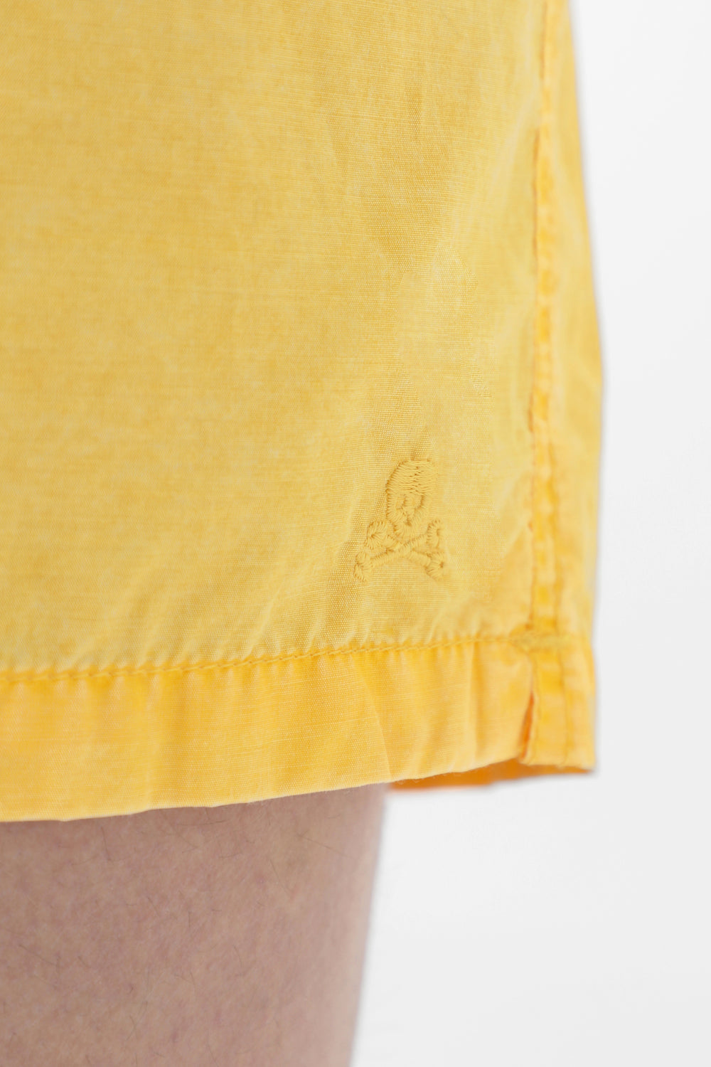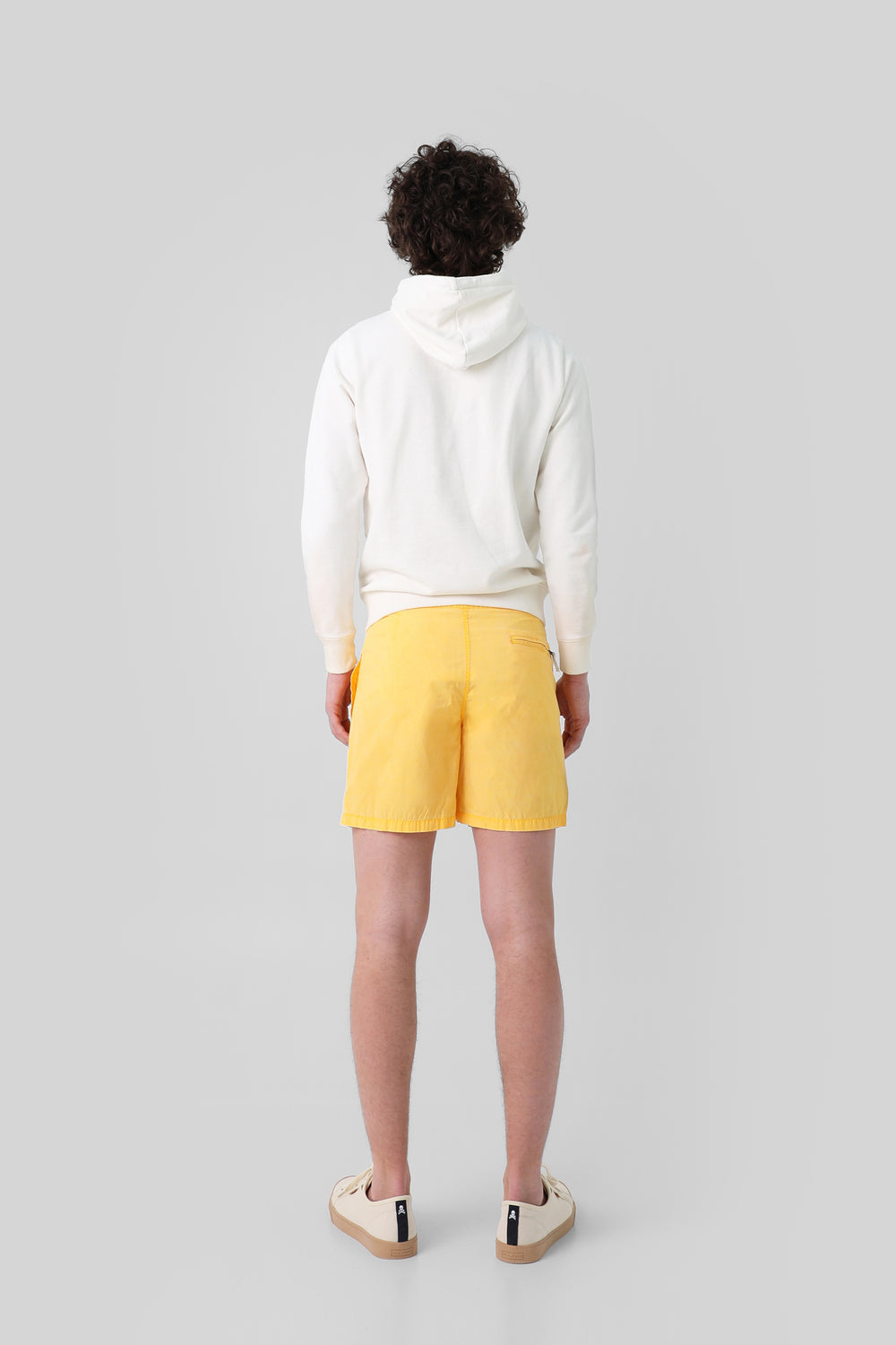 Bañador confeccionado en tejido liso de efecto delavé. Corte surfero, cierre con cordón ajustable y dos bolsillos laterales. Como detalle tiene un parche bordado en el bajo izquierdo.