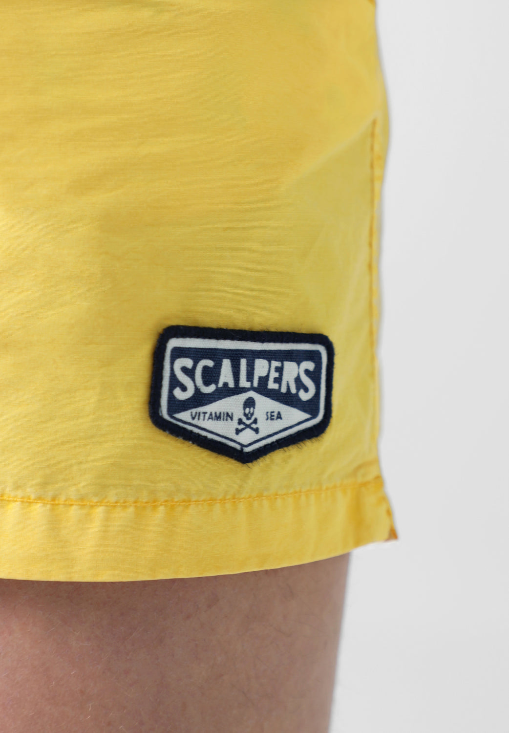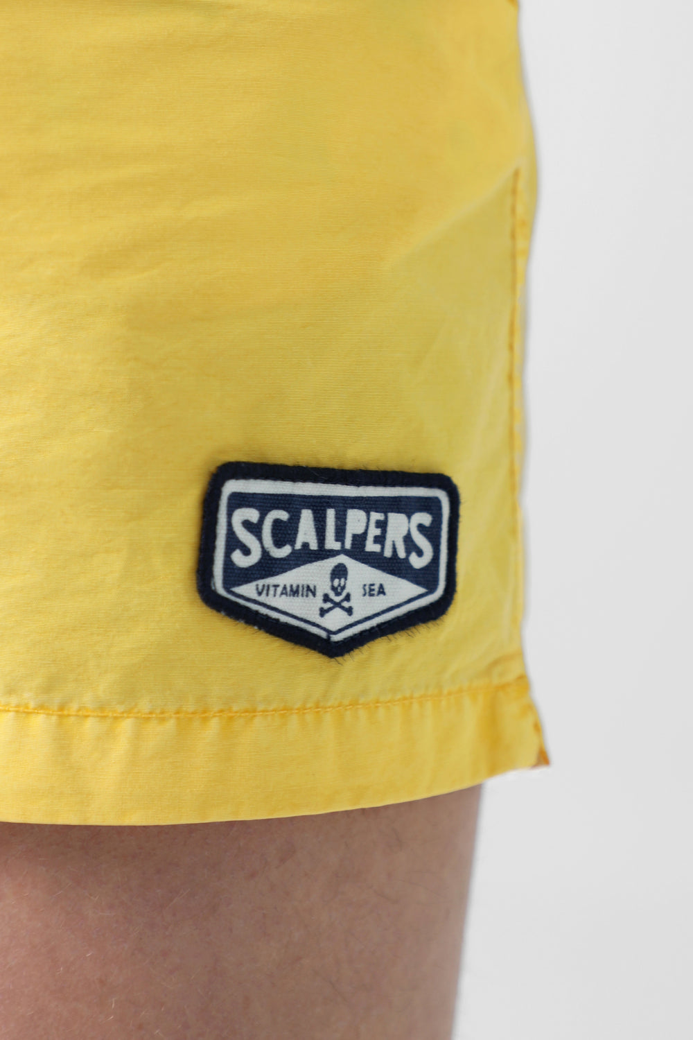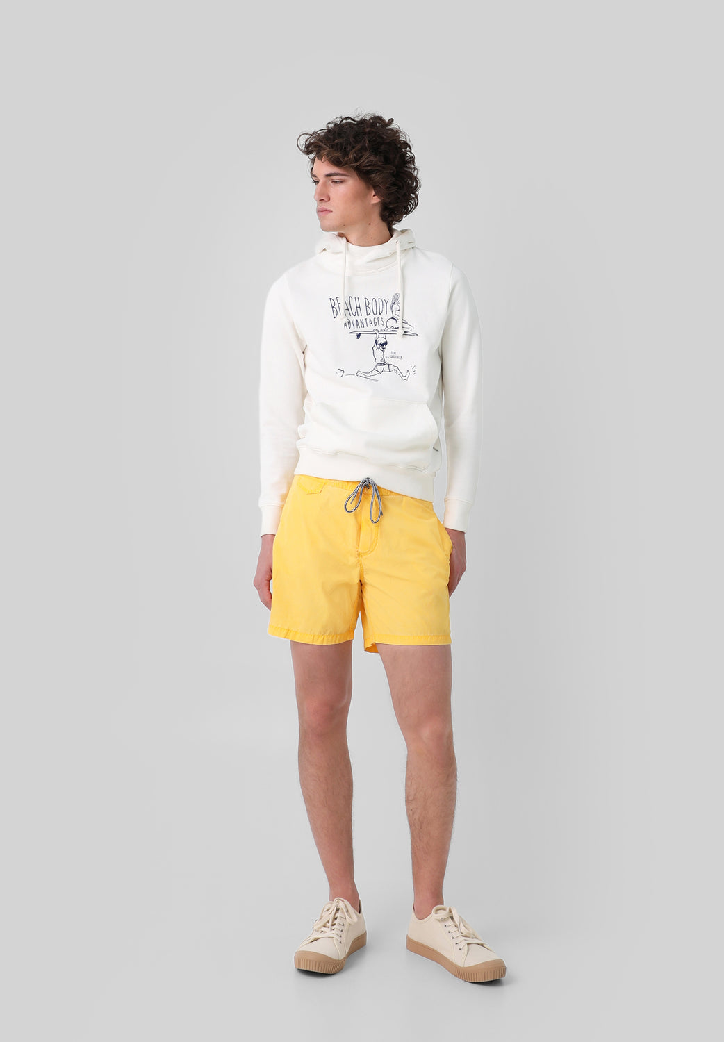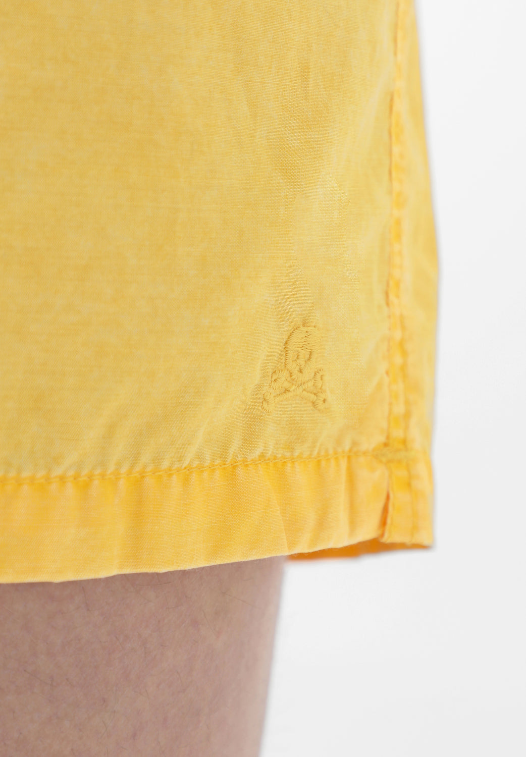 Bañador confeccionado en tejido liso de efecto delavé. Corte surfero, cierre con cordón ajustable y dos bolsillos laterales. Como detalle tiene un parche bordado en el bajo izquierdo.