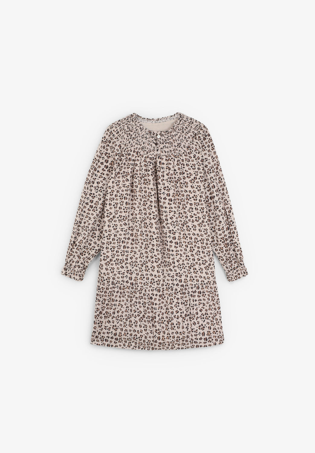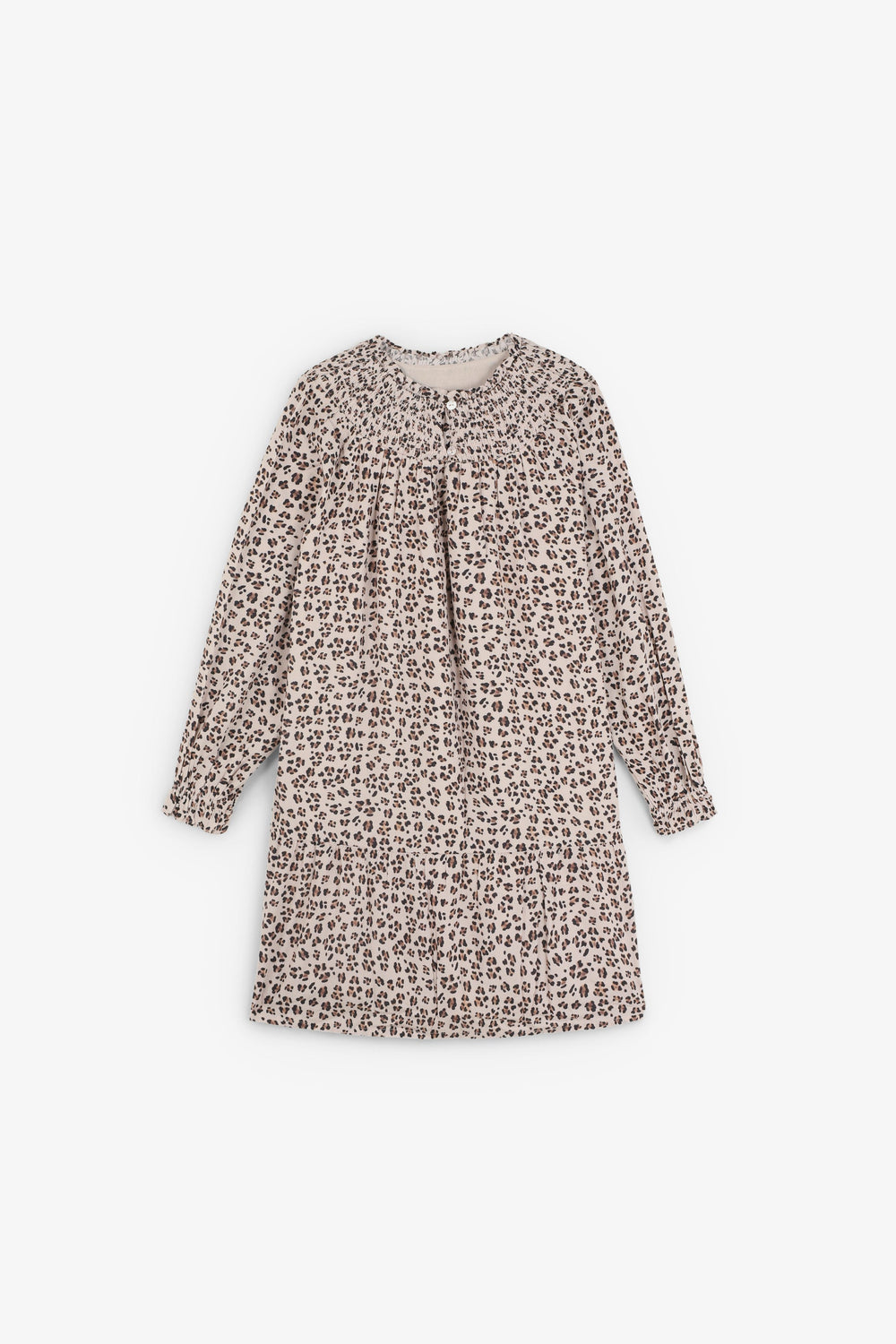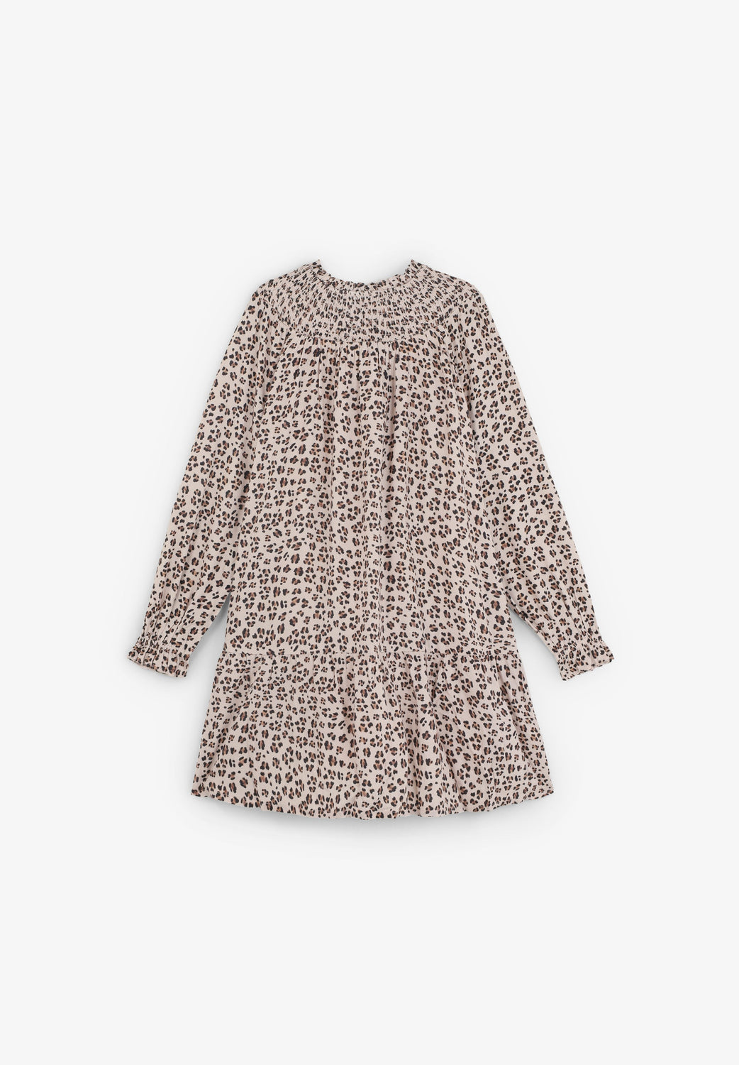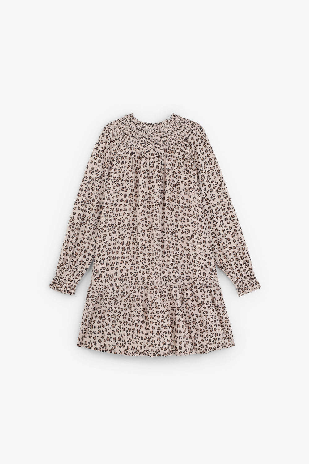 Vestido mini confeccionado en 100% viscosa. Animal print. Manga larga ligeramente abullonada. Cuello en nido de abeja.