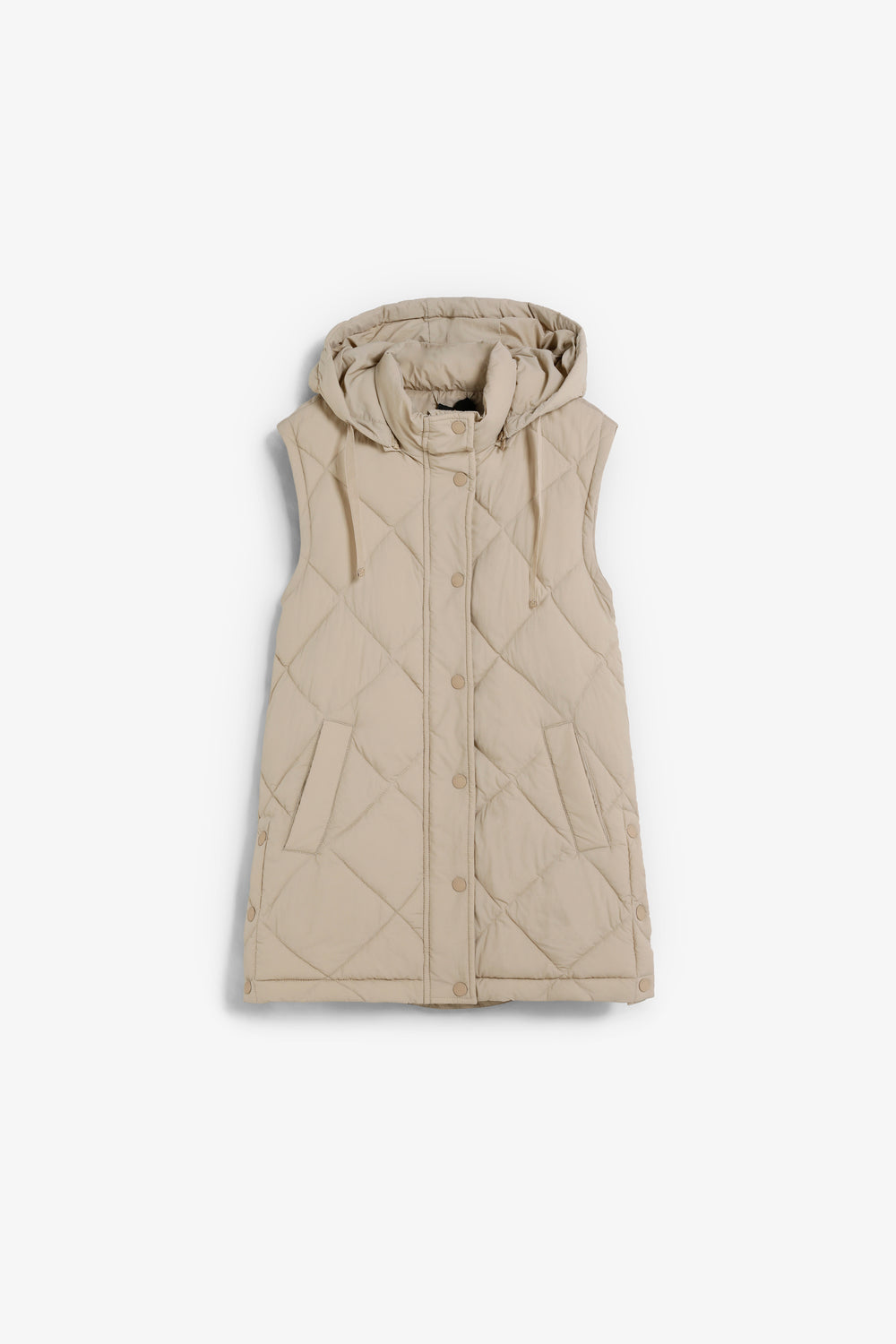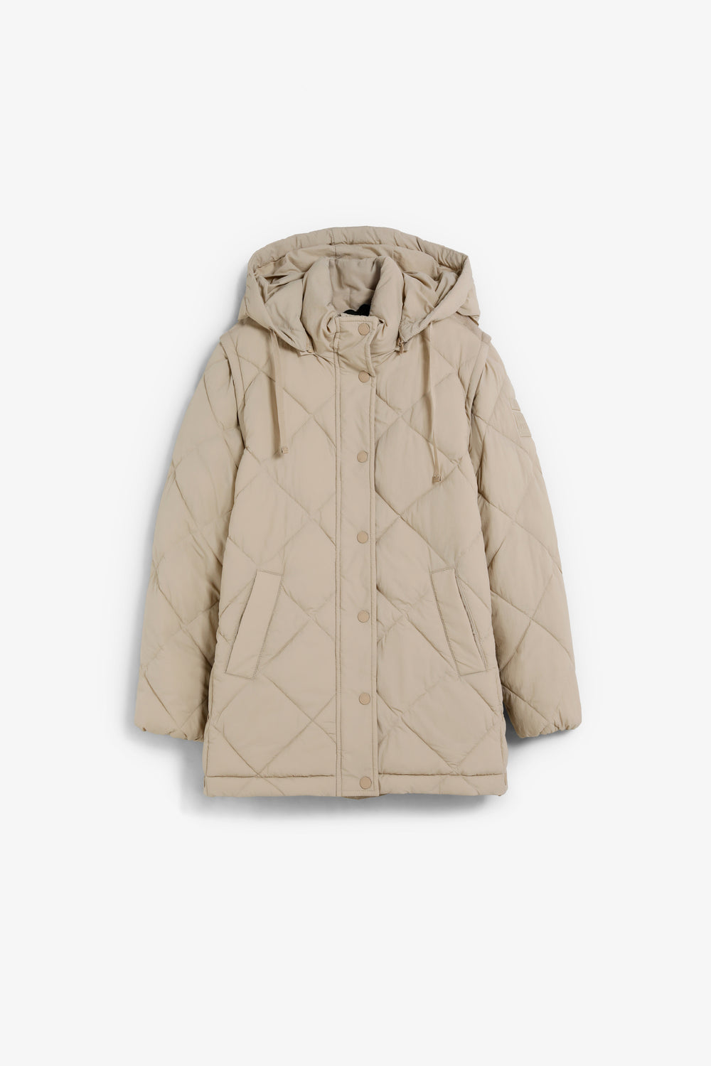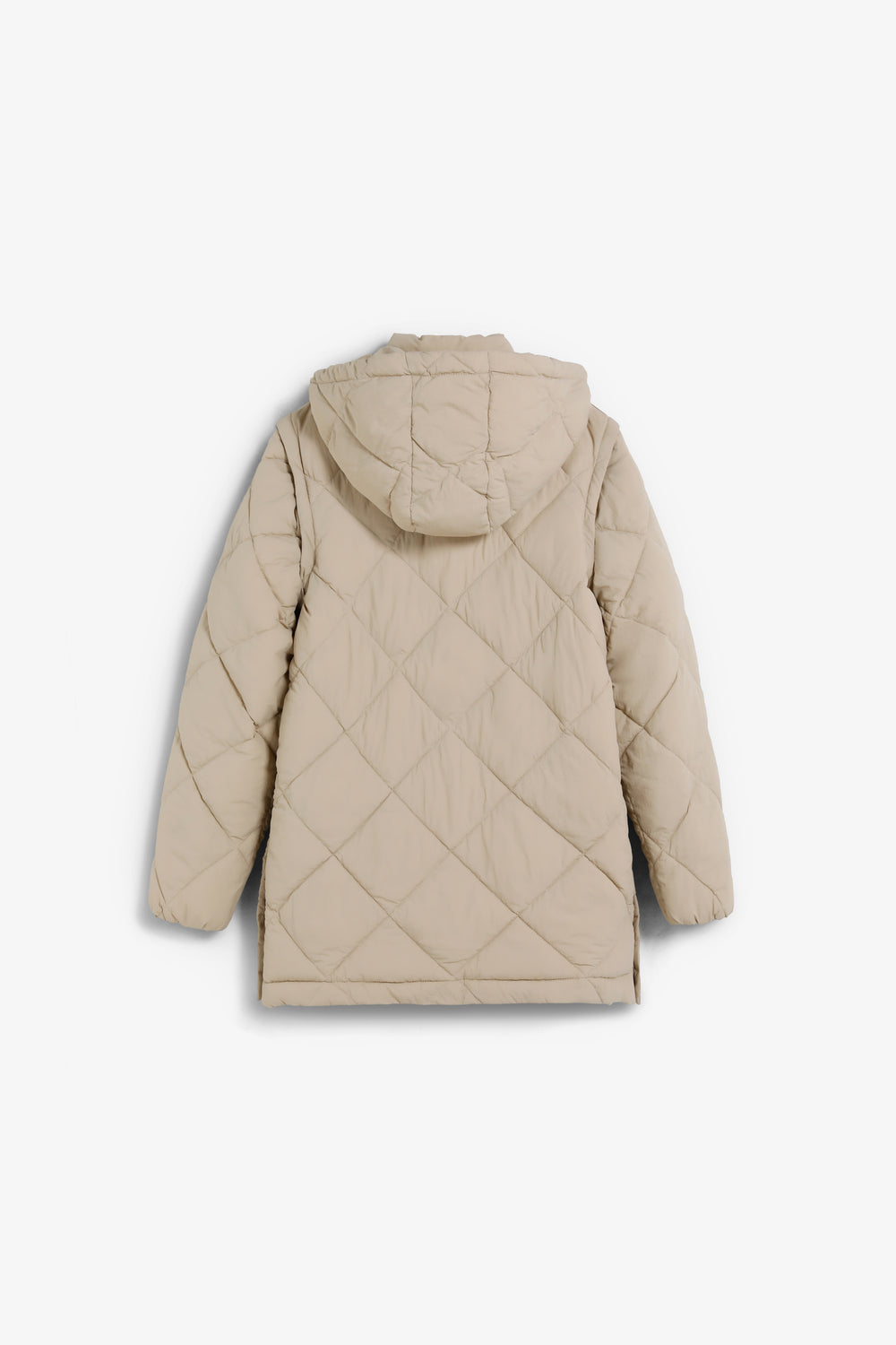 Abrigo acolchado. Capucha y Mangas desmontables. Cierre cremallera frontal oculta por solapa con cierre botones tipo presión. Bolsillos laterales. Forro interior reciclado. Detalle de logo en espalda.