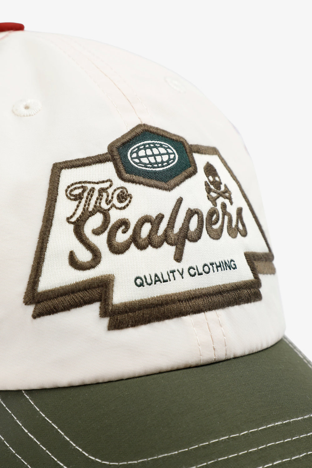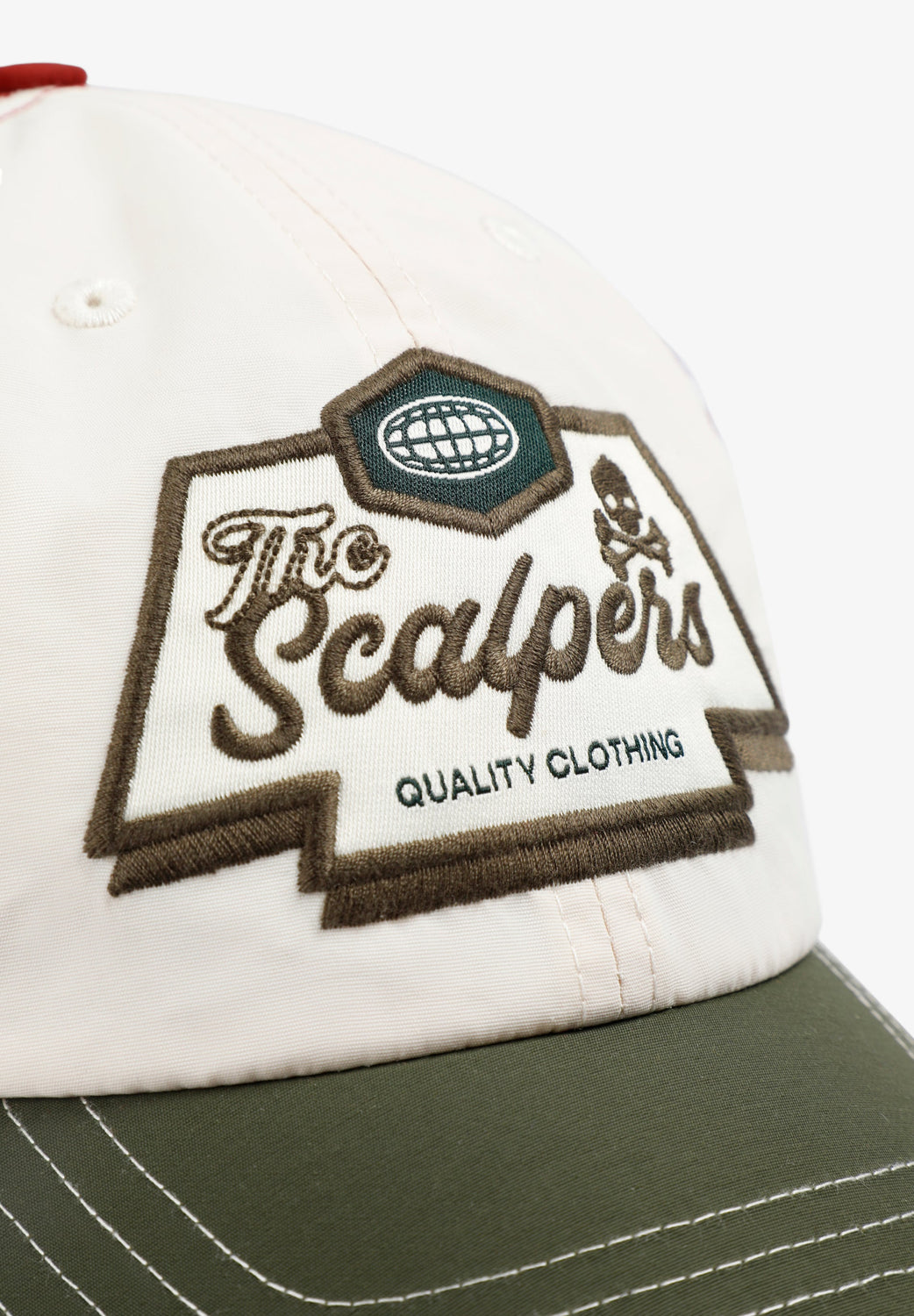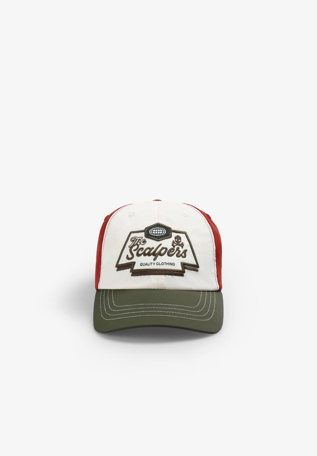 Gorra tricolor confeccionada en 100% nylon. Cierre ajustable trasero y print bordado delantero con logo y calavera a contraste. Detalle etiqueta con logo parte trasera.