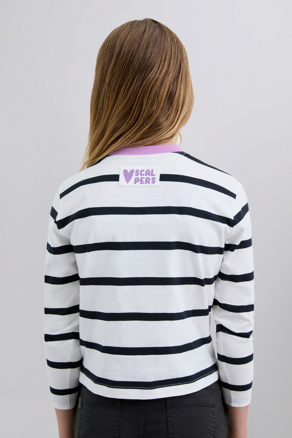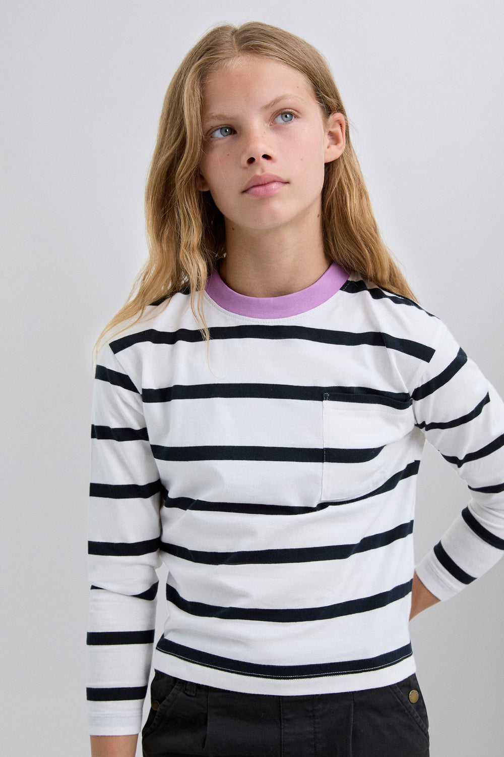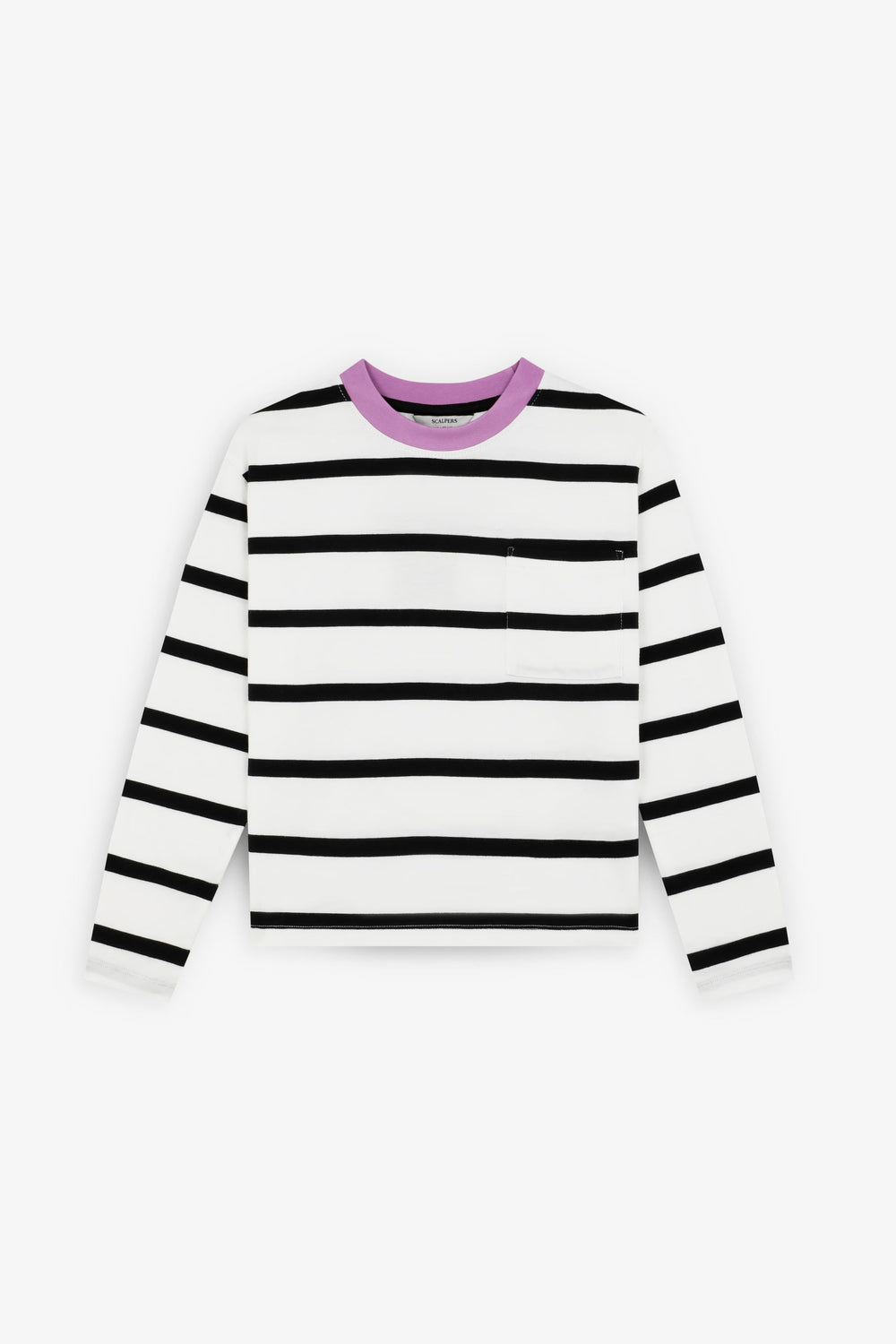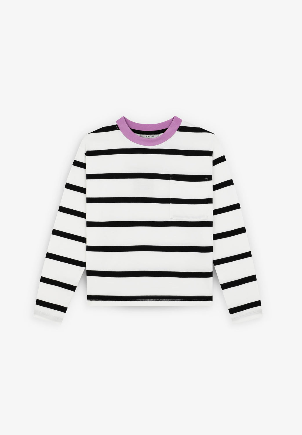 Camiseta de rayas confeccionada en 100% algodón BCI. Corte regular fit, cuello redondo a contraste y manga larga. Detalle bolsillo en pecho y etiqueta logo en parte trasera.