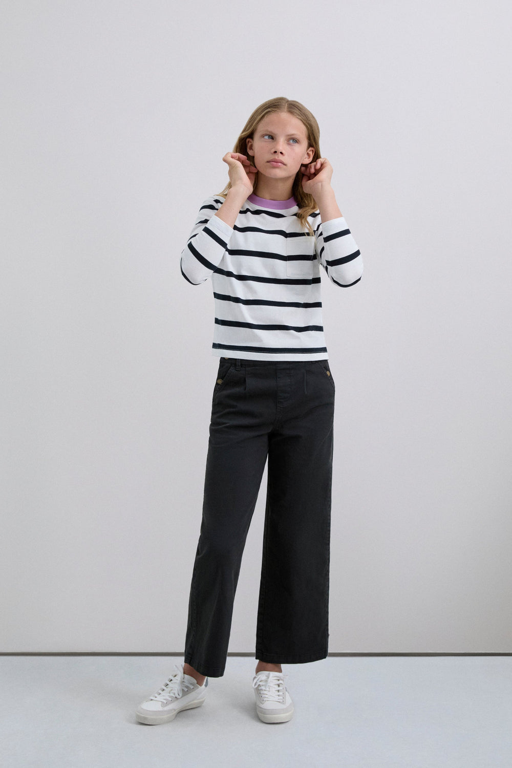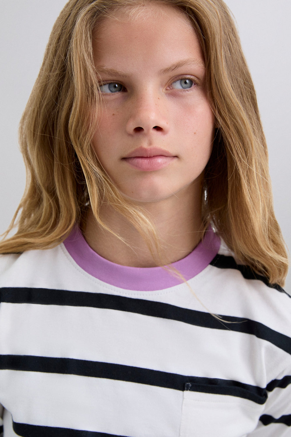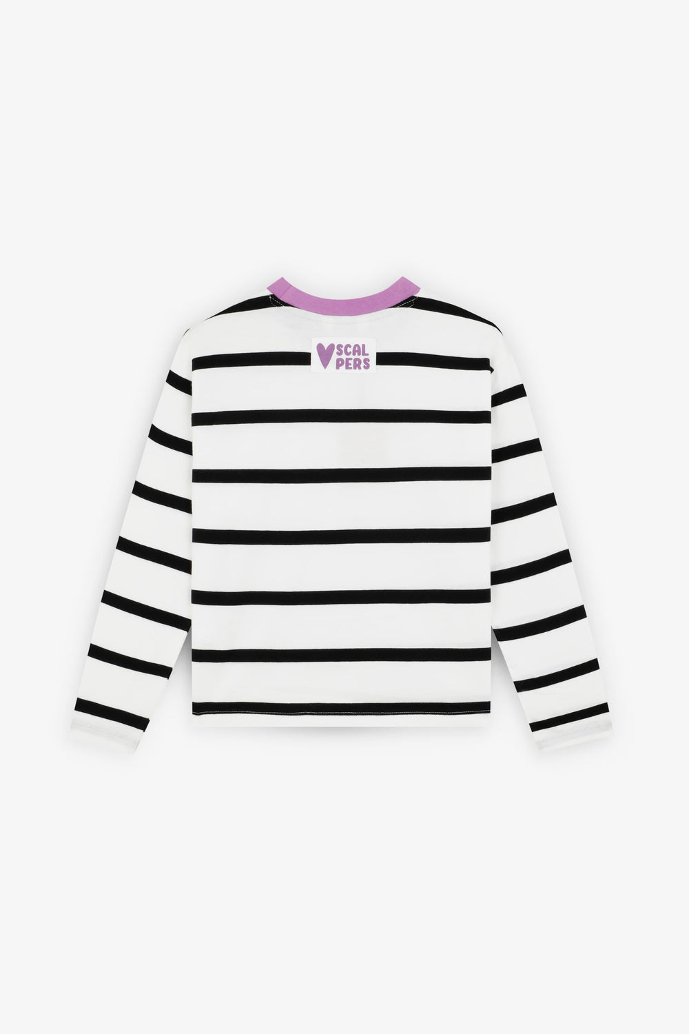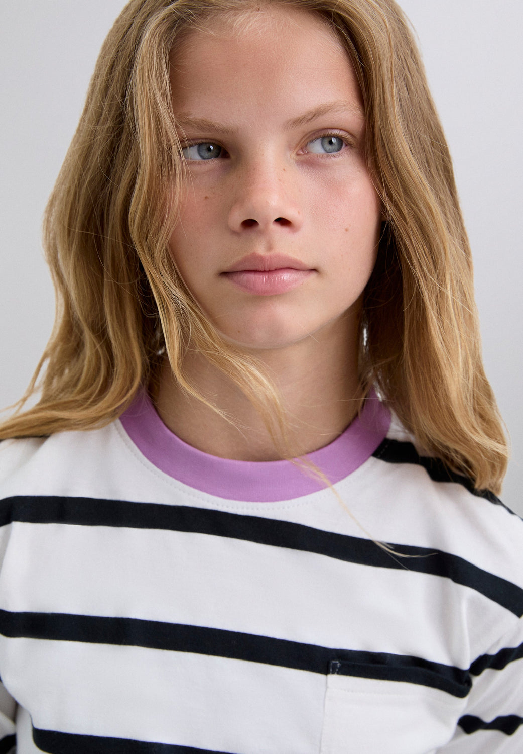Camiseta de rayas confeccionada en 100% algodón BCI. Corte regular fit, cuello redondo a contraste y manga larga. Detalle bolsillo en pecho y etiqueta logo en parte trasera.