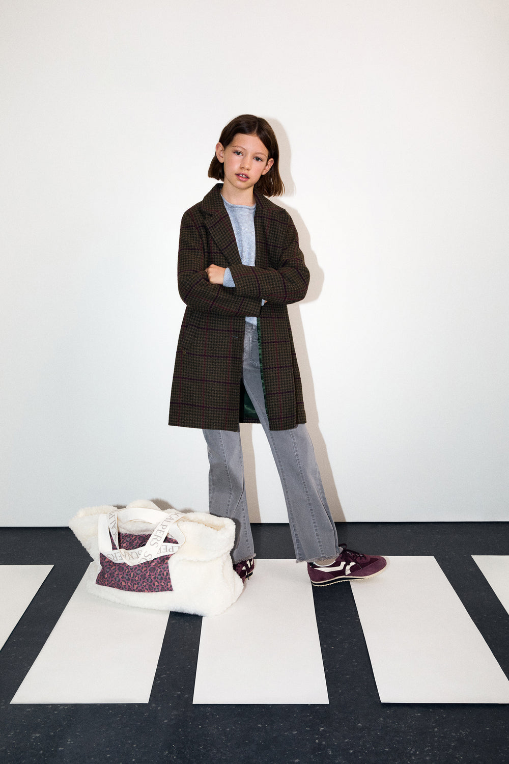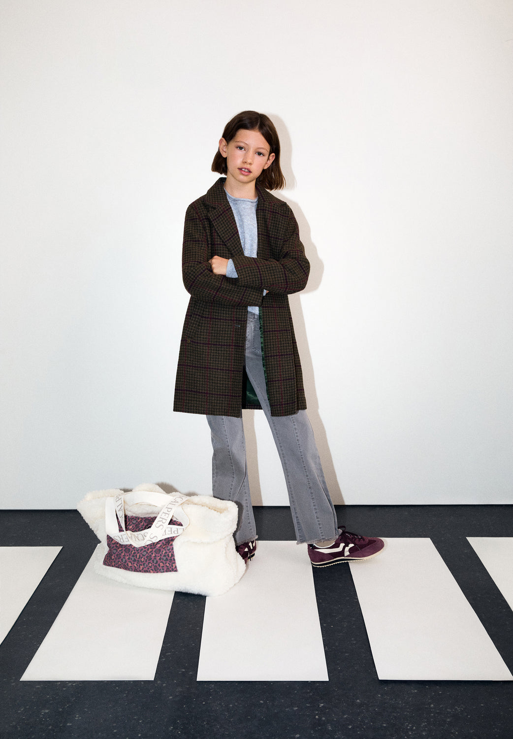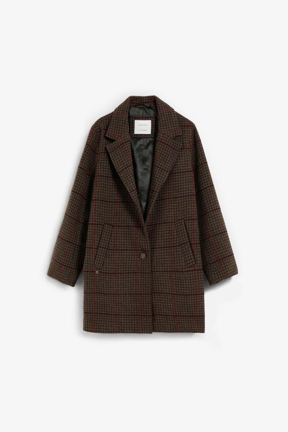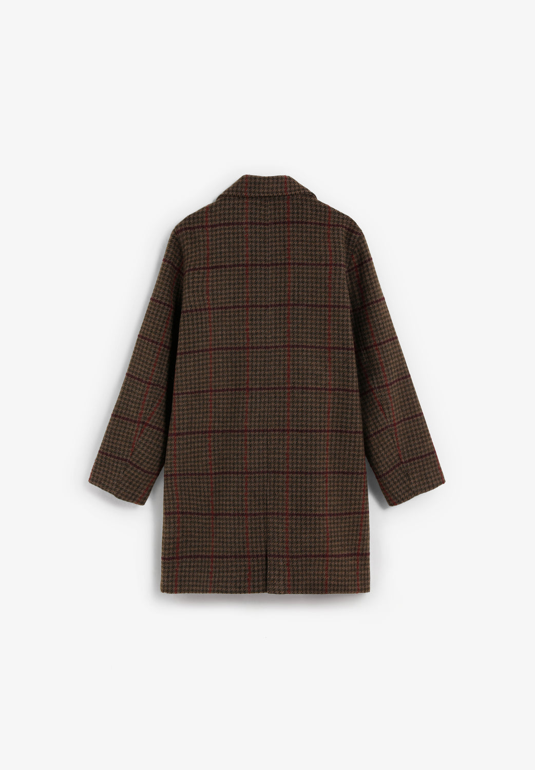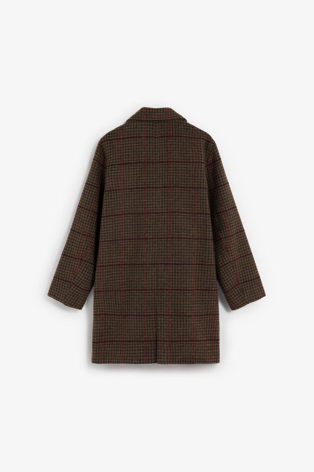Abrigo de paño de cuadros. Cuello con solapas. Cierre con botones. Manga larga. Bolsillos insertados con tapeta.