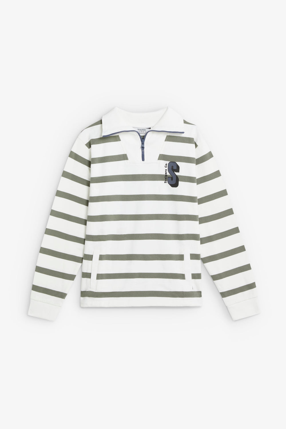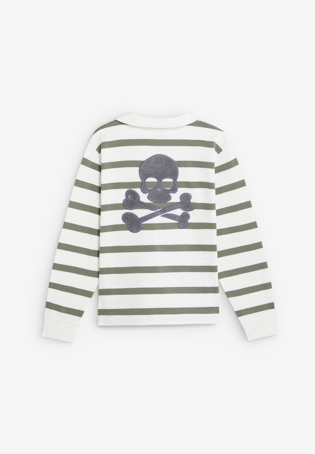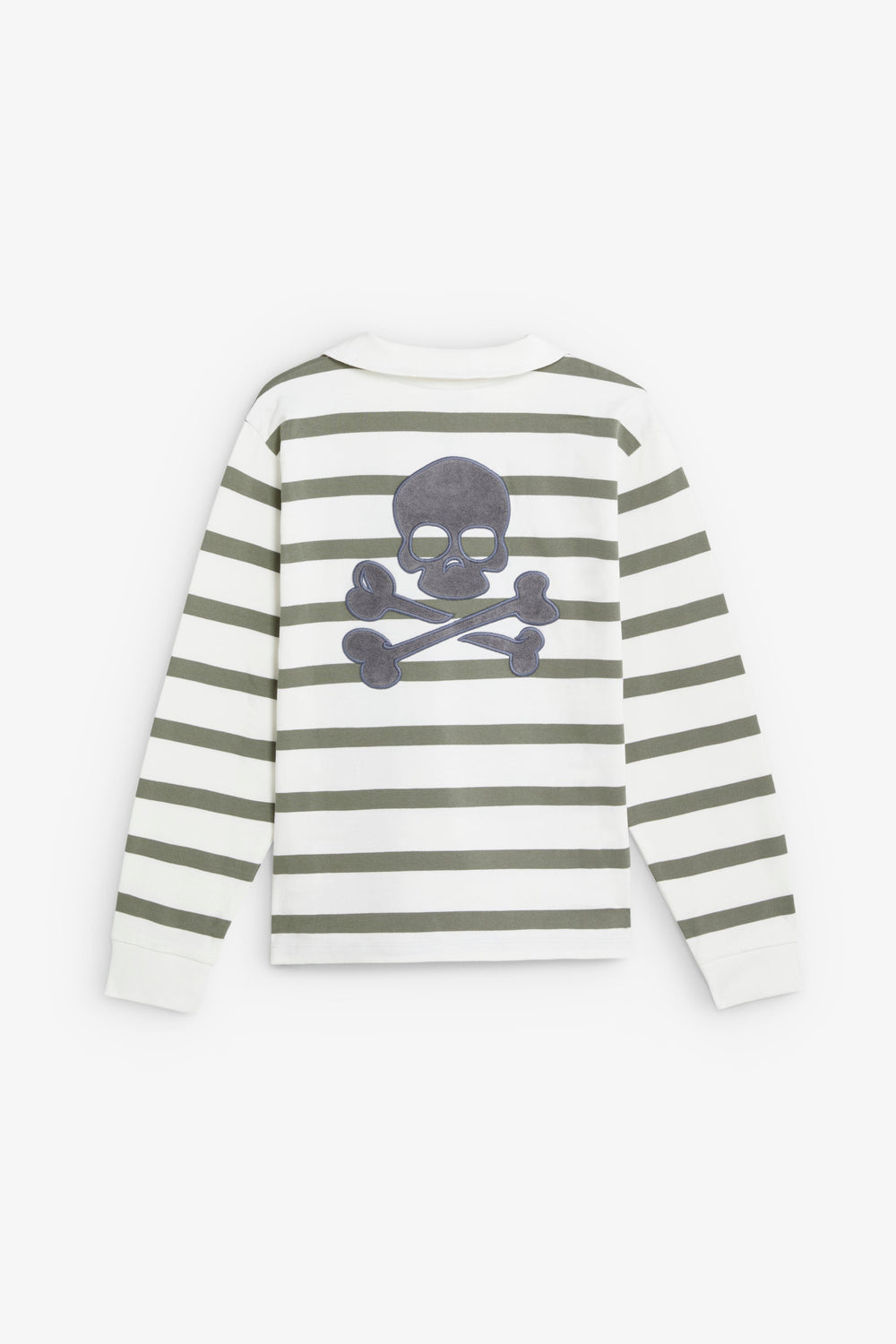 Sudadera de rayas confeccionada en 100% algodón BCI. Cuello polo con media cremallera. Corte Regular Fit. Manga larga. Dos bolsillos frontales. Print con logo en pecho y calavera bordada a contraste en espalda.