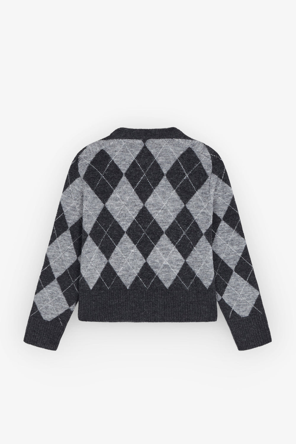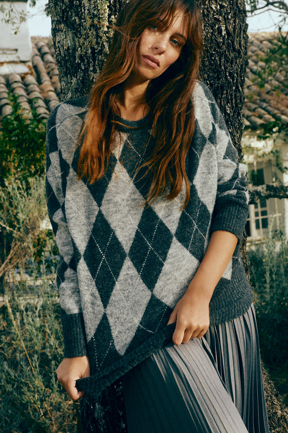 Jersey de rombos confeccionado en mezcla con lana. Regular fit. Cuello redondo y manga larga con acabados en rib.