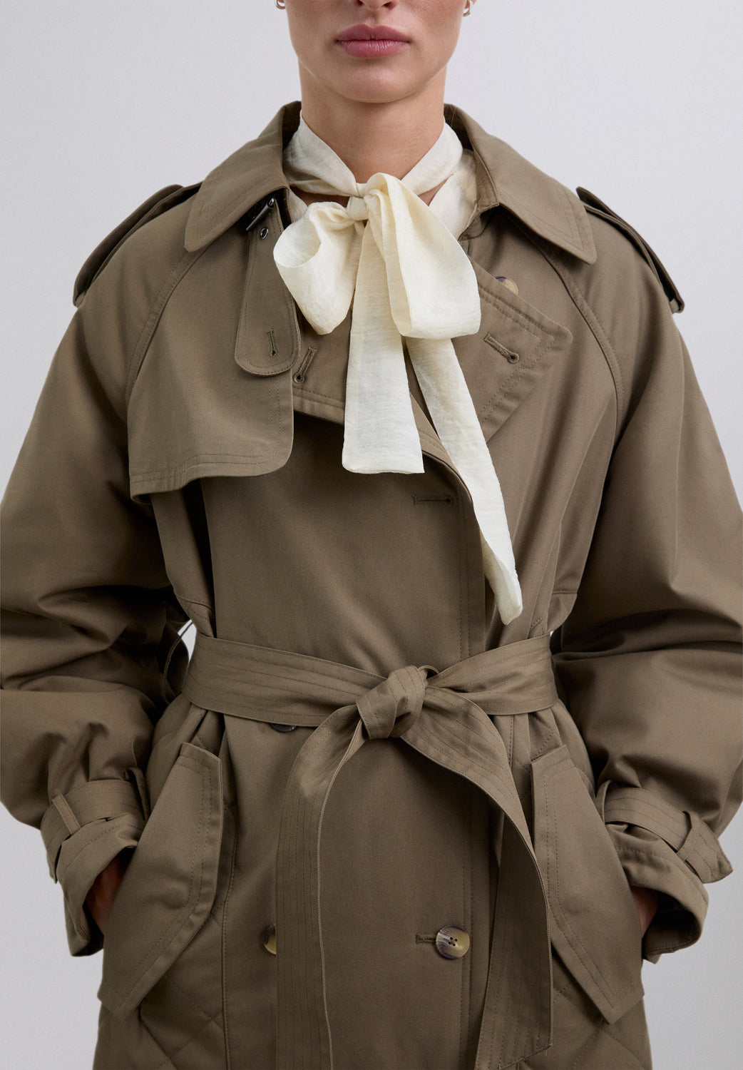 Abrigo trench acolchado e impermeable confeccionado en algodón. Detalle acolchado en la parte inferior. Mangas ligeramente oversize y trabillas en los puños. Cierre frontal con botones y cinturón ajustable.