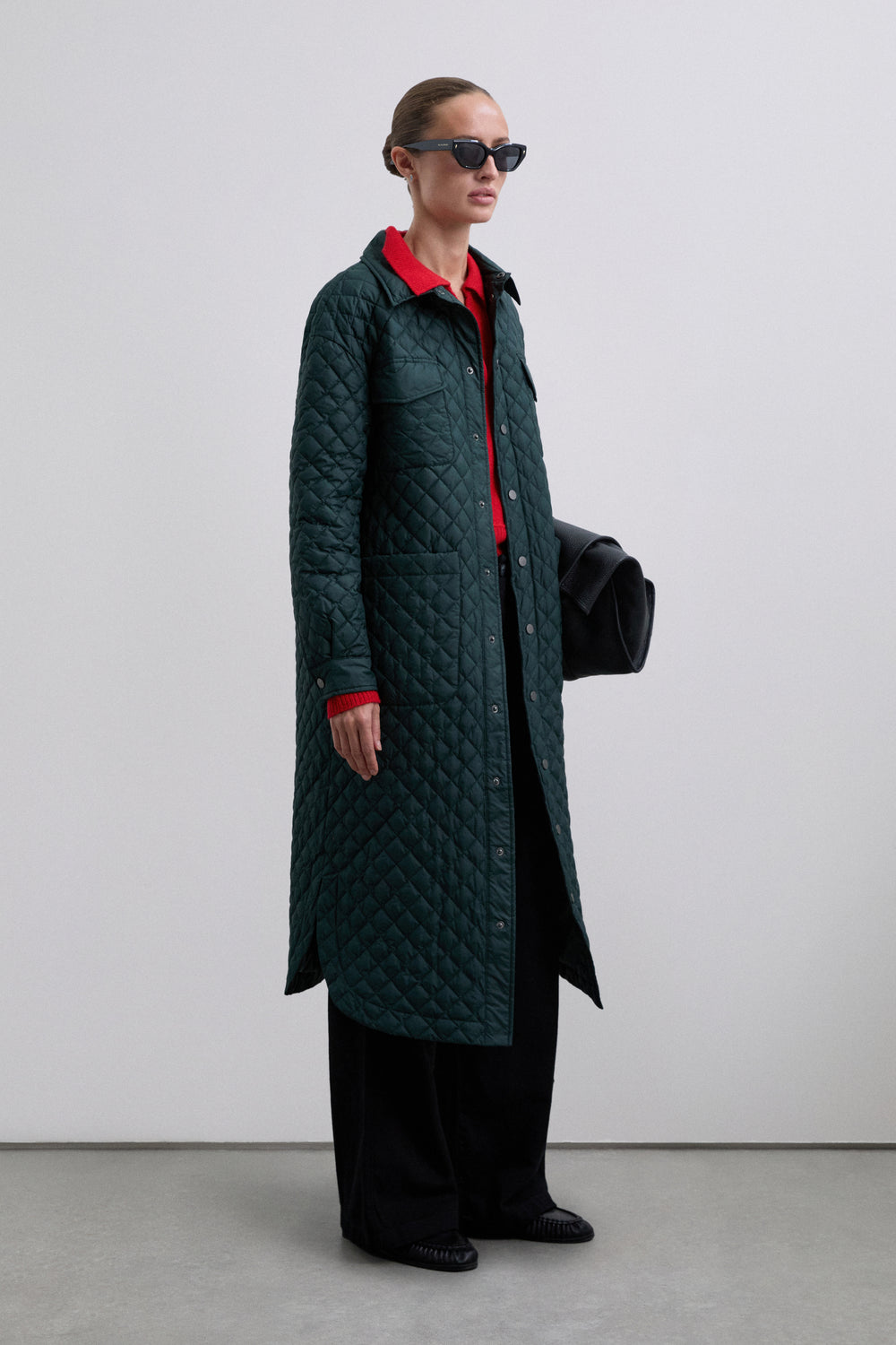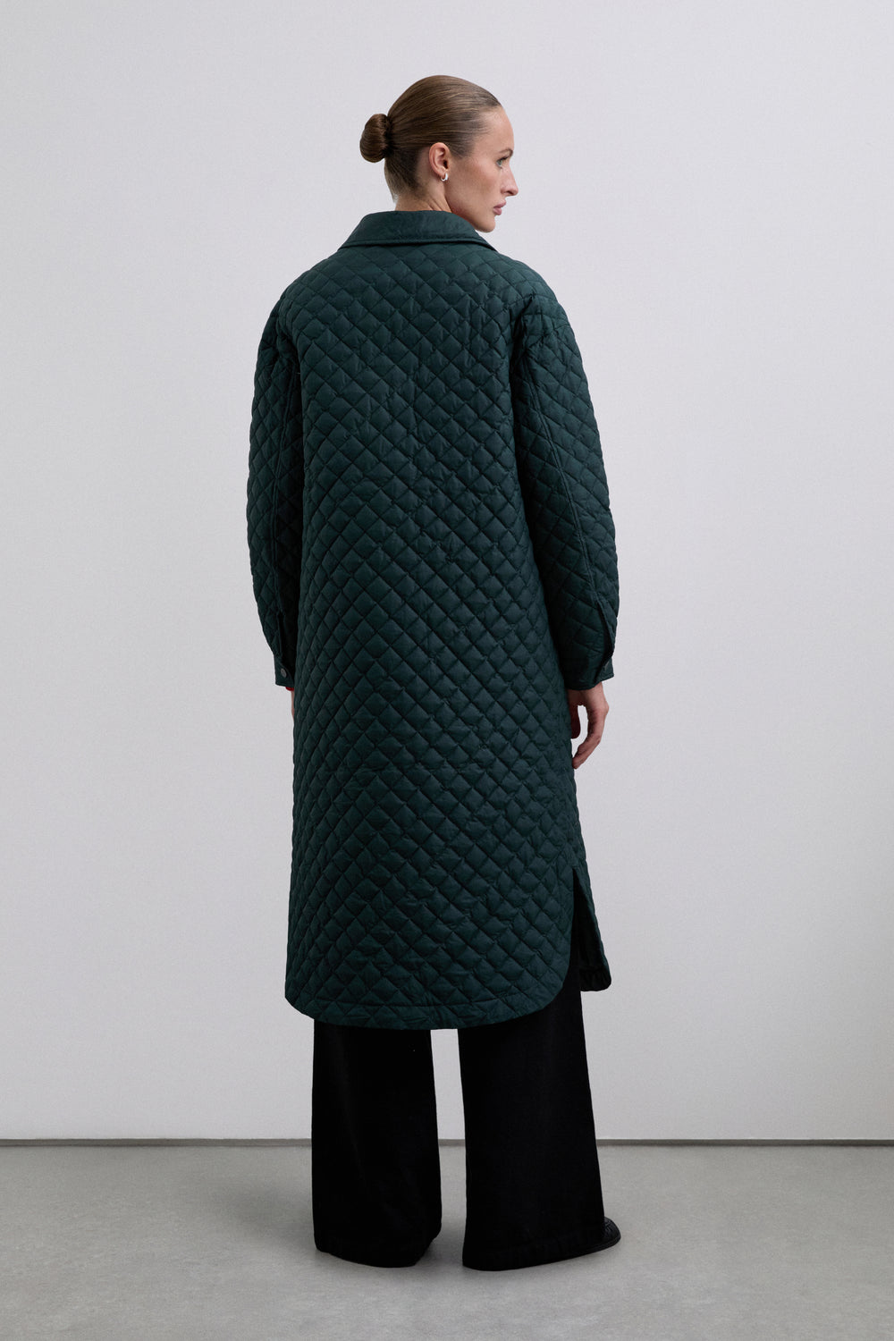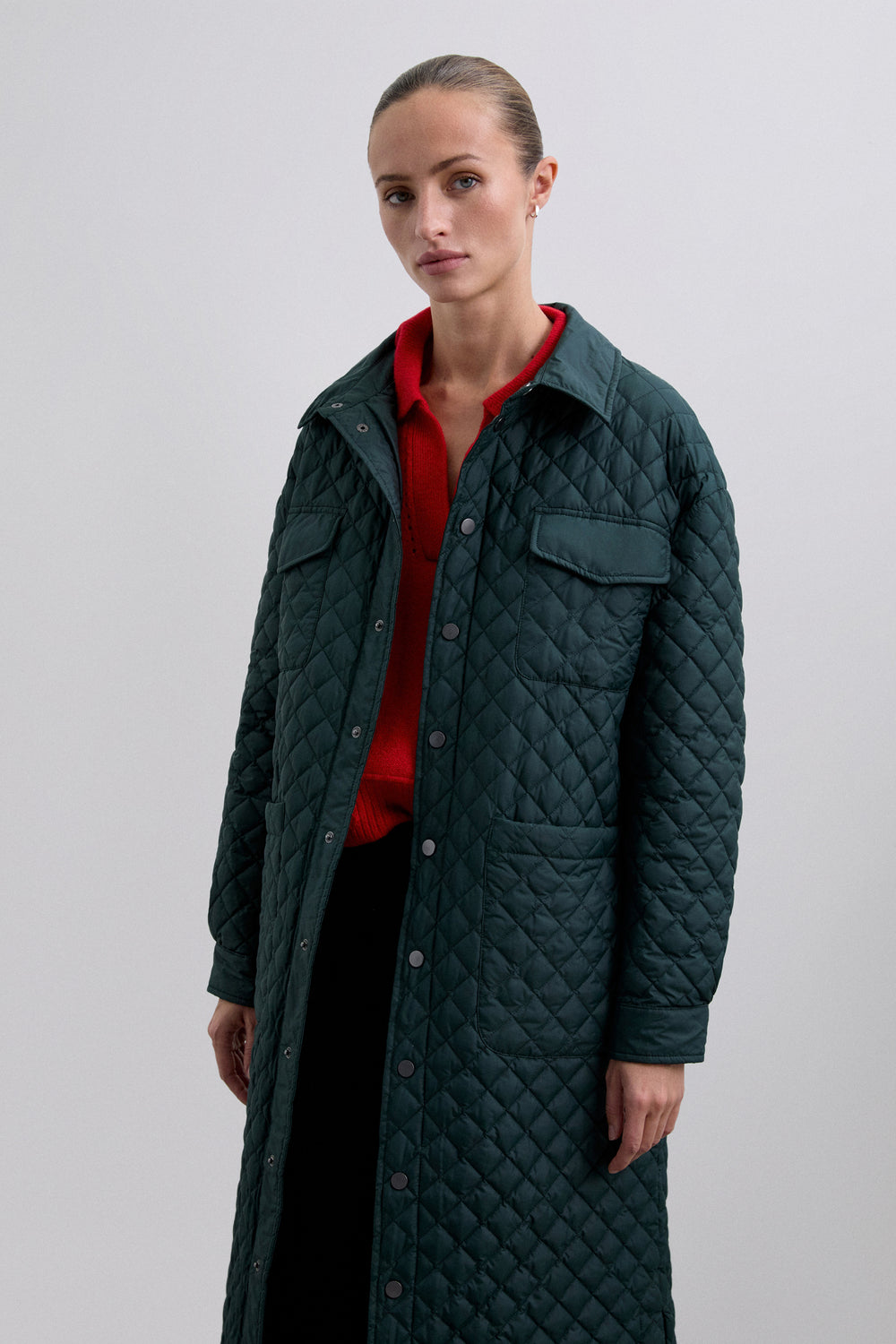 Abrigo largo acolchado tipo puffer impermeable, con acolchado en forma de rombos pequeña. Manga larga. Cuello alto desmontable. Cuatro bolsillos frontales, dos inferiores y dos superiores con tapeta.