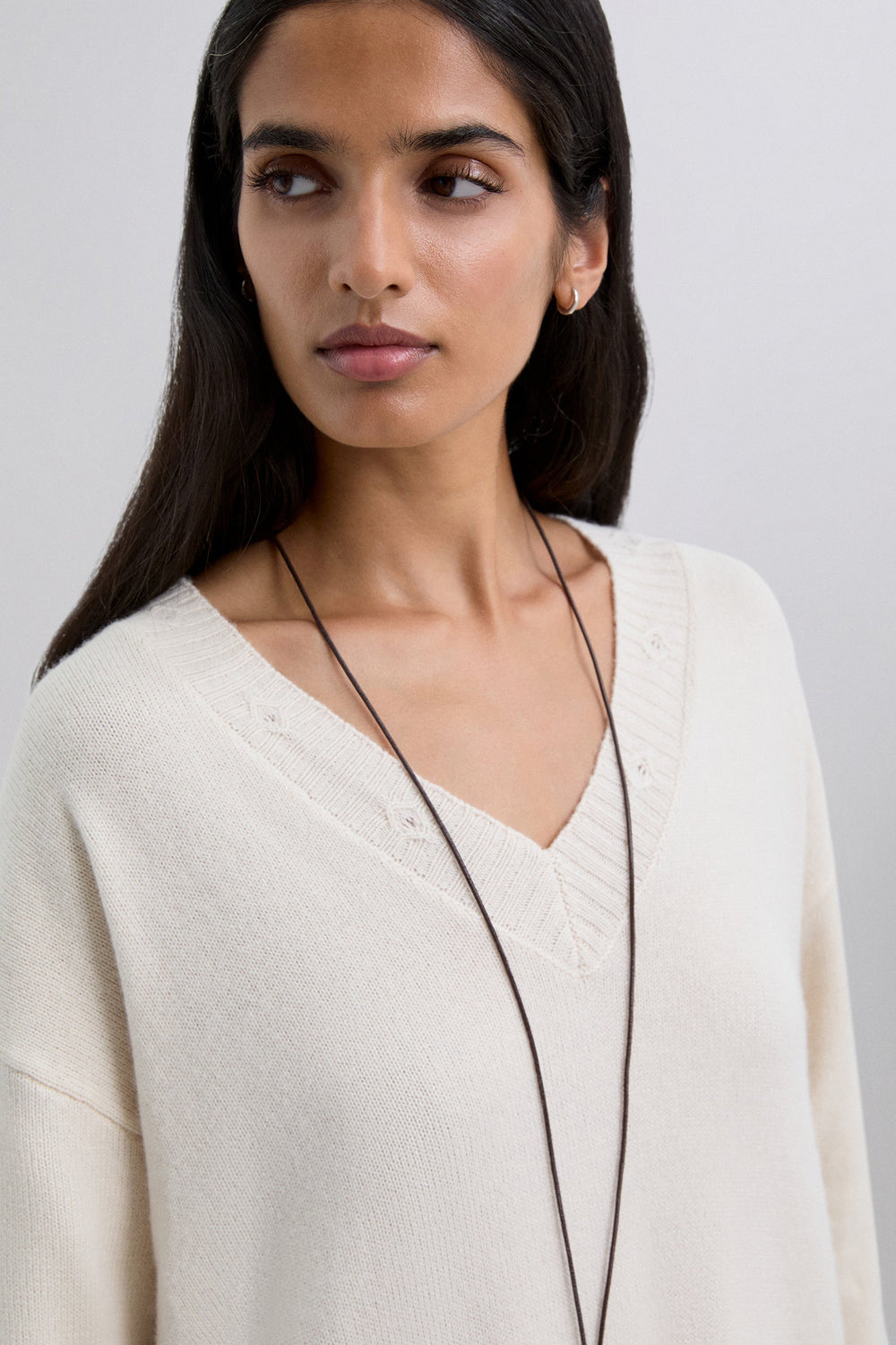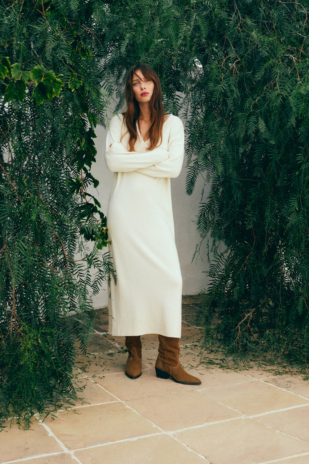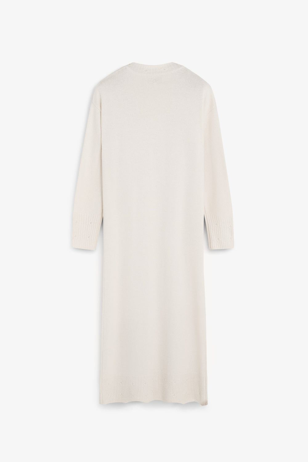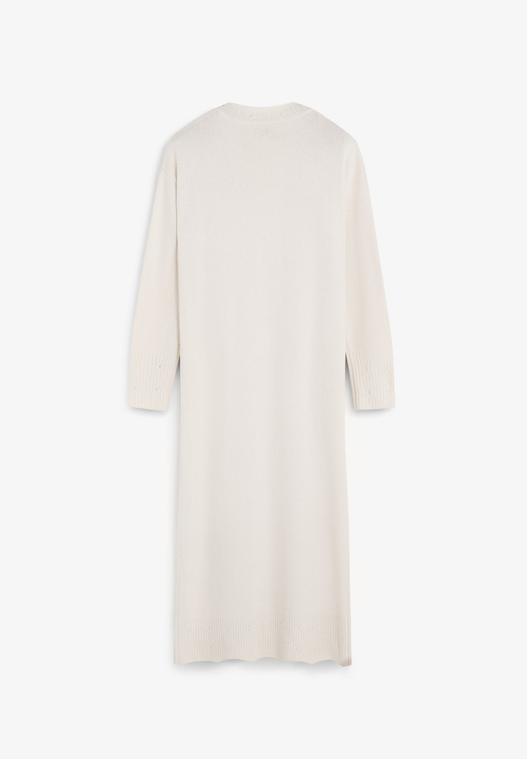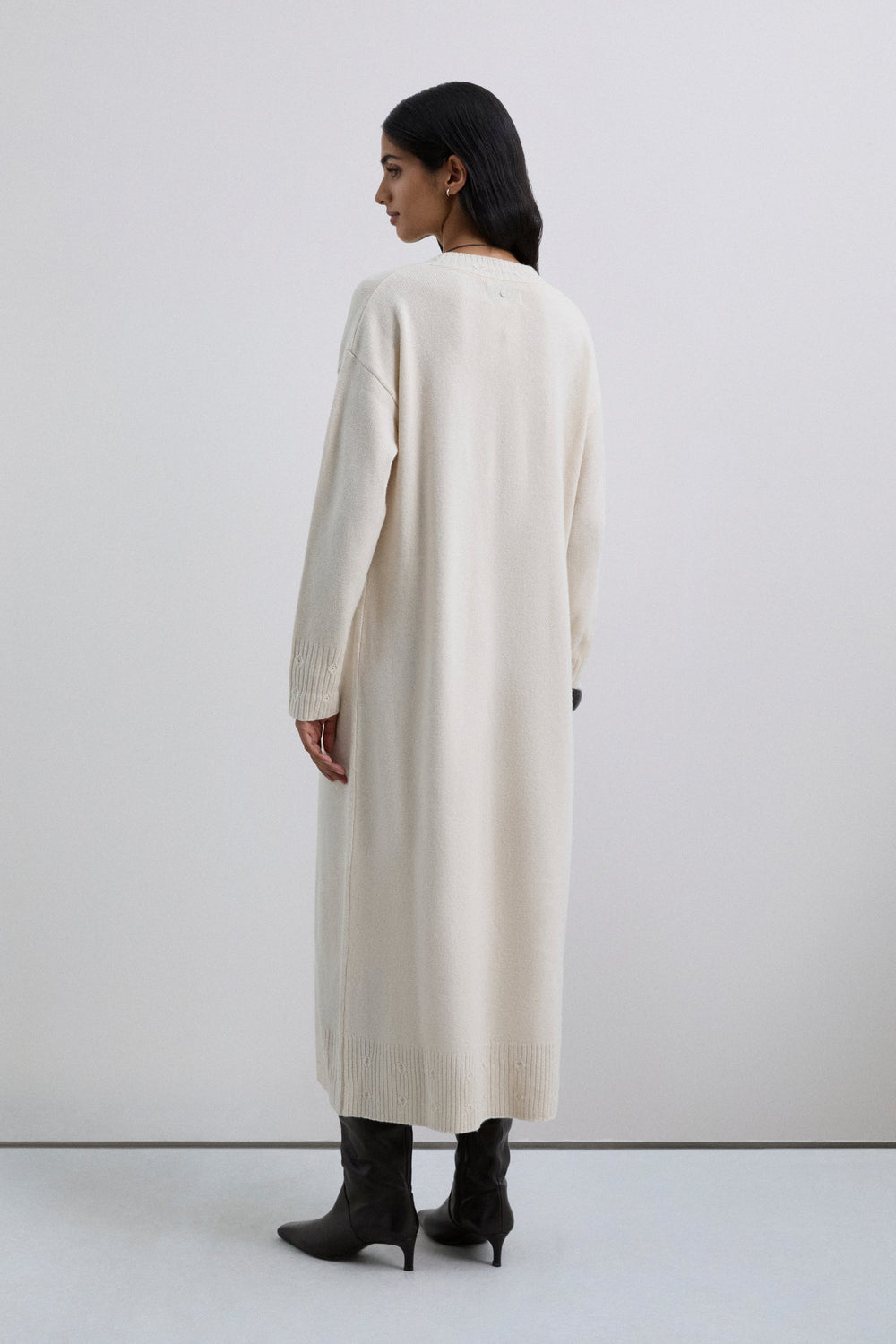 Vestido holgado confeccionado en mezcla de lana y viscosa. Largo midi y escote en V. Manga larga. Acabado en rib en escote, puños y bajo con detalles de aberturas circulares.