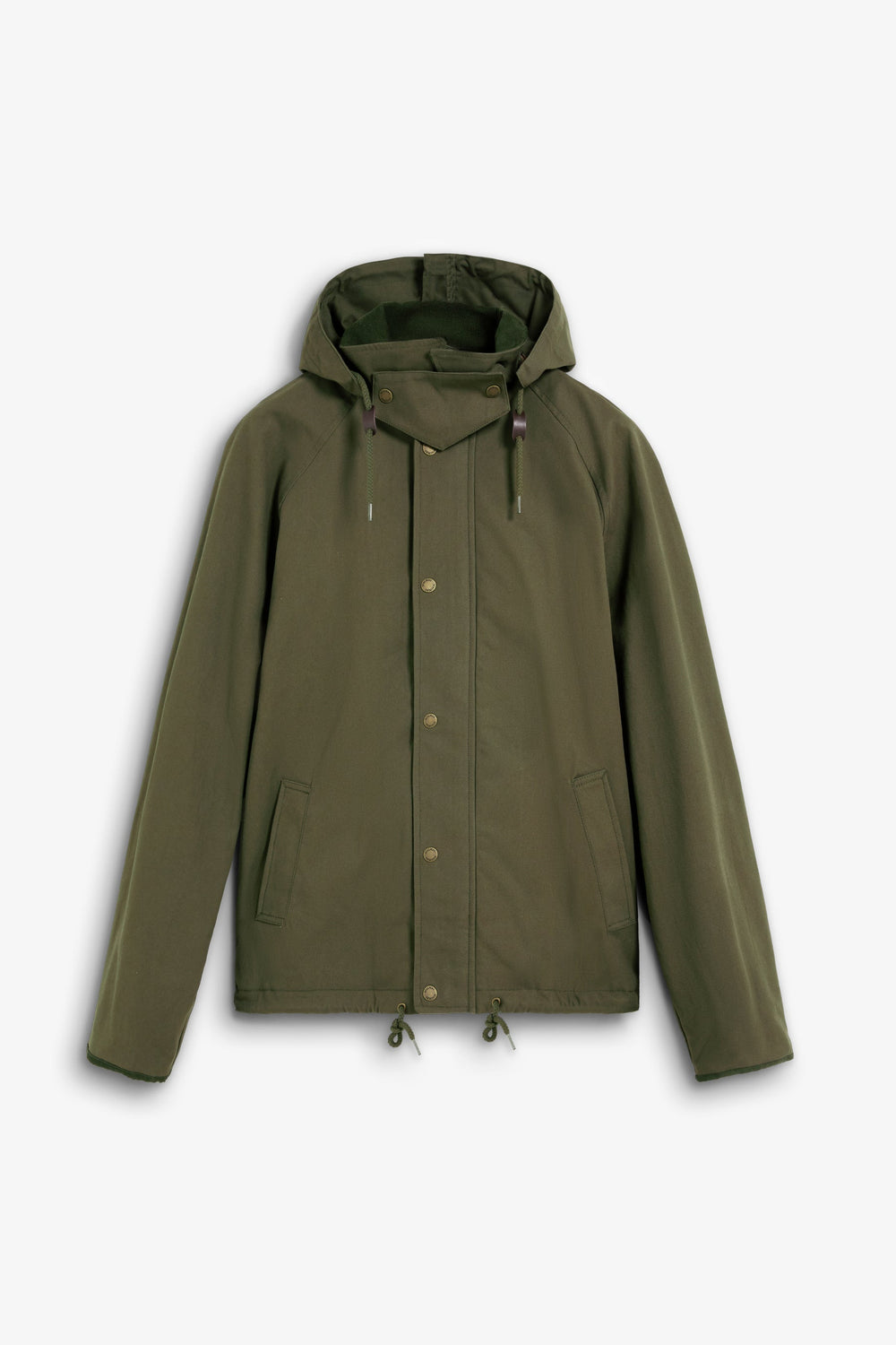 Chaqueta confeccionada en 100% Algodón BCI. Capucha ajustable y desmontable. Cierre con cremallera y botones. Puños interiores de canalé. El vivo de la manga y el cuello están confeccionados en pana. Mangas raglán. Dos bolsillos delanteros. Detalles logotipo en cremallera.