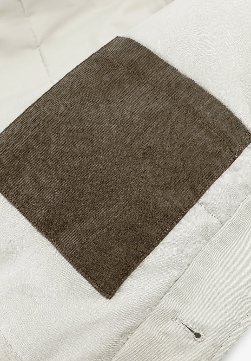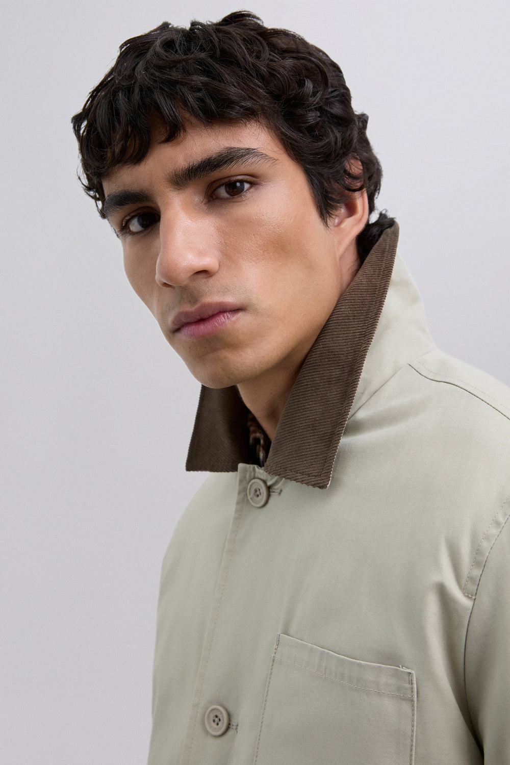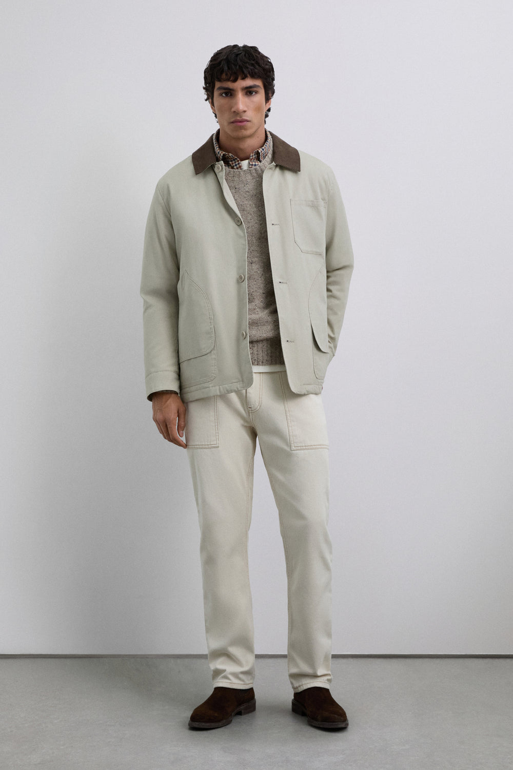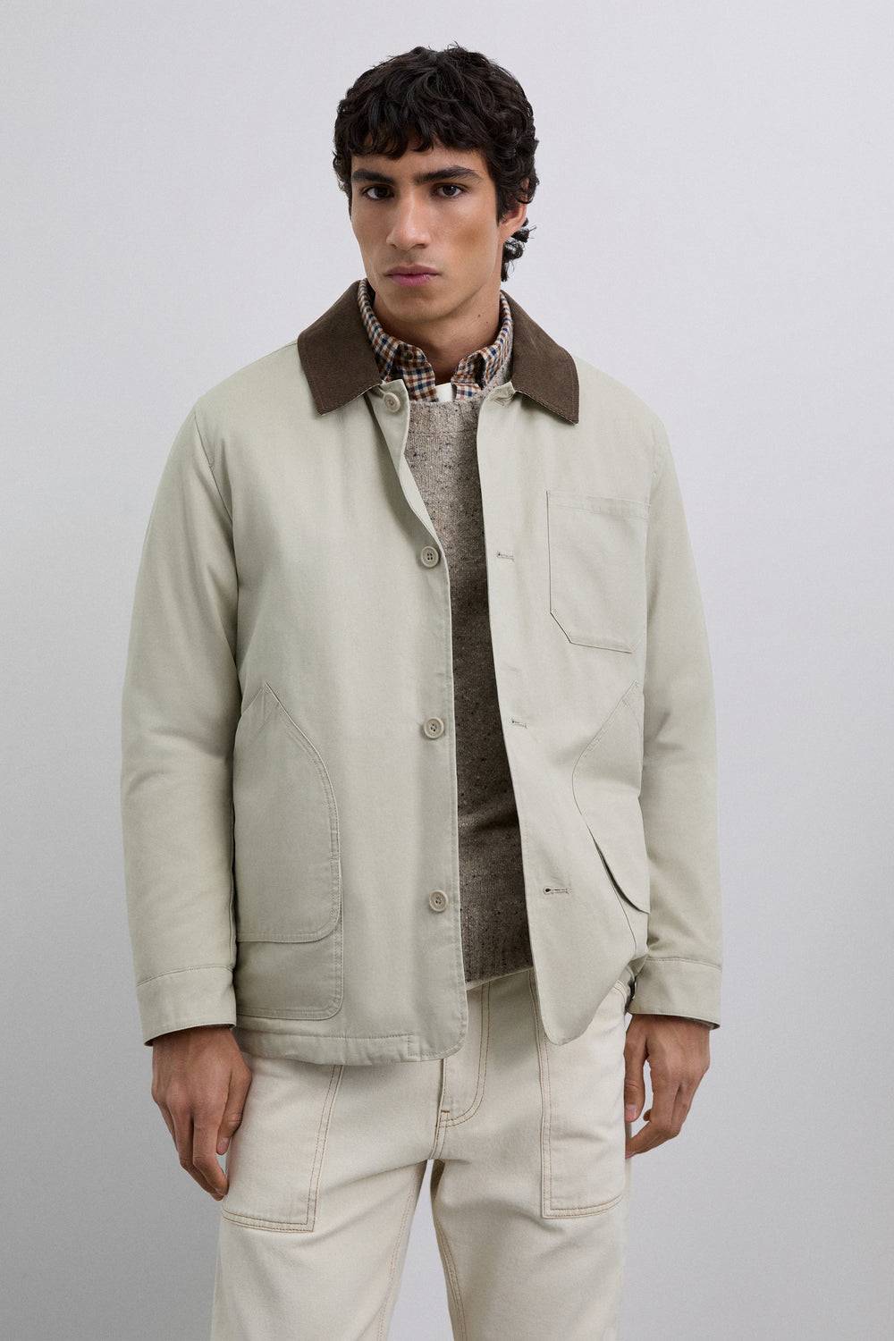 Chaqueta confeccionada en 100% algodón. Cuello de pana a contraste. Cierre mediante abotonadura. Bolsillo de parche en el pecho y dos laterales con aberturas inclinadas. Manga larga. Puños con cierre mediante botón.